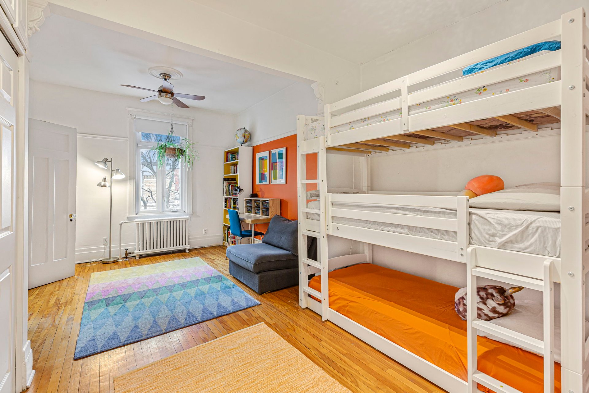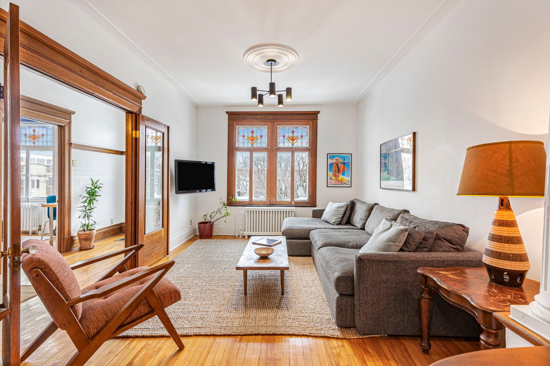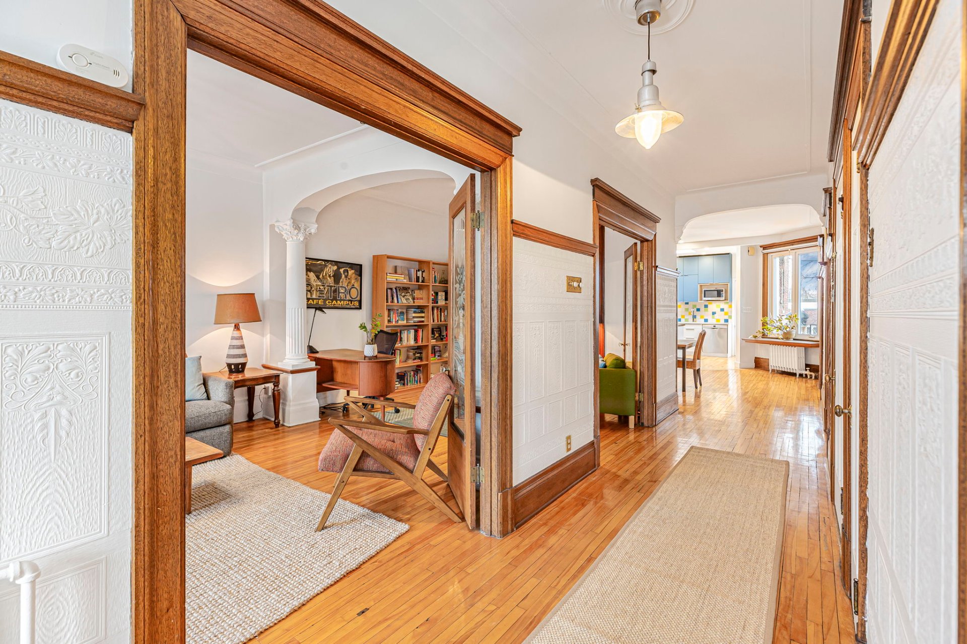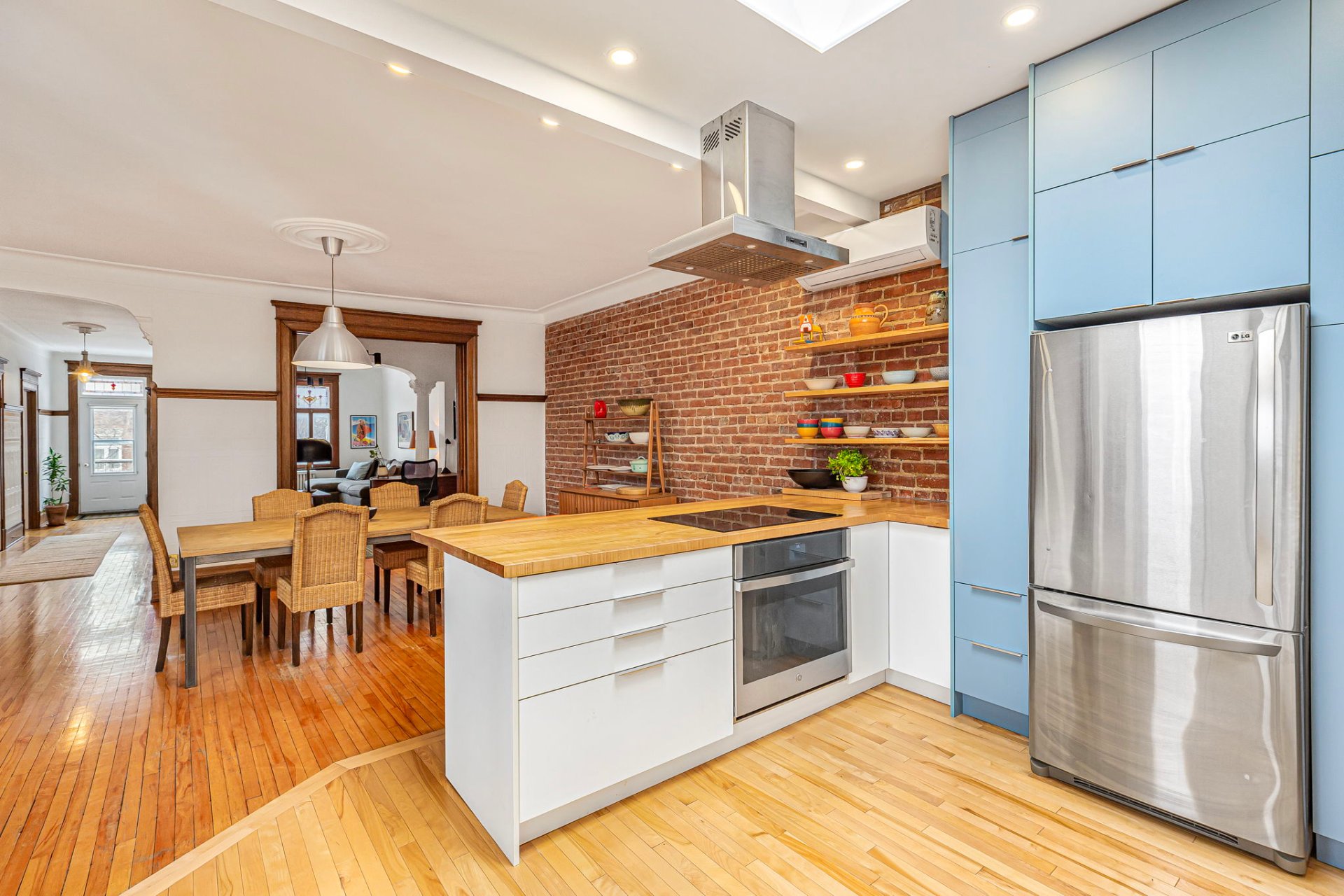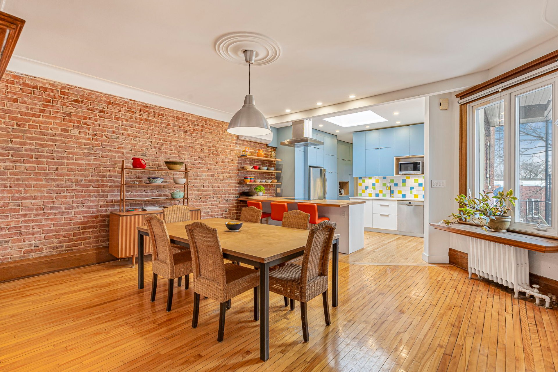 POINTS FORTS DU CONDO-Salon accueillant mis en valeur par les boiseries d'origine, les ouvertures arquées, le mur de briques exposées et des plafonds de 9'2"-Spacieuse salle à manger idéale pour recevoir, en continuité avec la cuisine, avec de superbes portes en verre gravé entre le salon et la salle à manger-Cuisine avec comptoirs et étagères sur mesure en érable rouge, dosseret Vietri sul Mare, four GE, plaque à induction Bosch et lave-vaisselle Bosch-Salle d'eau discrète -Chauffage central pour l'ensemble des unités, inclus dans les frais de copropriété-Droit exclusif de construire une terrasse sur le toit