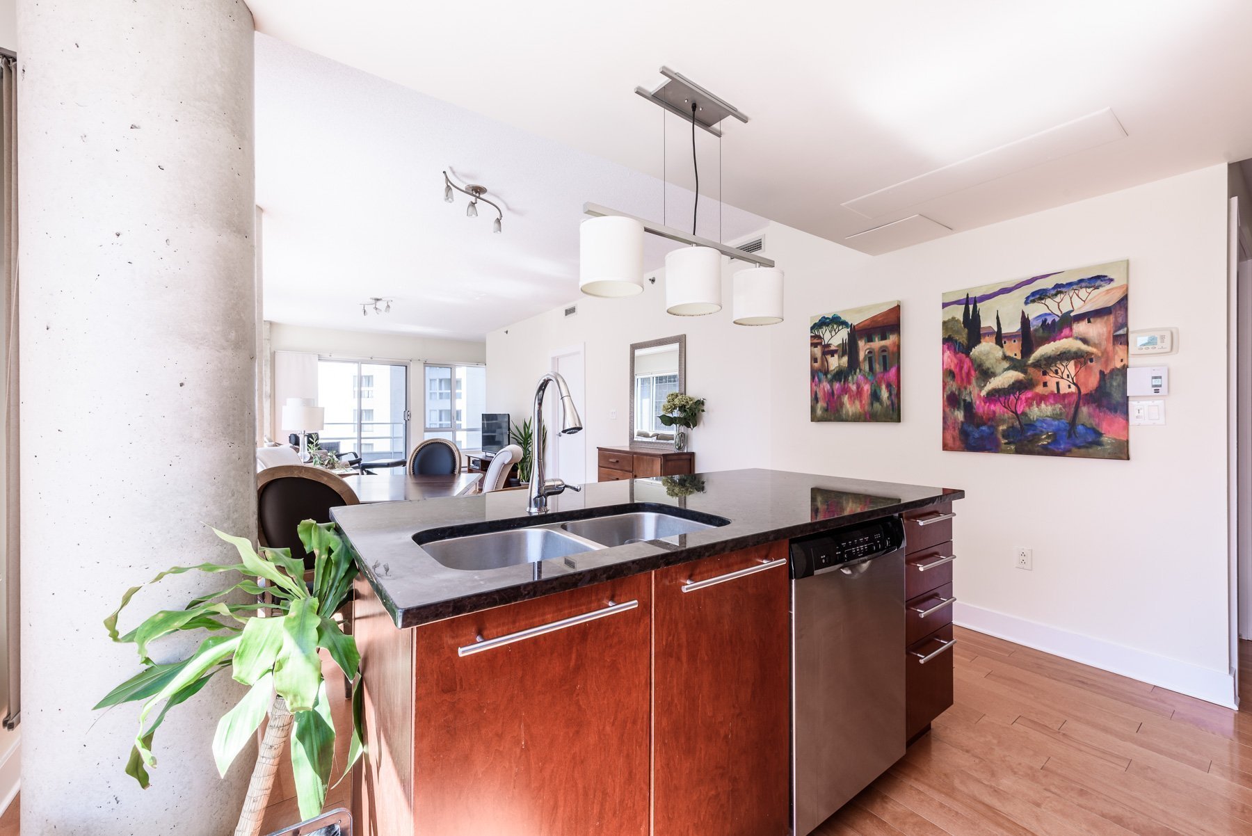 > POINTS FORTS DU CONDO :- Aire de vie ouverte avec vues spectaculaires sur la ville.- Cuisine moderne avec grand îlot, électroménagers haut de gamme et comptoir-repas pour trois personnes.- Deux chambres, chacune avec salle de bain attenante -- dont une avec douche séparée.- Planchers de bois et plafonds de 9 pieds à travers l'unité.- Garage intérieur privé (#P57) et espace de rangement (R-413).- Accès au gym et service de conciergerie 24h/24.