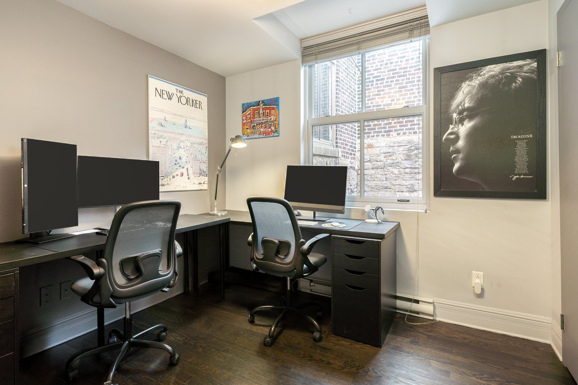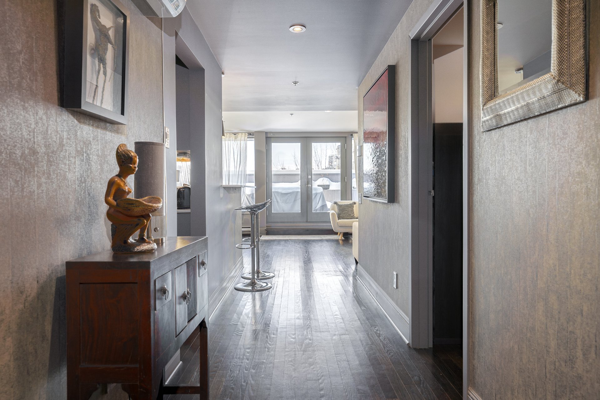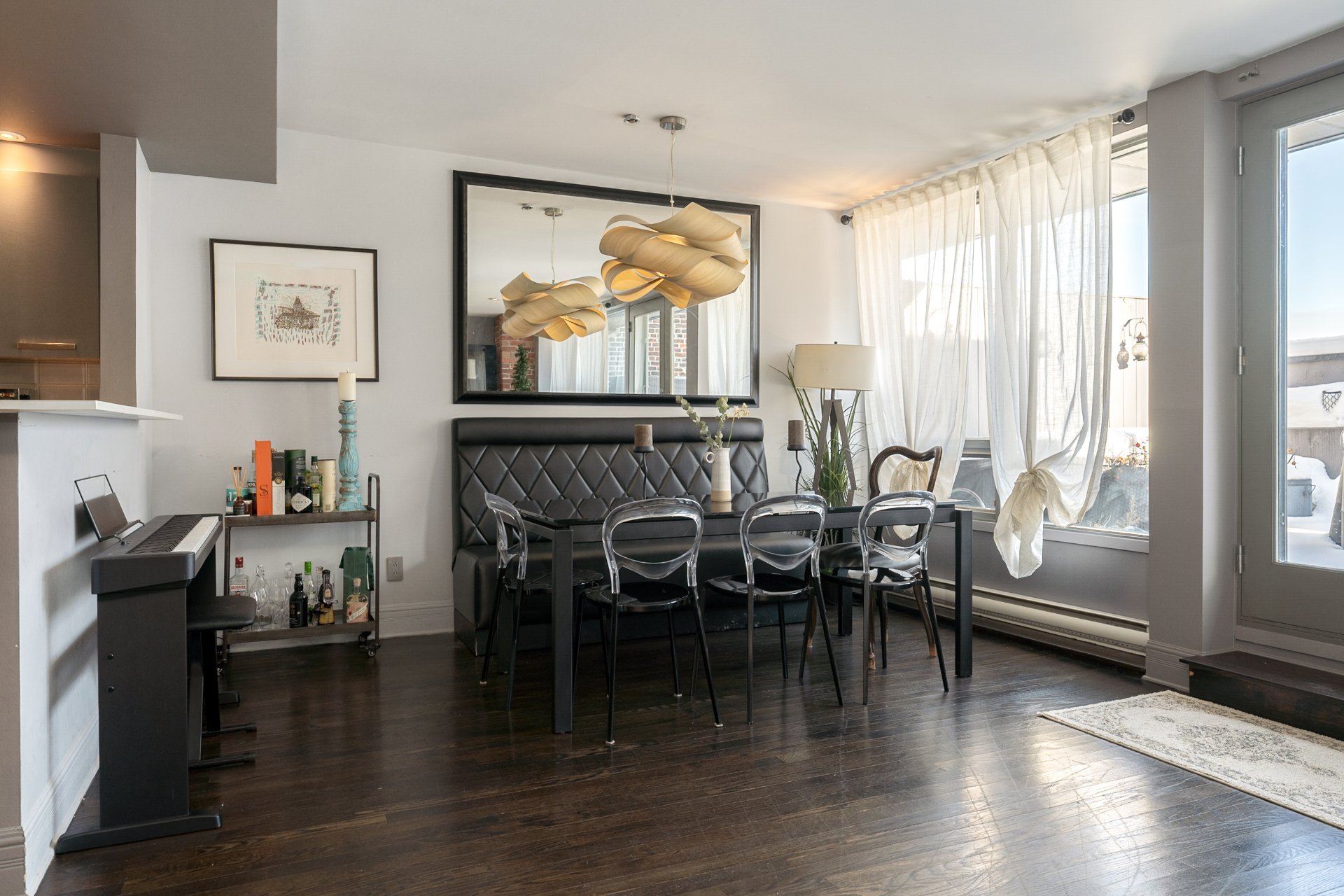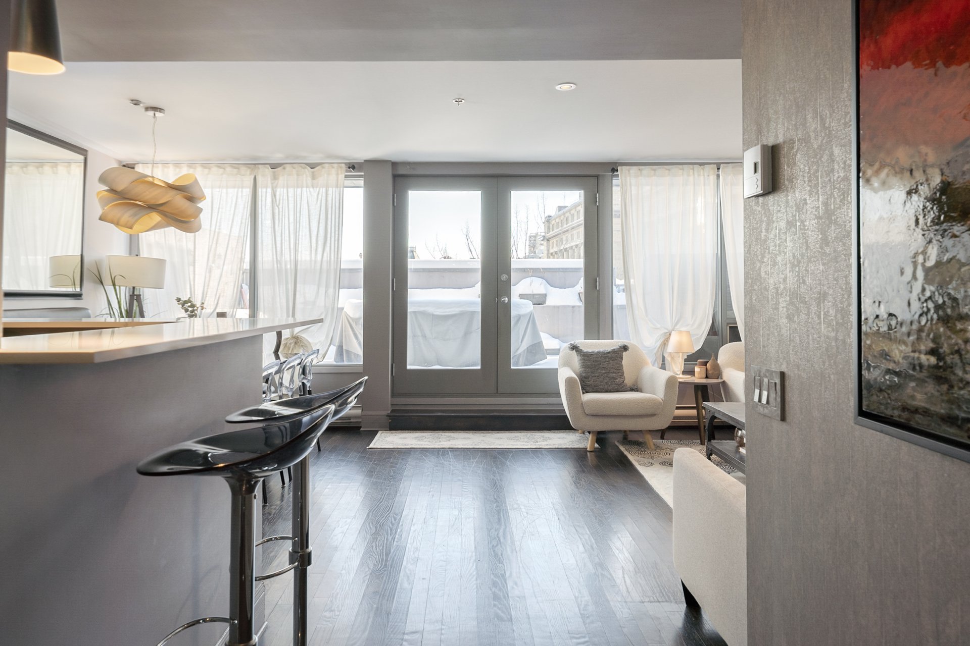 -Terrasse privée exceptionnelle: Espace extérieur rare et surdimensionné avec vues dégagées sur le Vieux-Montréal, offrant amplement d'espace pour aménager coin repas, détente et réception, véritable extension de l'aire de vie.