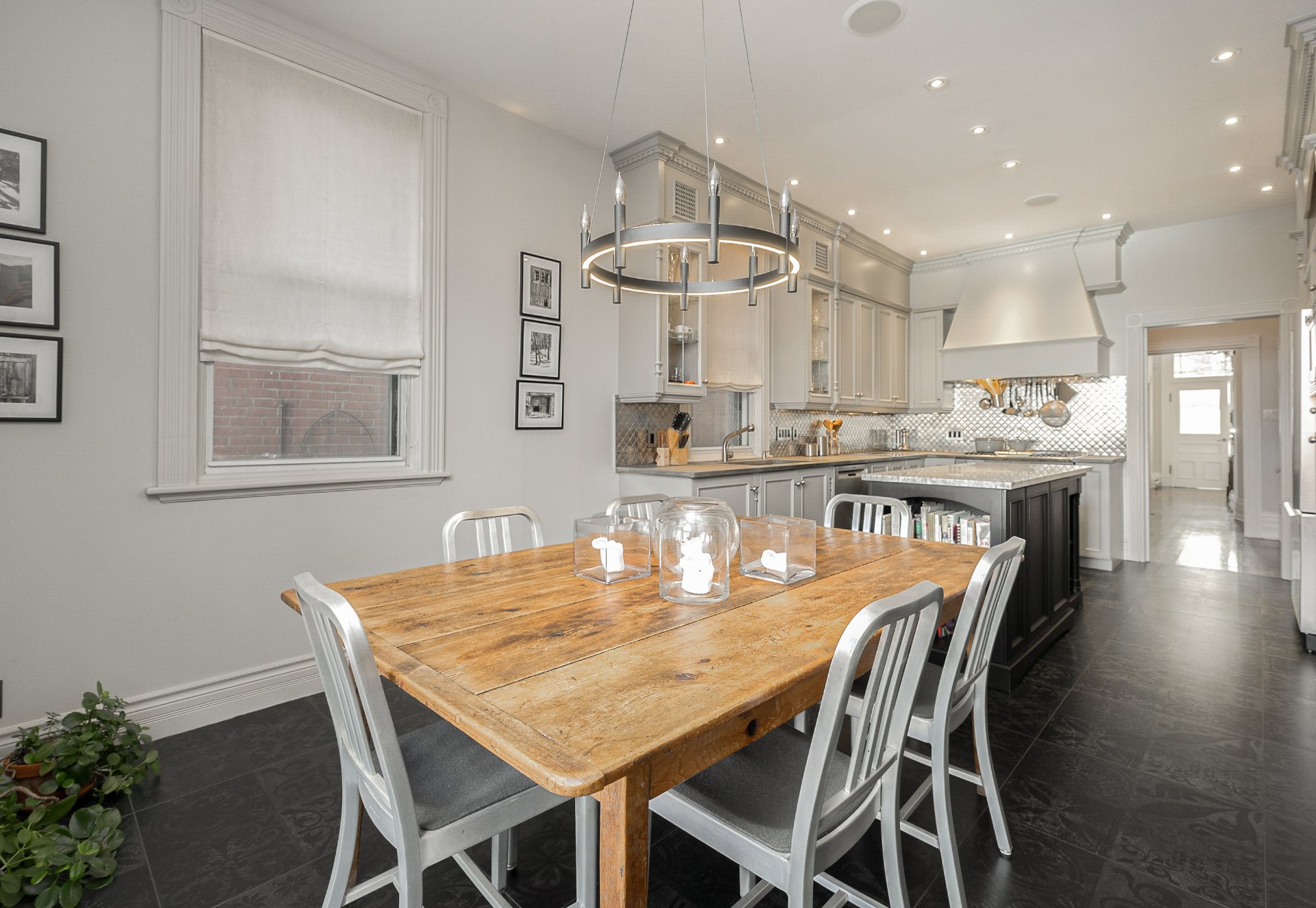 RDC-Hall d'entrée formel avec plafonds de 10 pieds & superbe boiseries -Salon avec foyer en marbre, grandes fenêtres, moulures détaillées & éclairage encastré-Grande salle à manger mise en valeur par un imposte en bois préservée & des colonnes décoratives-Cuisine rénovée avec long îlot en marbre, armoires pleine hauteur, dosseret en arabesque & haut-parleurs intégrés au plafond-Coin repas avec accès à la terrasse-Salle d'eau