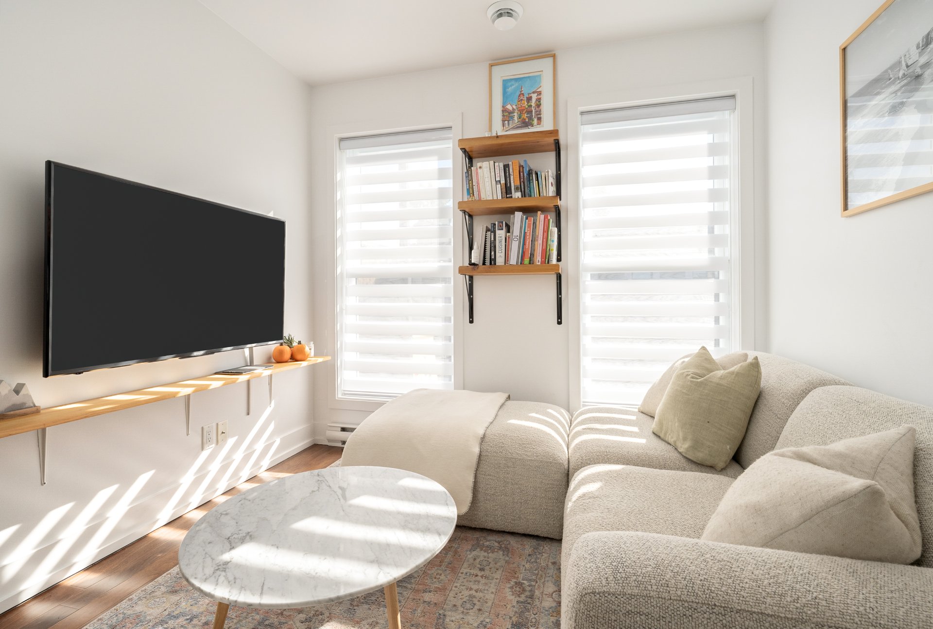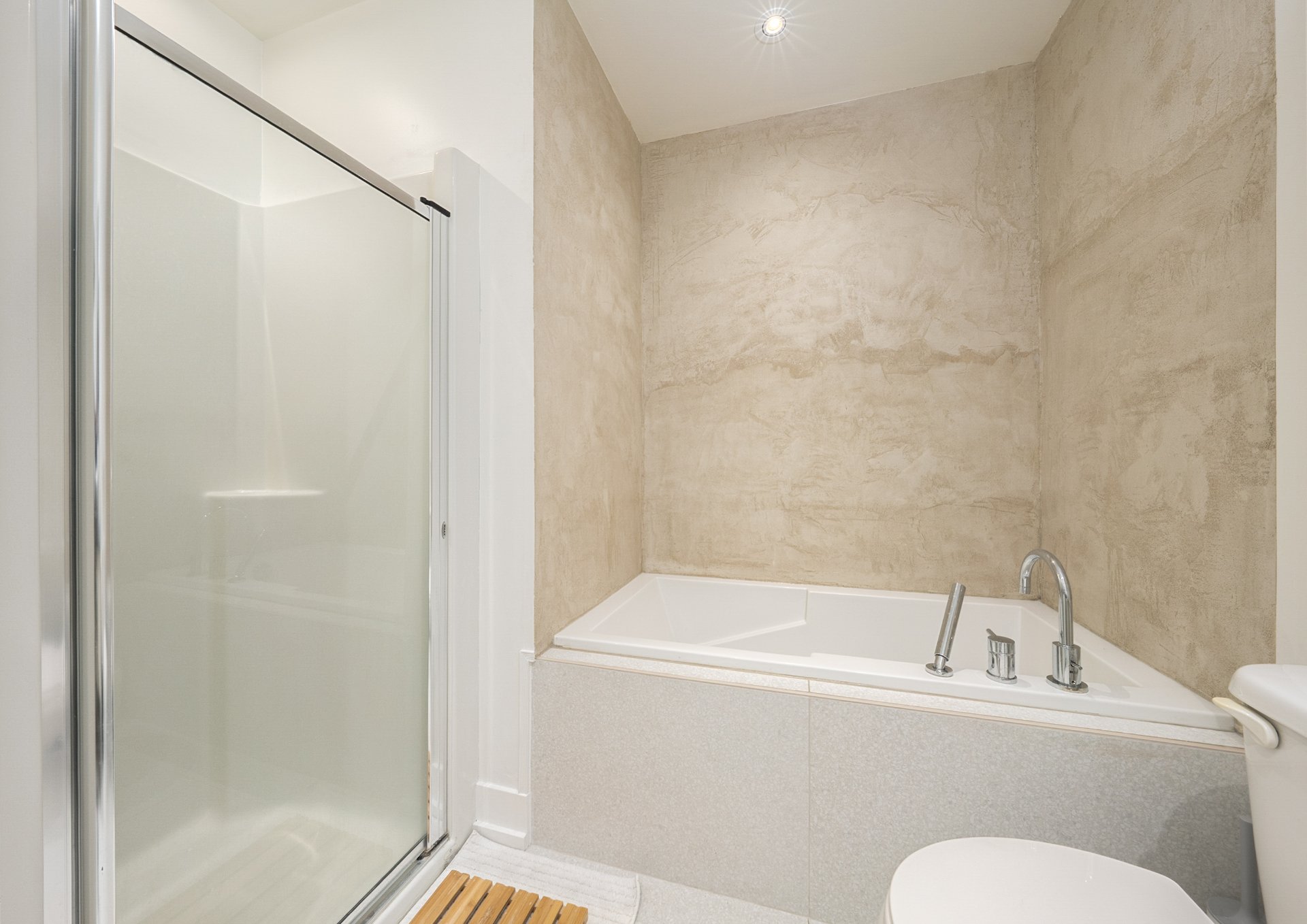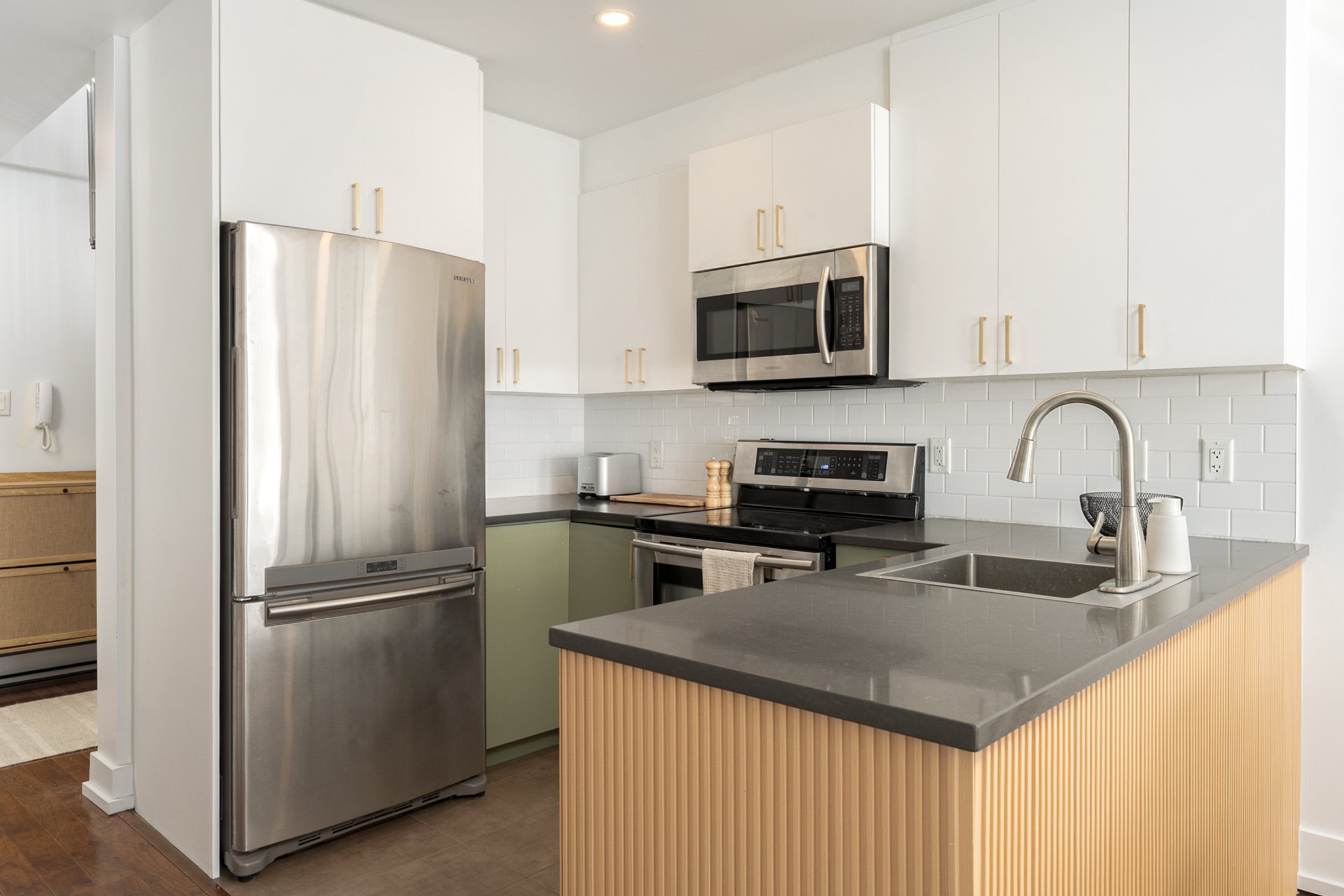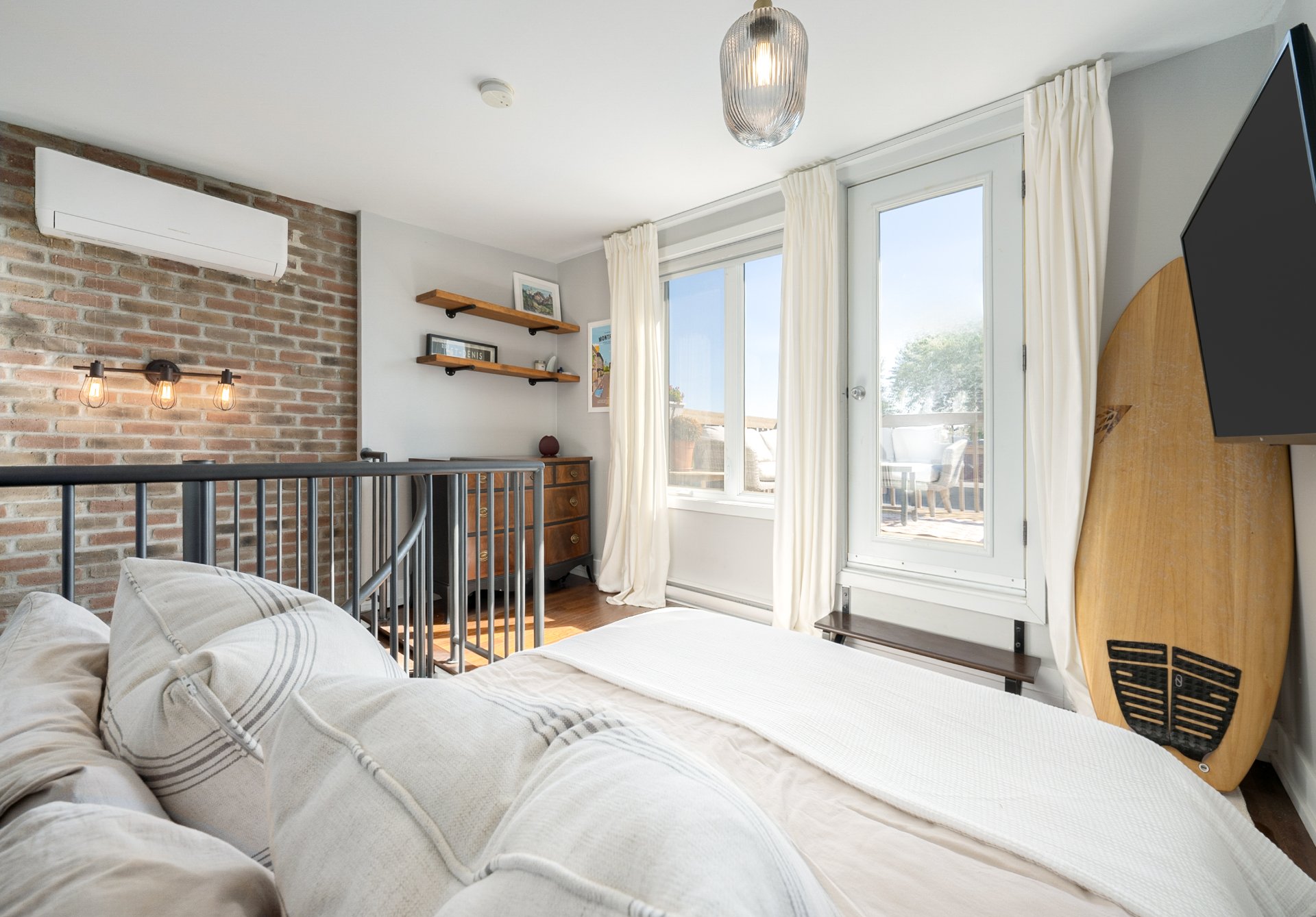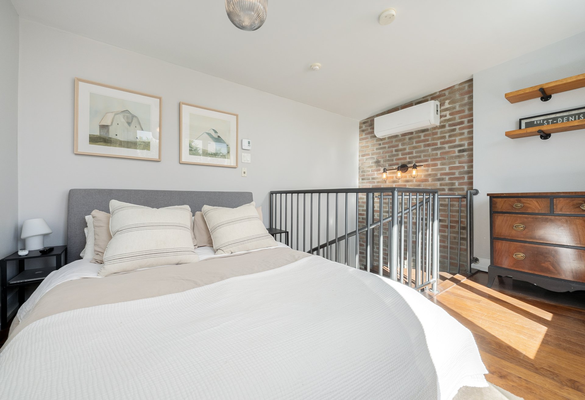Faits saillants des rénovations (2020 -- 2024)-Entièrement repeint (murs, plafonds, moulures)-Éclairage encastré moderne installé à travers l'unité-Cuisine modernisée: nouvelles portes, îlot à panneaux cannelés, armoires enveloppées, nouvelle robinetterie-Salle de bain actualisée : murs en micro-béton, nouvelle céramique, vanité repeinte-Installé nouvel appareil de climatisation-Terrasse sur le toit restaurée et traitée pour plus de durabilité et d'entretien facile-Stores sur mesure et nouvelles tringles (étage et mezzanine)
