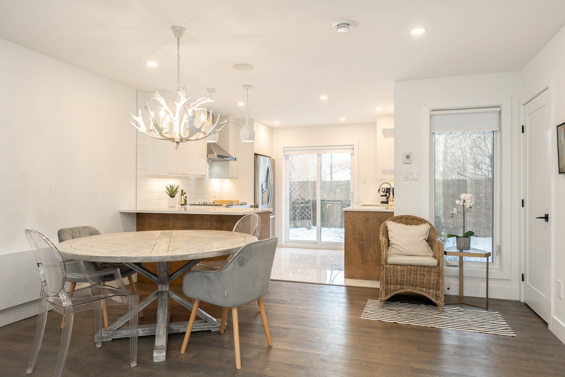 REZ-DE-CHAUSSÉE--Hall d'entrée accueillant avec garde-robe fermée et rangement pratique--Aire de vie salon et salle à manger à concept ouvert, idéale pour recevoir--Cuisine contemporaine avec planchers chauffants, nombreux rangements et accès direct au balcon arrière et à la cour clôturée--Salle d'eau discrète
