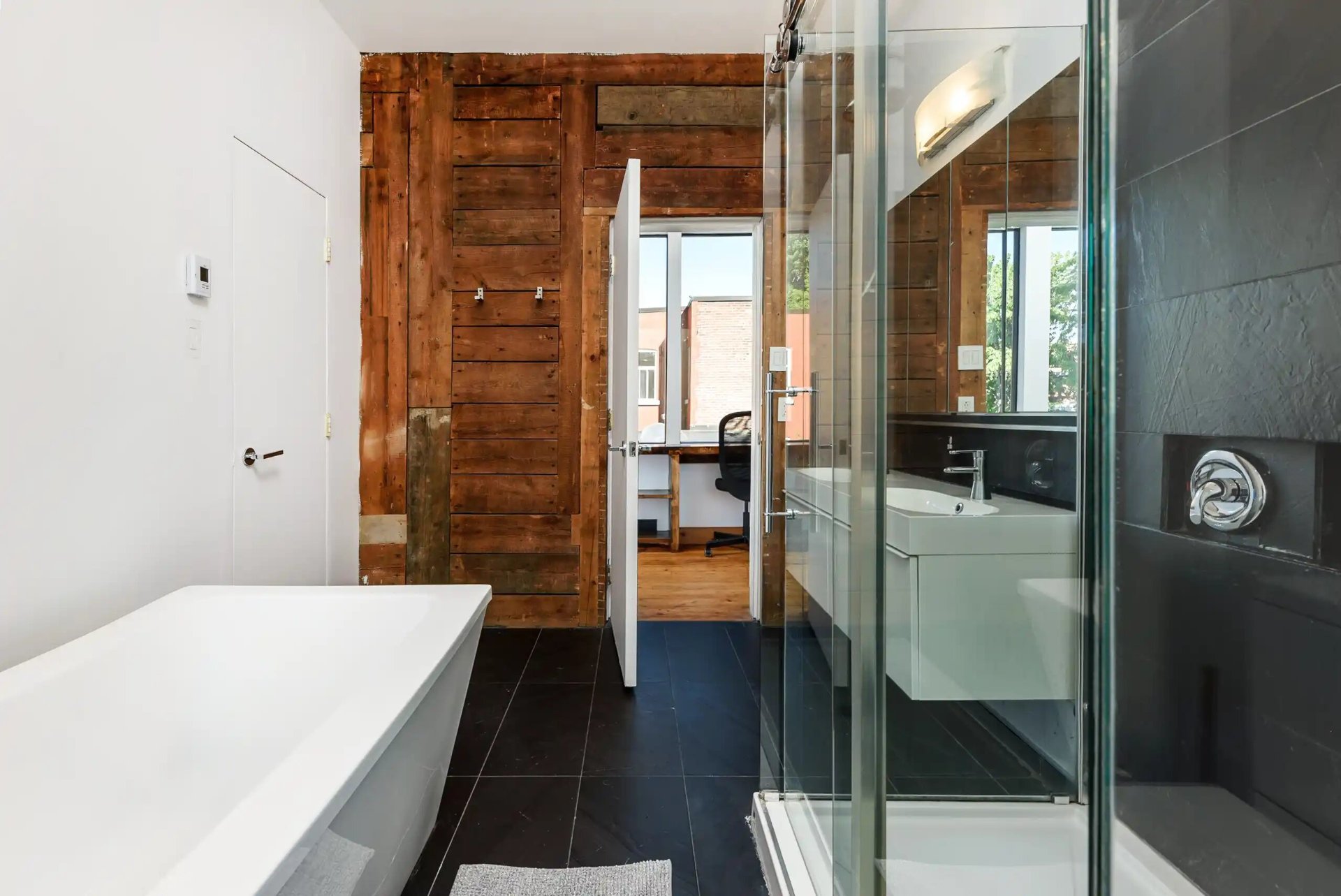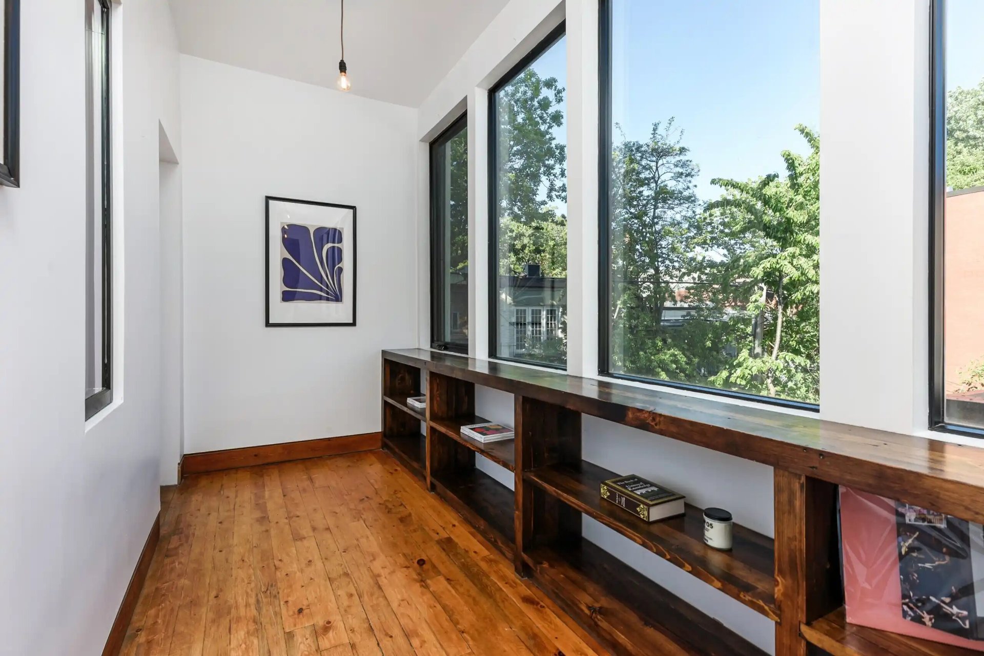-Intérieur plein de cachet : Poutres apparentes, planchers de bois franc et hauts plafonds créent une ambiance chaleureuse propre au Plateau.