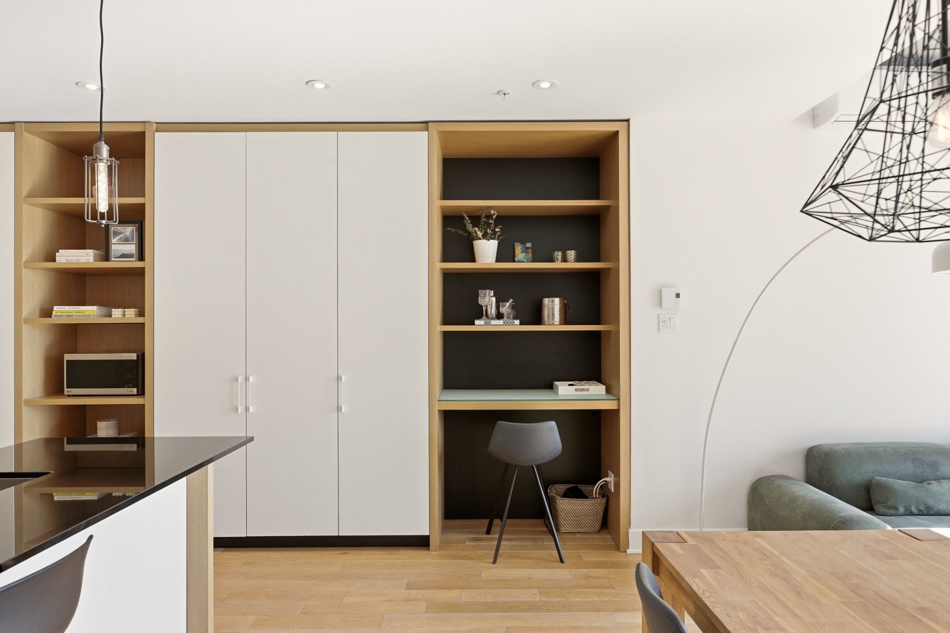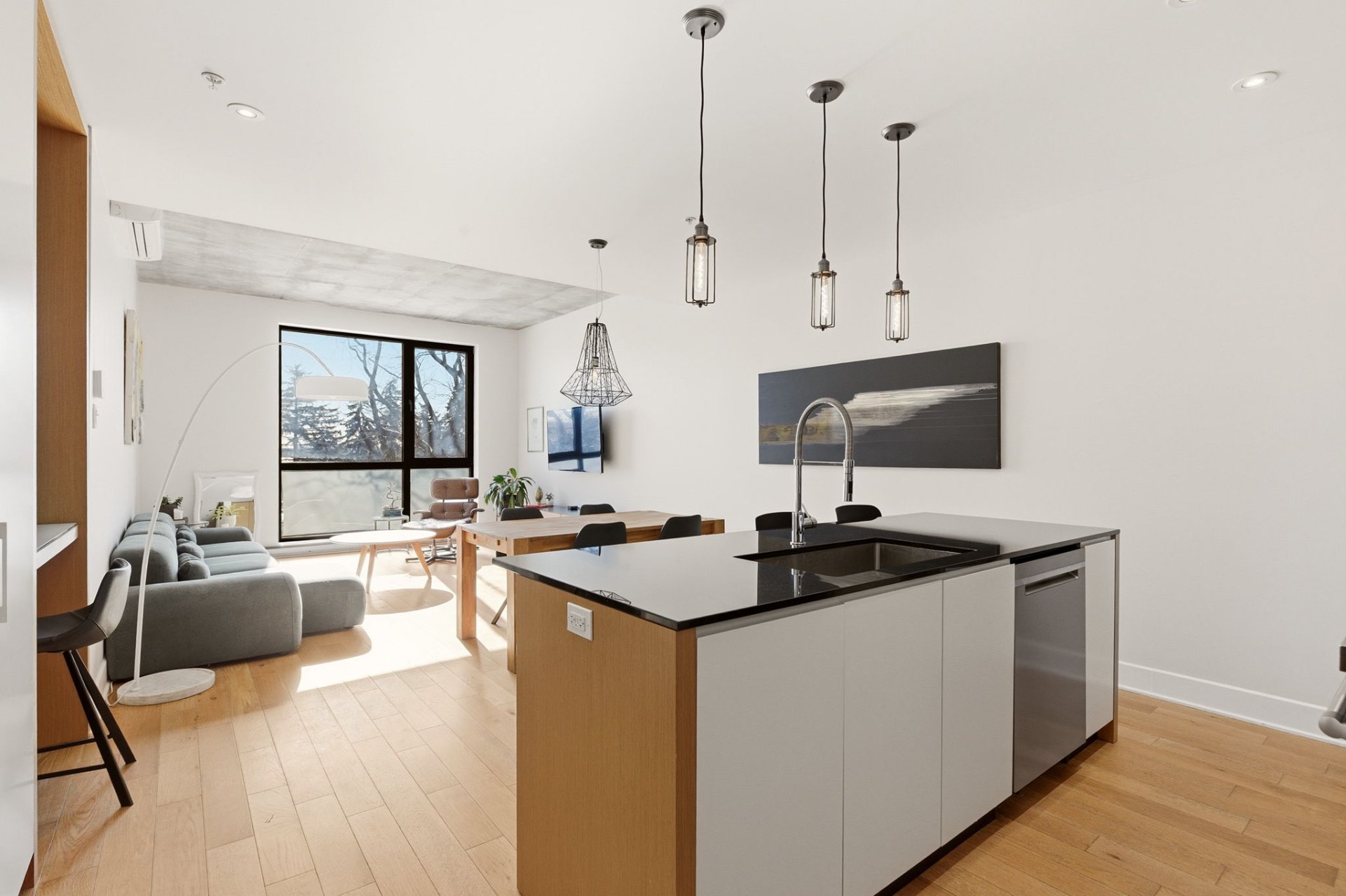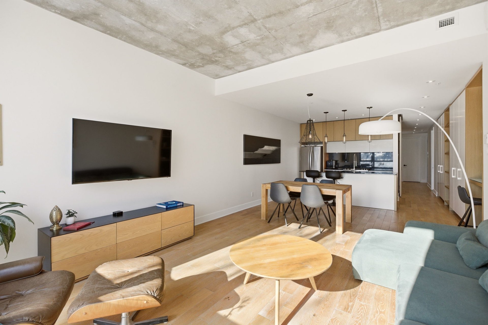 POINTS FORTS DU CONDO :-Aire de vie lumineuse à aire ouverte avec hauts plafonds, grandes fenêtres et excellente fluidité-Immeuble moderne avec construction de qualité et insonorisation supérieure; les propriétaires mentionnent ne jamais entendre les voisins-Cuisine élégante avec îlot central, cuisinière au gaz et beaucoup de rangement-Mobilier intégré sur mesure combinant rangement fermé, étagères ouvertes et espace bureau discret-Planchers de bois chaleureux dans les aires principales-Chambre principale spacieuse avec walk-in et salle de bain attenante-Deuxième chambre + espace bureau distinct, idéal pour le télétravail ou les invités-Deux salles de bains complètes aux finitions modernes-Unités murales de climatisation dans le salon et les chambres-Laveuse et sécheuse dans l'unité-Intimité accrue avec peu de murs mitoyens dans les aires de vie-Rangement inclus #201-1 espace de stationnement au garage avec borne de recharge électrique #201