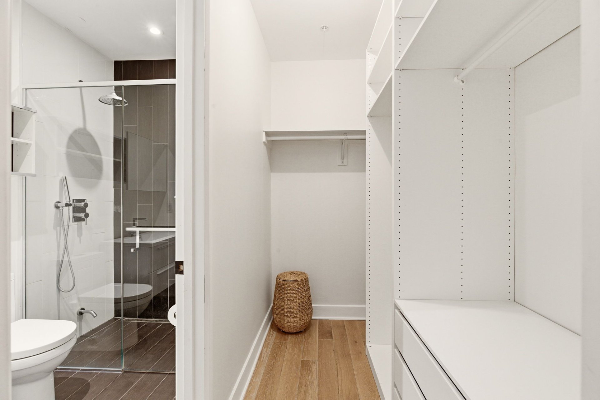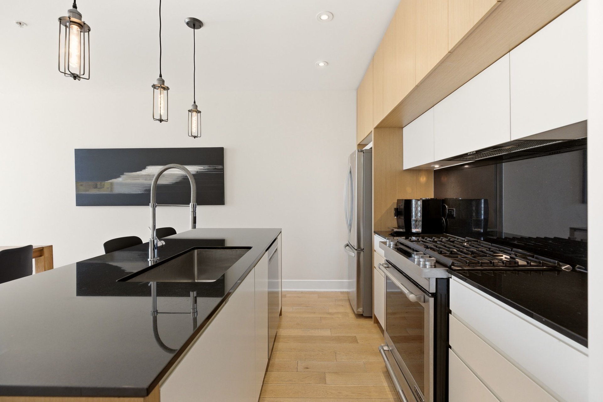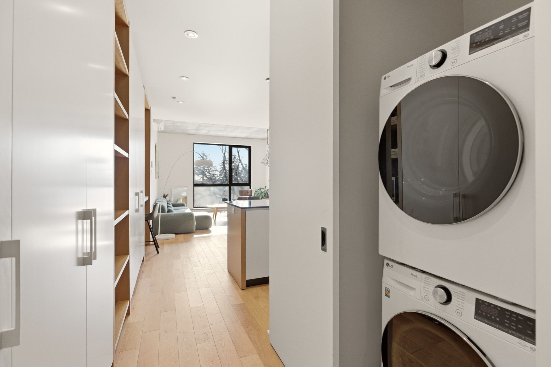 POINTS FORTS DU CONDO :-Aire de vie lumineuse à aire ouverte avec hauts plafonds, grandes fenêtres et excellente fluidité-Immeuble moderne avec construction de qualité et insonorisation supérieure; les propriétaires mentionnent ne jamais entendre les voisins-Cuisine élégante avec îlot central, cuisinière au gaz et beaucoup de rangement-Mobilier intégré sur mesure combinant rangement fermé, étagères ouvertes et espace bureau discret-Planchers de bois chaleureux dans les aires principales-Chambre principale spacieuse avec walk-in et salle de bain attenante-Deuxième chambre + espace bureau distinct, idéal pour le télétravail ou les invités-Deux salles de bains complètes aux finitions modernes-Unités murales de climatisation dans le salon et les chambres-Laveuse et sécheuse dans l'unité-Intimité accrue avec peu de murs mitoyens dans les aires de vie-Rangement inclus #201-1 espace de stationnement au garage avec borne de recharge électrique #201
