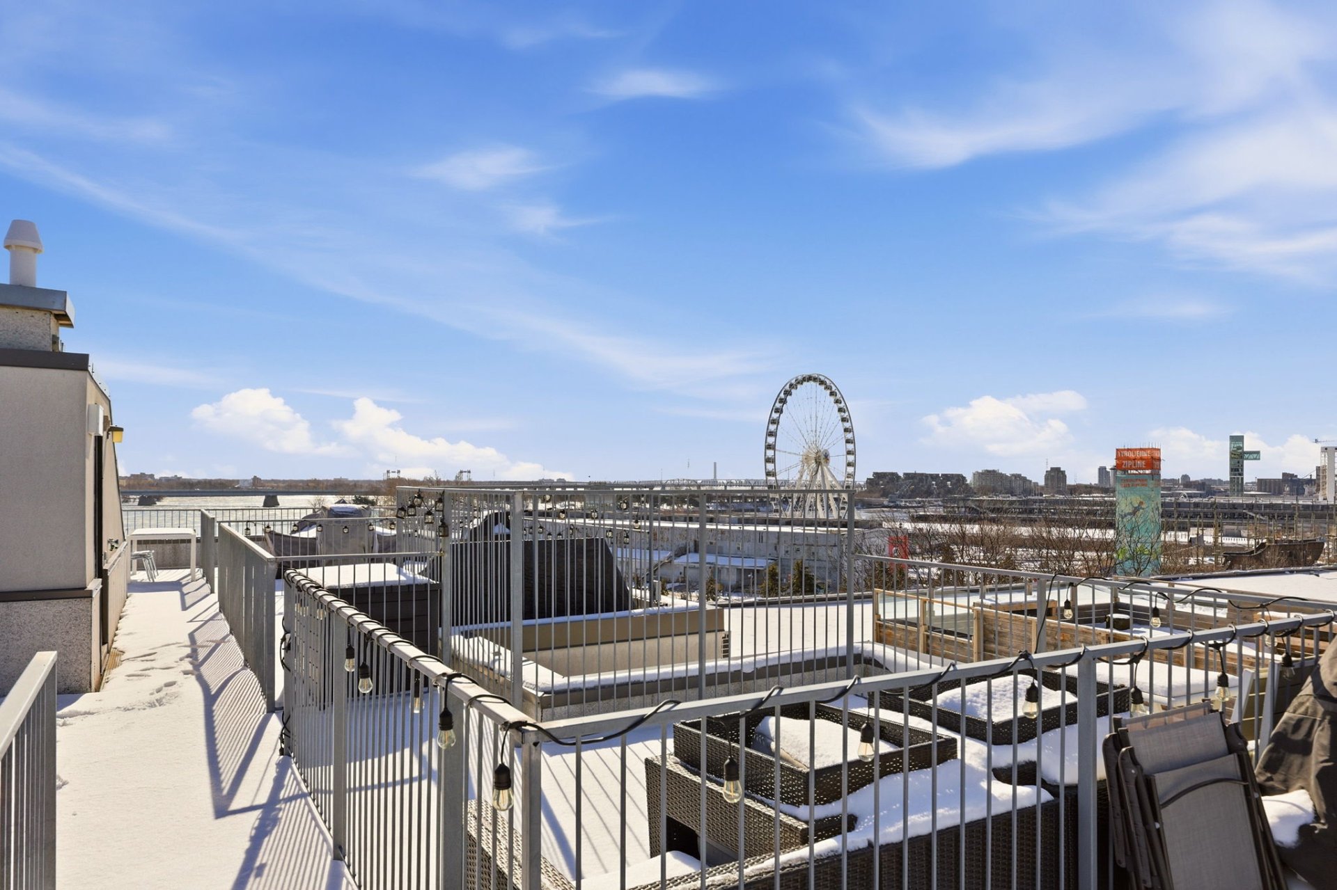 -Terrasse sur le toit avec vue panoramique: Espace extérieur privé idéal pour recevoir ou relaxer, offrant une vue dégagée sur l'eau, la marina, la grande roue du Vieux-Port, le pont Jacques-Cartier et le centre-ville de Montréal.