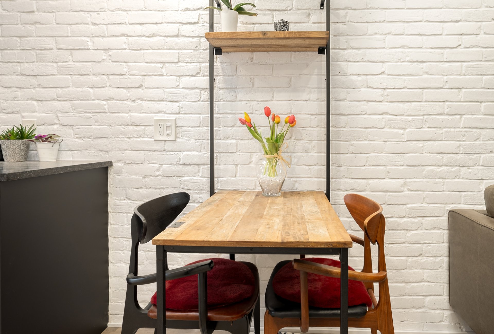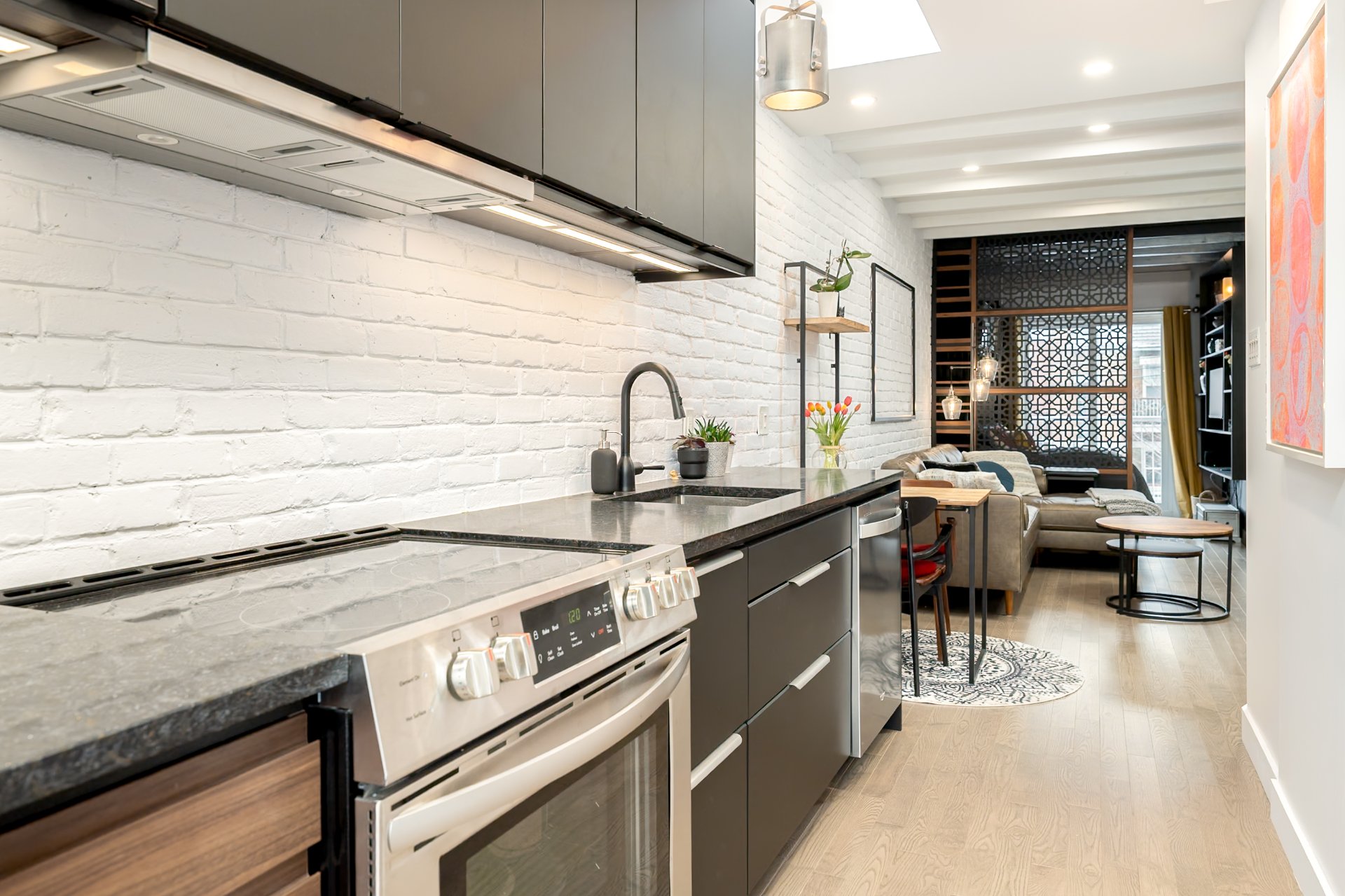 SECOND FLOOR-Private entrance into a bright living area with sectional-friendly layout, exposed brick, electric fireplace and built-in shelving.-Sleek galley kitchen with matte cabinetry, granite counters (kitchen + coffee zone), white brick backsplash, full appliances including dishwasher, cozy dinette and access to the spacious rear balcony.-Bedroom behind a decorative screen with wall-to-wall storage, tin-style feature wall and direct access to the sunny front balcony. A computer screen is set up here to create a second living/working zone; the room can be closed off using the black sliding curtain.-Renovated bathroom with tiled tub/shower, glass enclosure, modern vanity and heated floors.-Laundry nook with stacked washer/dryer, coffee corner and extra storage.