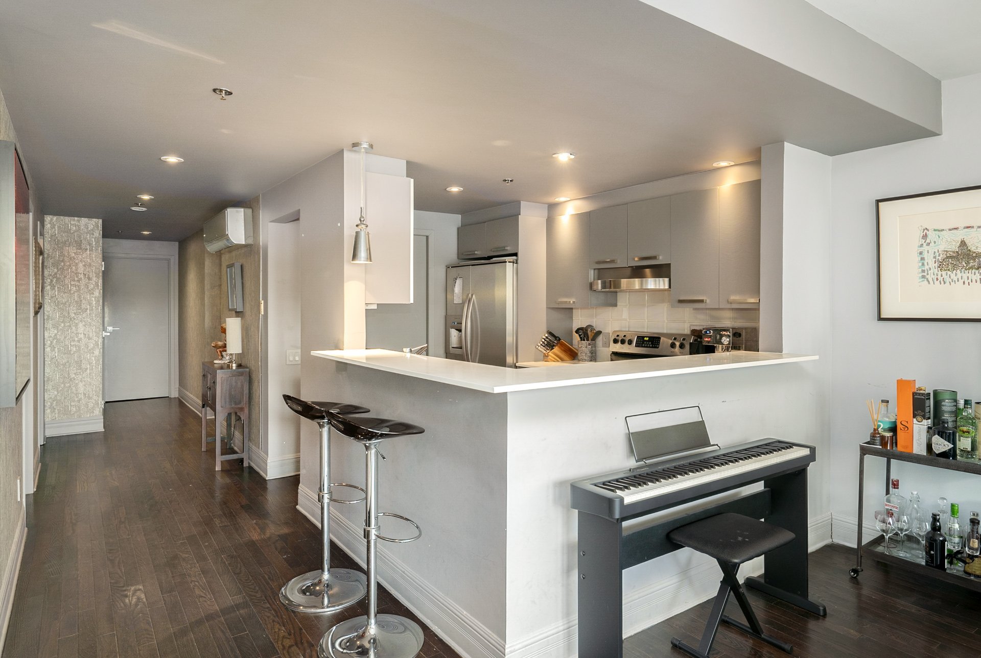 CONDO HIGHLIGHTS:-5th and top floor unit-Open-concept living and dining area with direct access to terrace-Kitchen with clean finishes, exposed brick detail and efficient layout-Primary bedroom with ensuite bathroom-Second bedroom and full second bathroom-In-unit laundry area-Wall-mounted A/C-Condo fees: 612.09$/month