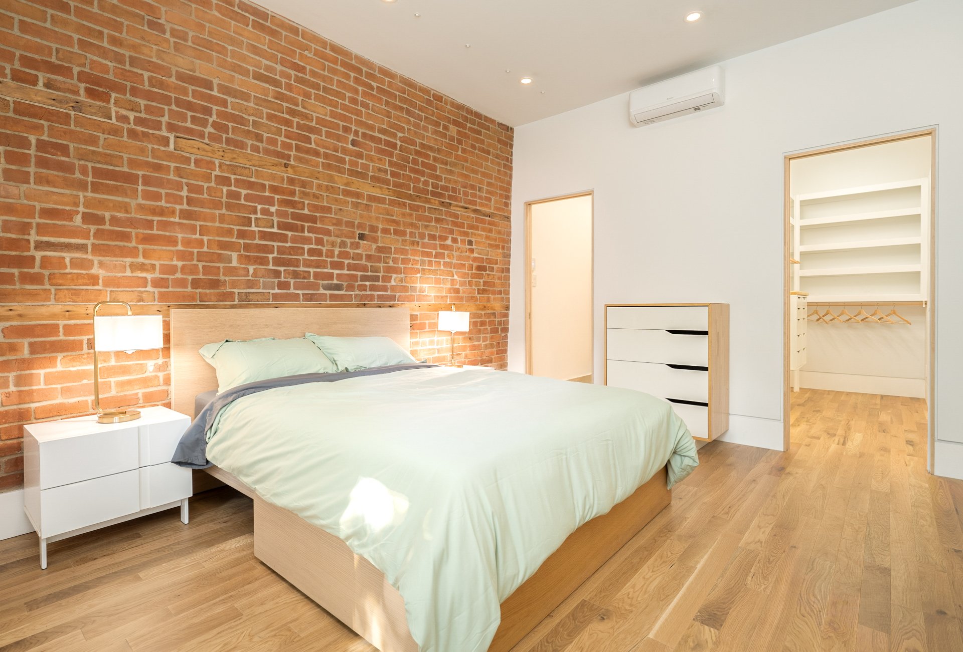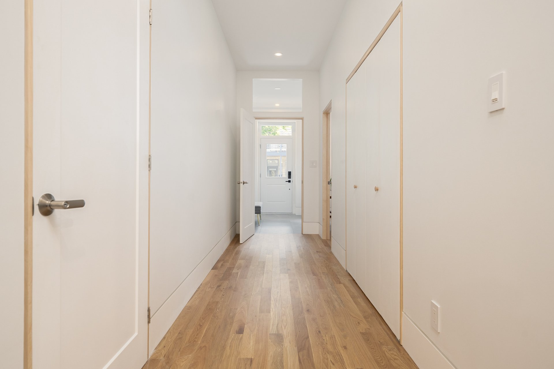 Recent upgrades also include hybrid aluminum/PVC windows, energy-efficient steel doors, new compact baseboard heaters, a 24 000 BTU heat pump, Mysa smart controls throughout, and advanced soundproofing with resilient channels, SonoPan panels, and double drywall.