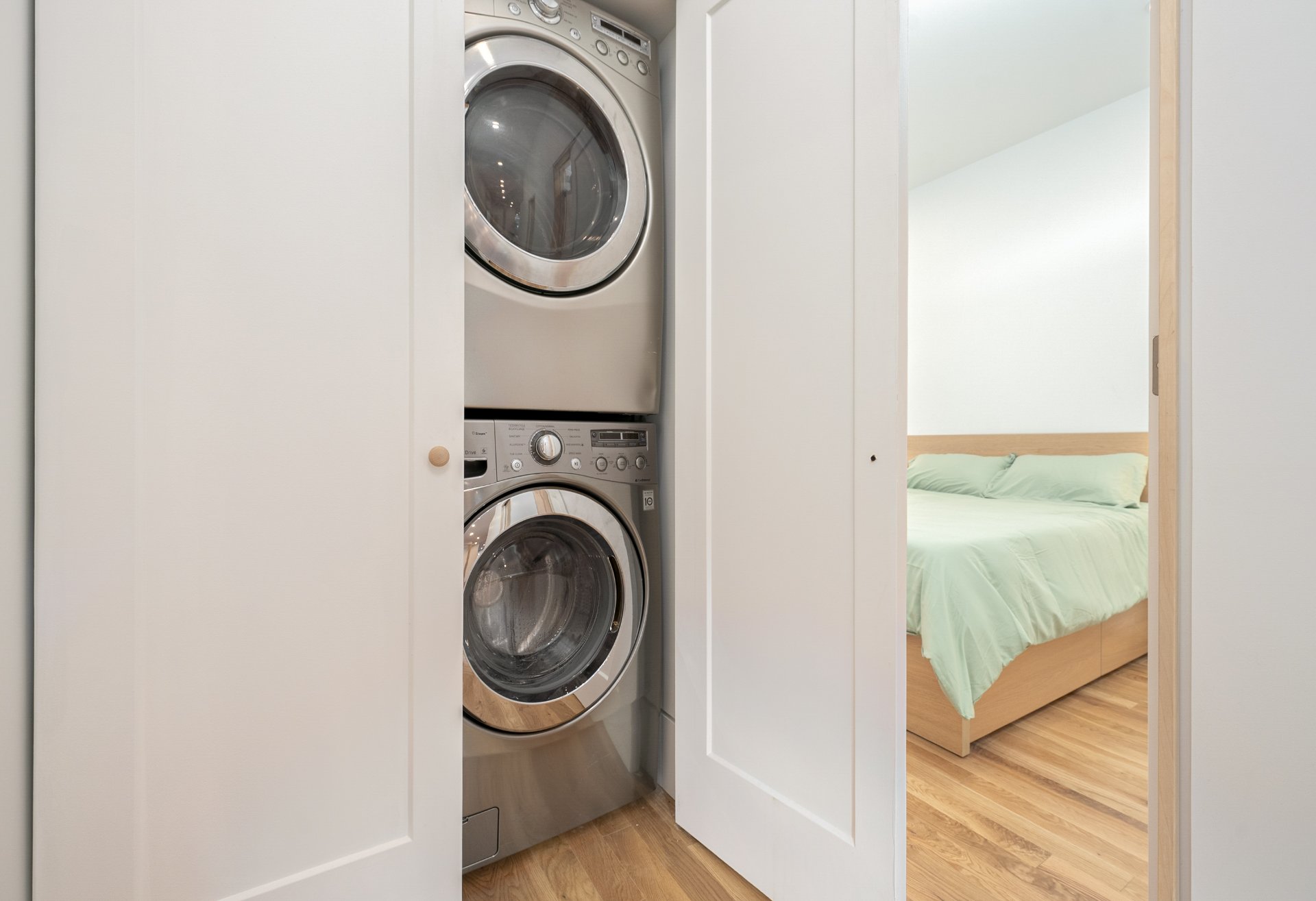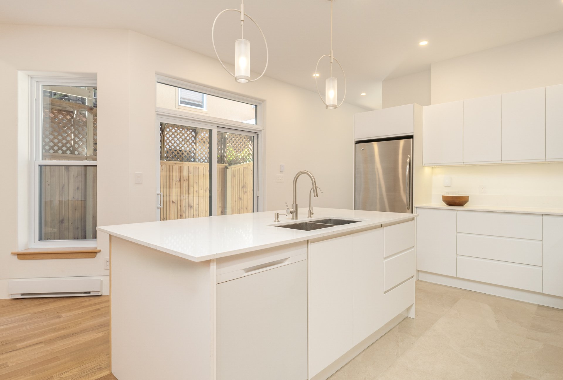 The bright open-concept living areas are ideal for entertaining, featuring custom millwork, high ceilings, and wide-plank solid oak flooring. The kitchen includes quartz countertops, gas outlet for stove, custom ash shelving, double sink, heated floors, integrated water filter and in-counter outlet - a chef's delight.