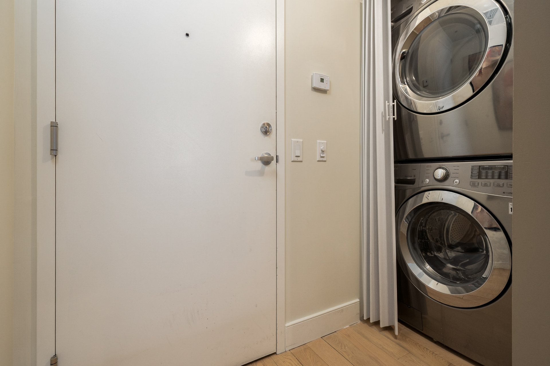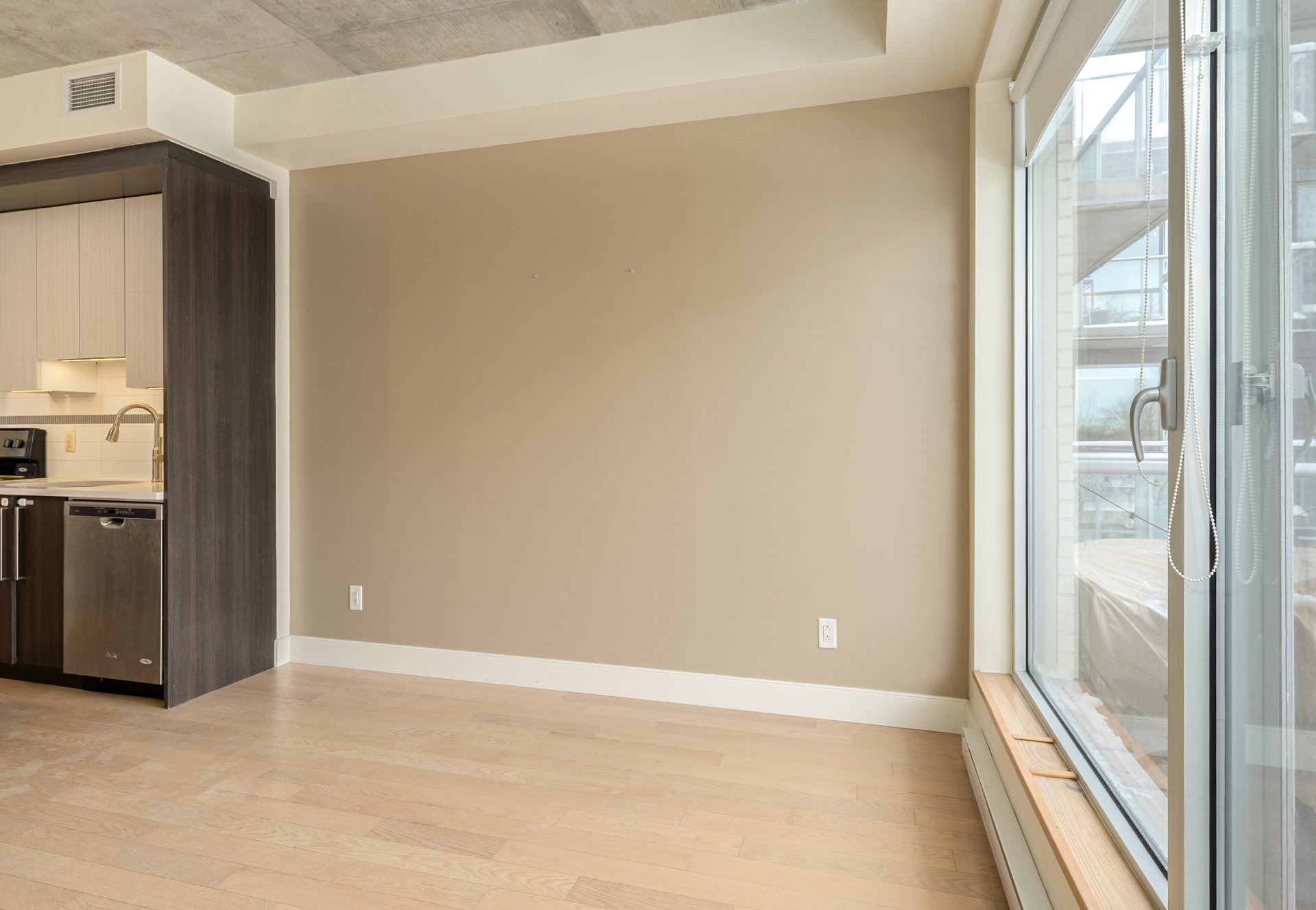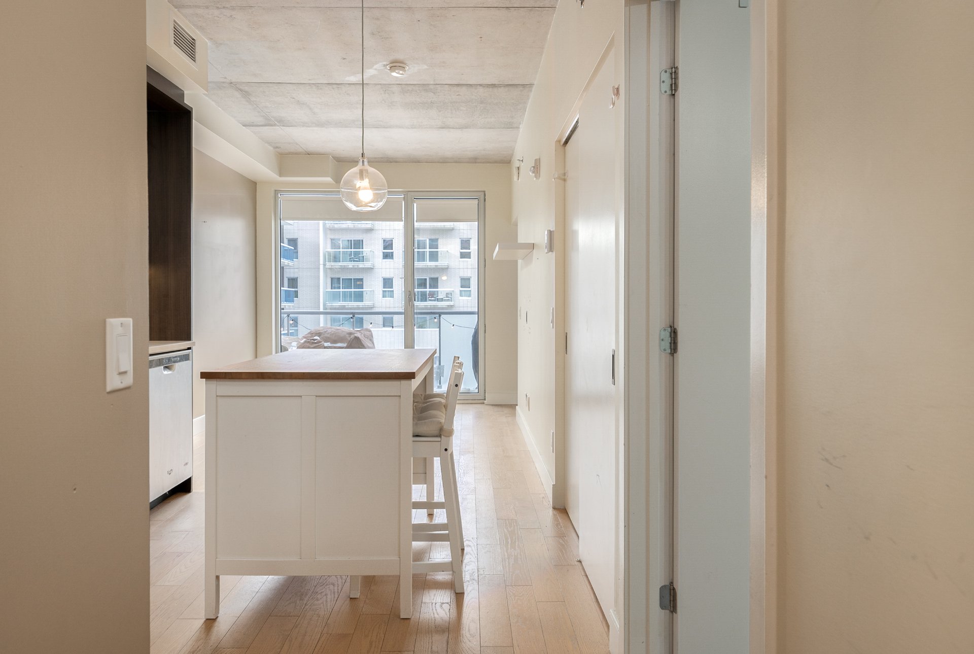 CONDO HIGHLIGHTS-Bright, open-concept living area-Industrial-style concrete ceiling-Functional kitchen -Private balcony off the living room-Closed bedroom with walk-in closet-Bathroom with bathtub and separate glass shower-Stacked washer/dryer discreetly integrated at the entrance-Air exchanger with heating and air conditioning-Dedicated storage space and bike space