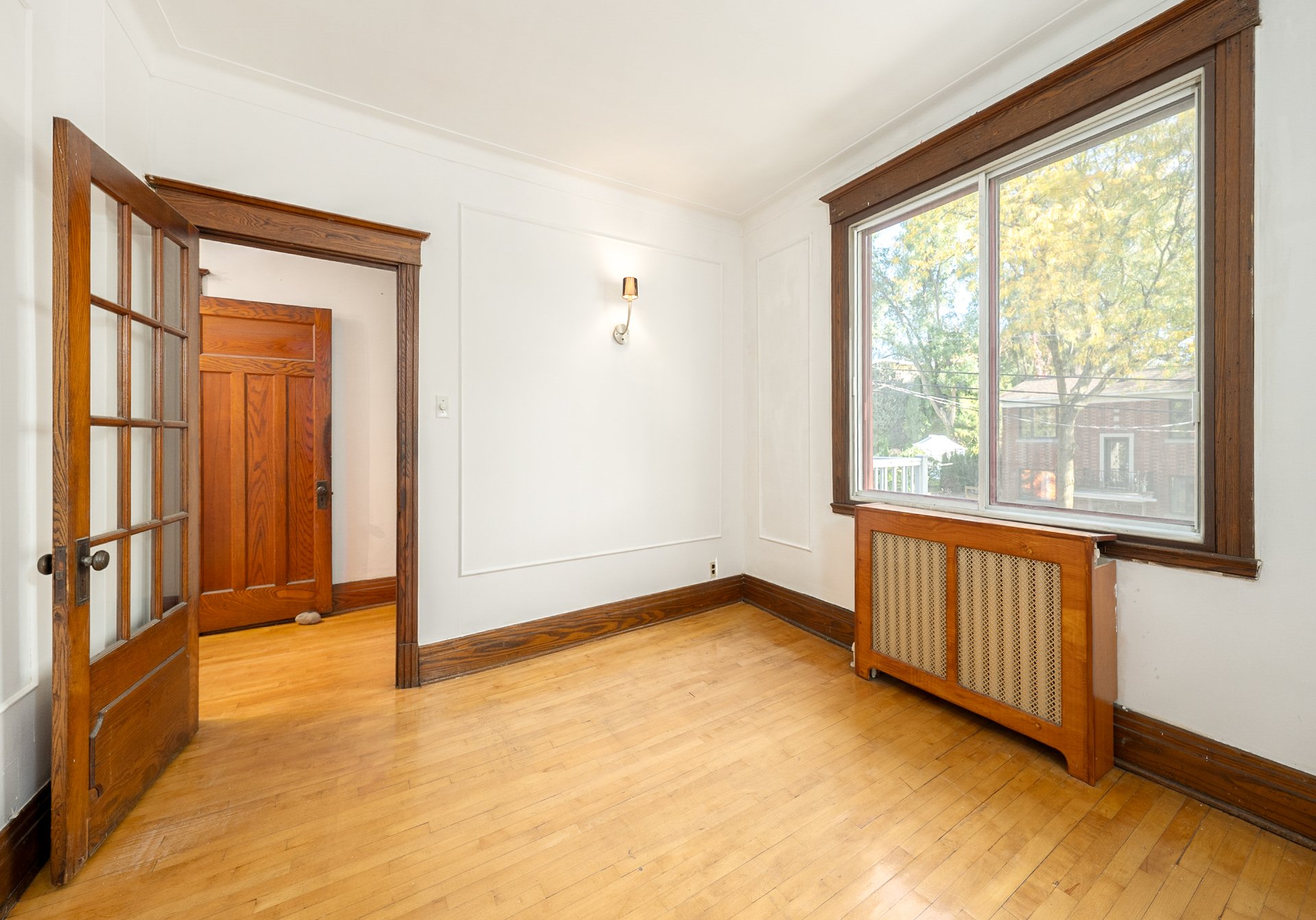 APARTMENTBright living room with large windows and decorative fireplaceFront room with closet; access to balcony with new floor and railingSpacious principal bedroom set back from the streetSecond bedroom of good size with wardrobe off the kitchenBathroom with skylight ready to be upgraded Good size kitchen with large adjoining pantry and ready to be customized to your needs and tastePrivate & intimate back balcony large enough to dine and entertain.Crown mouldings & hardwood floors throughout