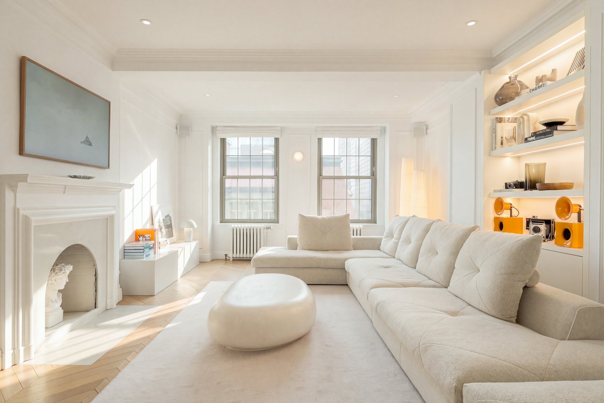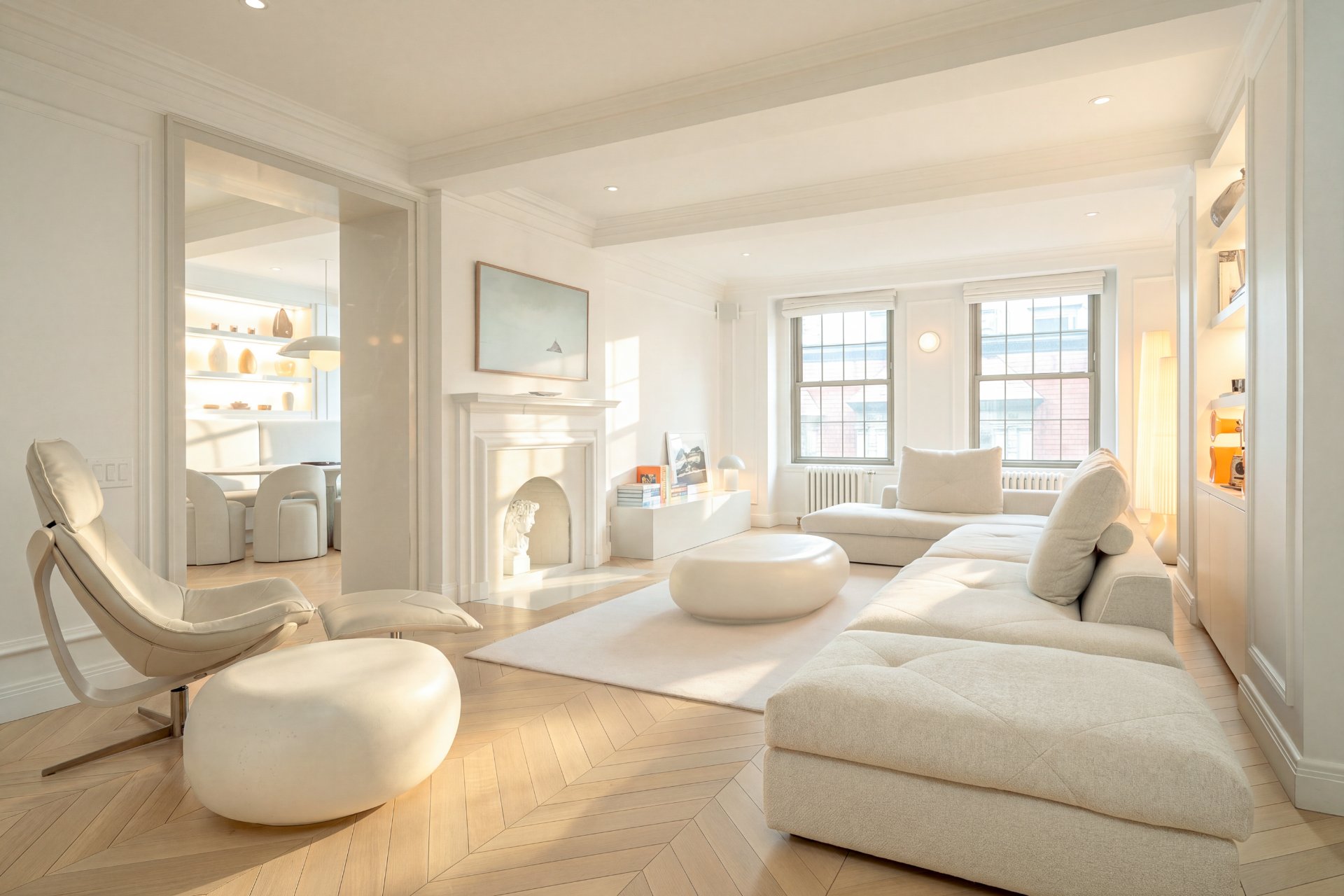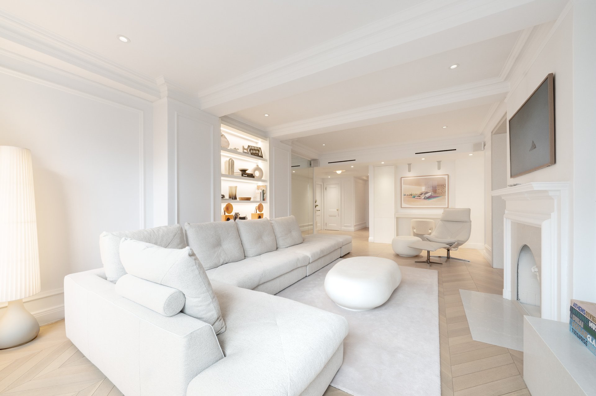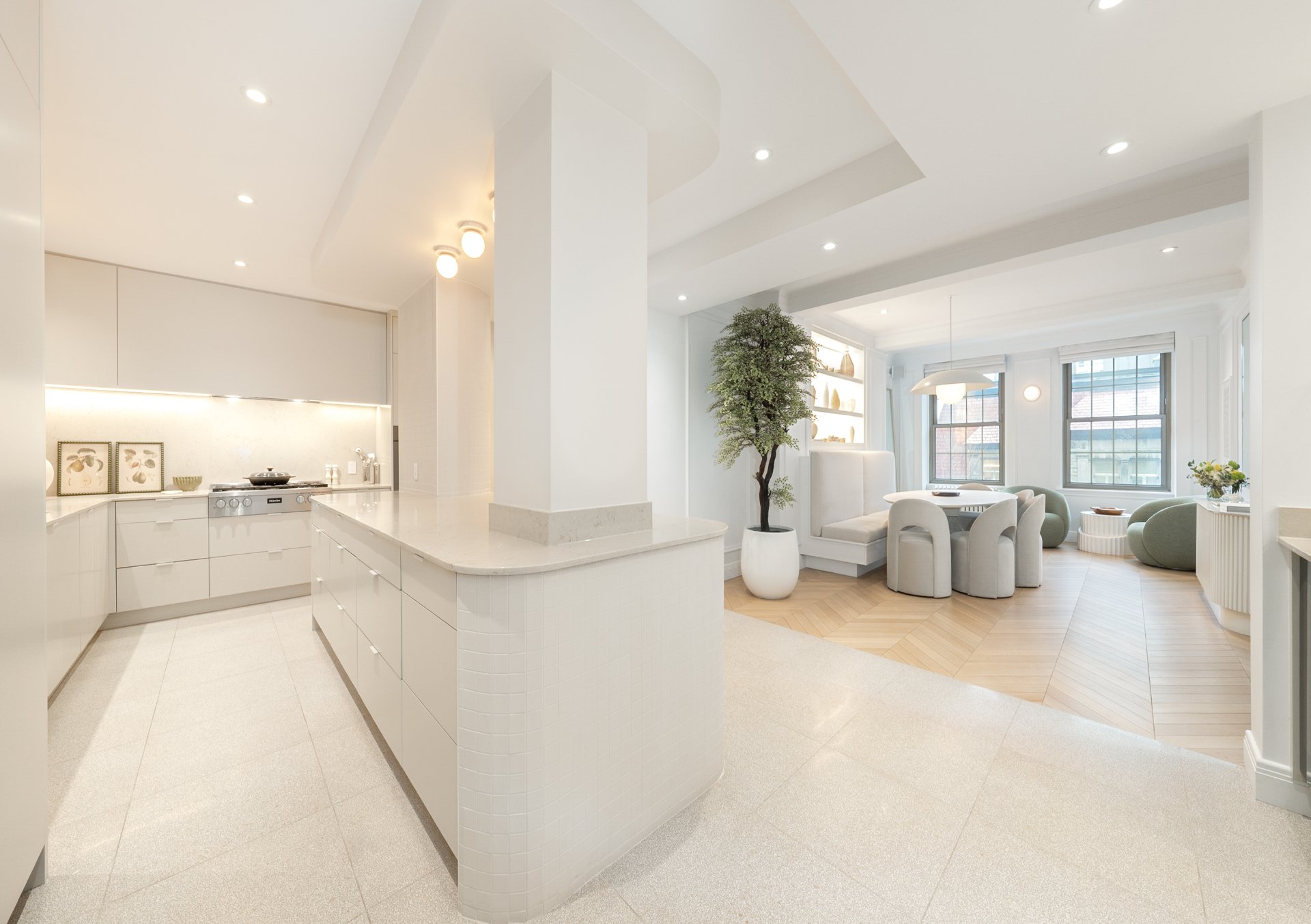 CONDO HIGHLIGHTS-High ceilings and generous room proportions-Large reconfigured layout optimizing every square foot-Expansive living room with preserved fireplace mantel-Open dining area designed for entertaining-Custom kitchen with central island and integrated Miele appliances-White oak herringbone flooring throughout main living spaces-Primary bedroom with walk-in and built-in storage-Second bedroom with custom storage-Main bathroom with quartz finishes, glass shower and bathtub-Powder room with distinctive design and refined materials-Separate laundry room with built-ins and workspace-Extensive custom cabinetry and storage throughout-Integrated sound system across the unit-Completely redone air conditioning system-Timeless architectural details blended with modern interventions-Parking in garage #1A3 (common portion for restricted use)