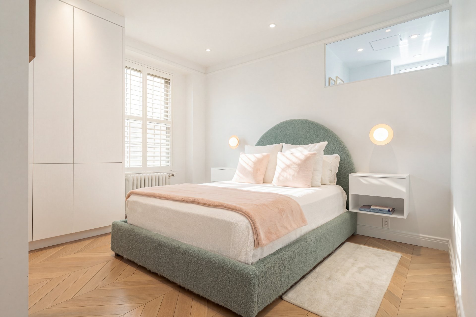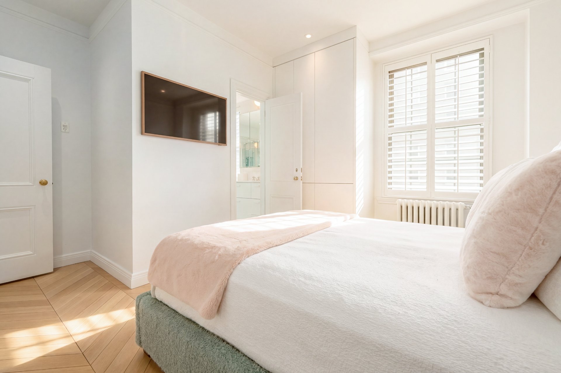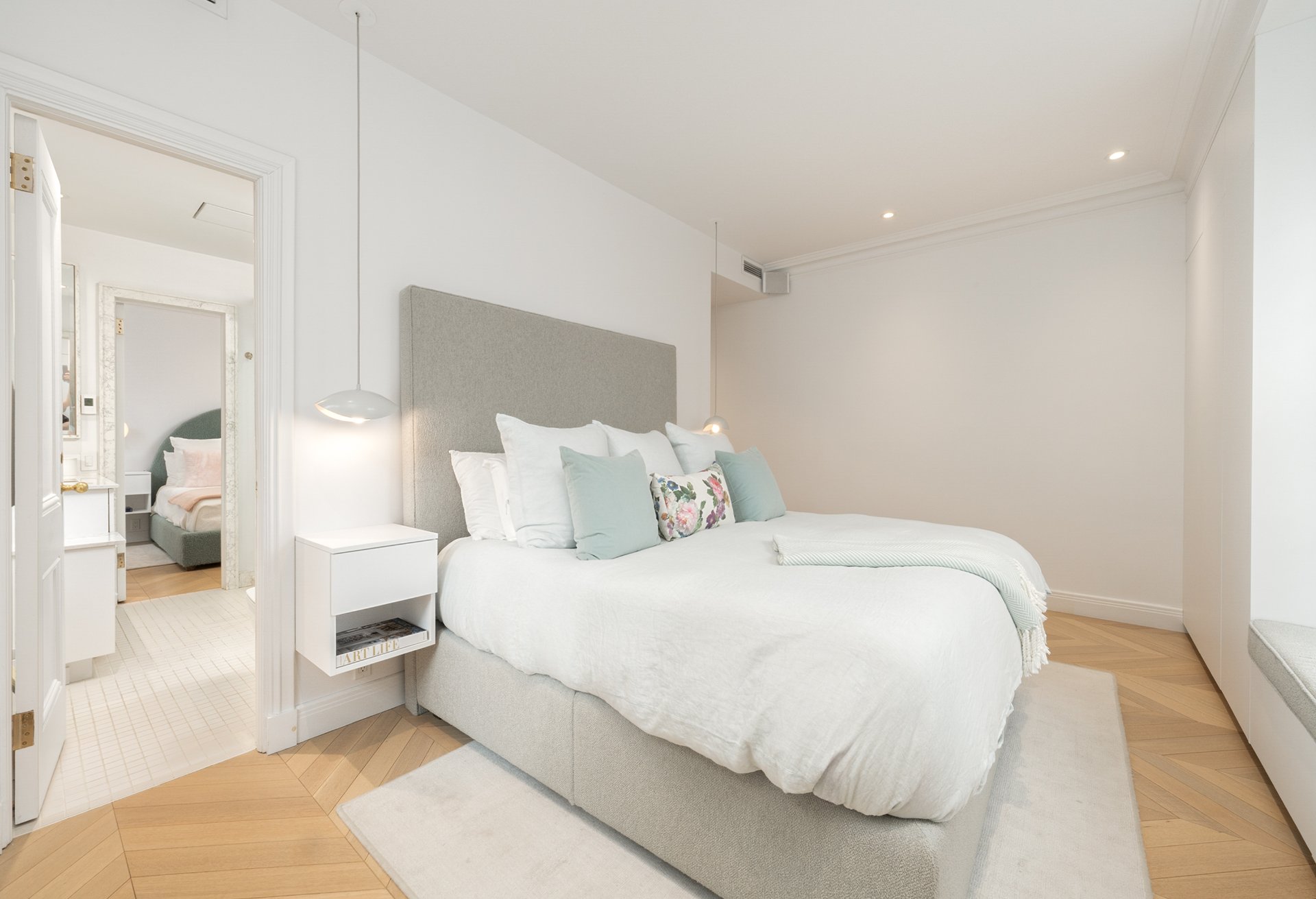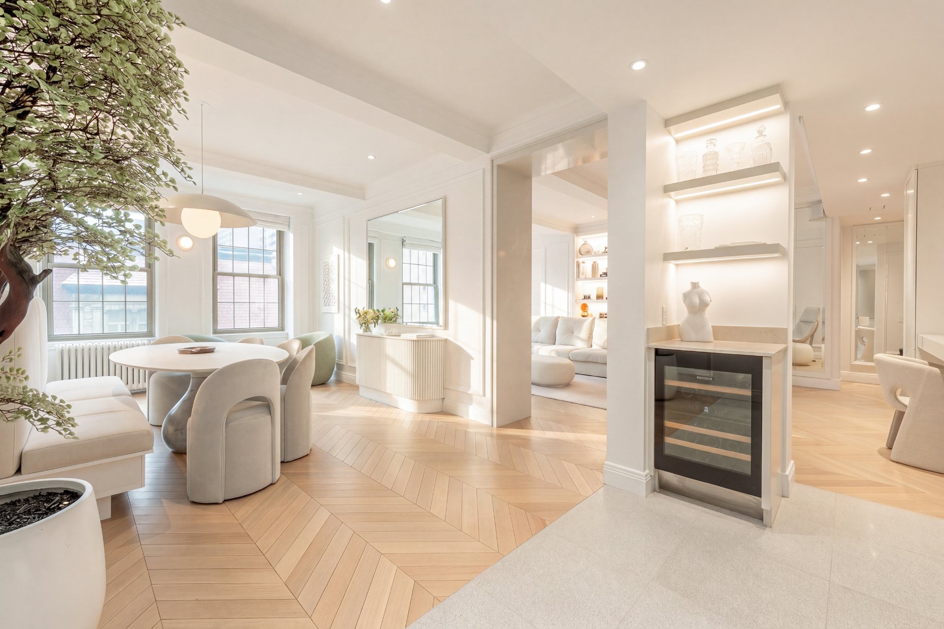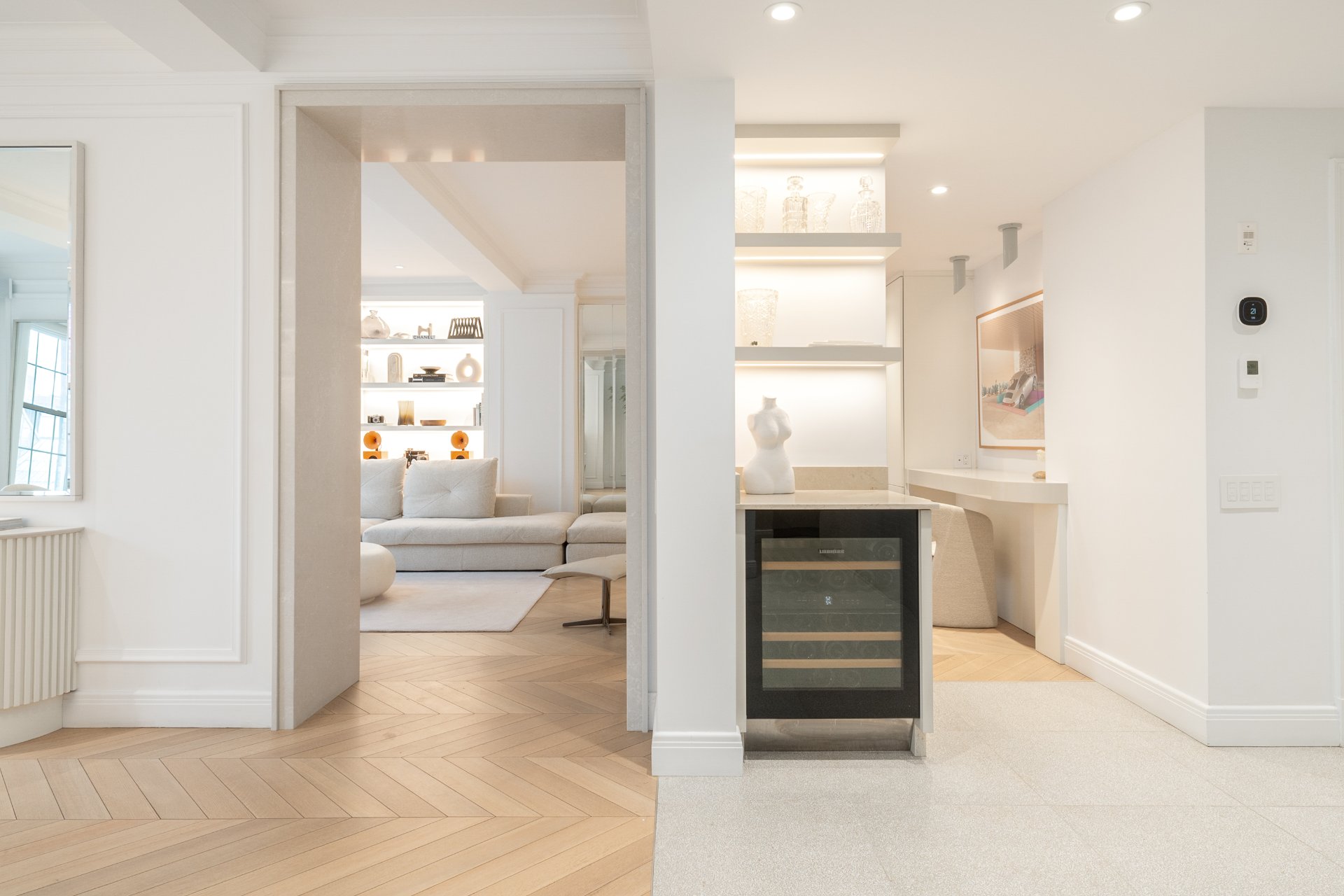 Refined residence at The Acadia, where 1925 architecture meets a full-scale redesign with elevated contemporary finishes. This reconfigured unit offers generous volumes and seamless living spaces, complemented by the building's full-service lifestyle with 24/7 doorman and concierge and a peaceful landscaped courtyard. White oak herringbone floors, curated lighting and custom built-ins define the interior, while the kitchen anchors the home with its sculptural island and integrated Miele appliances. Two well-appointed bedrooms, refined bathrooms and modernized systems complete this turnkey offering in a prestigious Golden Square Mile address.