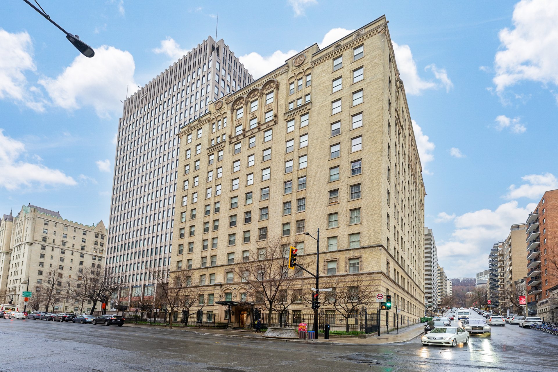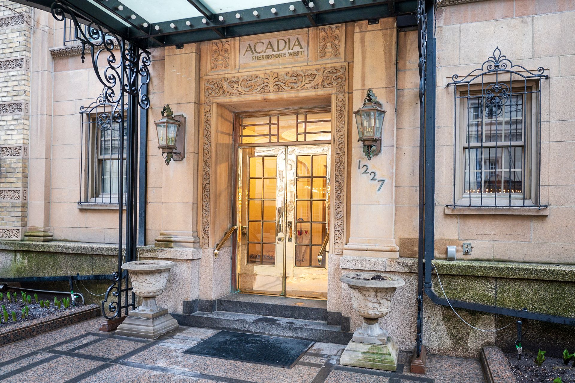 -Prestigious Golden Square Mile address: Located at The Acadia, directly across from the Ritz-Carlton. Steps to Sherbrooke Street boutiques, fine dining, museums, McGill University, Mount Royal and metro access. Walk score of 99 offering true walk-everywhere convenience. Full-service building with 24/7 doorman, concierge, elegant lobby and landscaped courtyard.