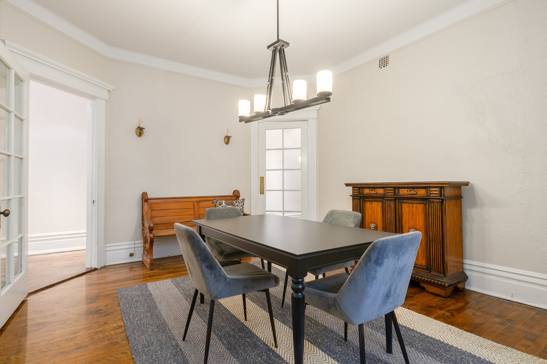 Detailed list of included furniture:*Living Room: two white sofas, round coffee table; two side stands with lamps, mirror over themantle, black shelf unit with lamp.*Dining room: 4 chairs; side board, antique bench & cushion*Kitchen: white table & 4 chairs*Den: Sectional sofa with cushion, round coffee table, side table & lamp, white wardrobe*Primary bedroom: Wardrobe,*2nd bedroom: bed frame and mattress, white desk with chair & lamp, mirror, tall chest of drawers,corner lamp*3rd bedroom: tall chest of drawers