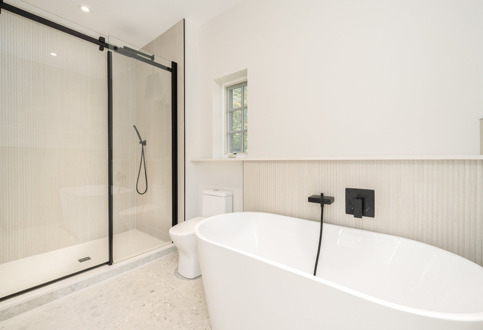 SECOND FLOOR - 8'4" ceilings - Three spacious bedrooms, including a serene primary suite with walk-in closet.- Two full bathrooms with heated floors, double vanities, freestanding tubs, and walk-in showers.- Linen closet and wall-mounted heat pump in the hallway, with a skylight overhead.