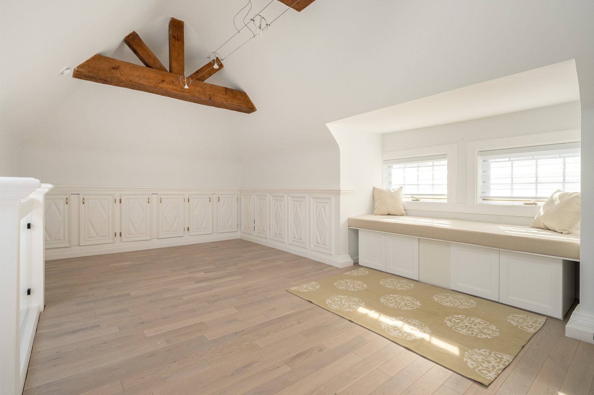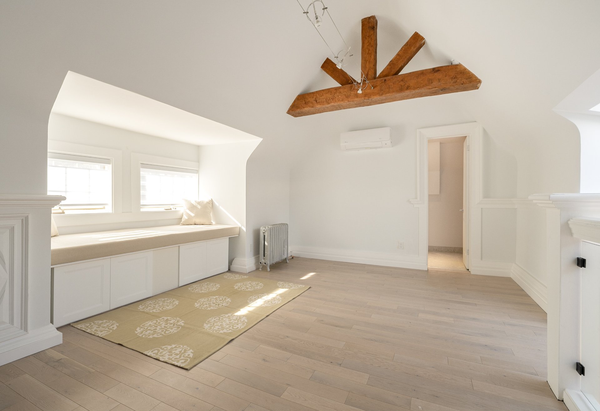 THIRD FLOOR - 10'11" ceilings- Bright open loft space ideal for a family room, playroom, or large office.- Extensive storage solutions and built-in banquette by the windows.- Full bathroom with heated floors and rainfall shower.