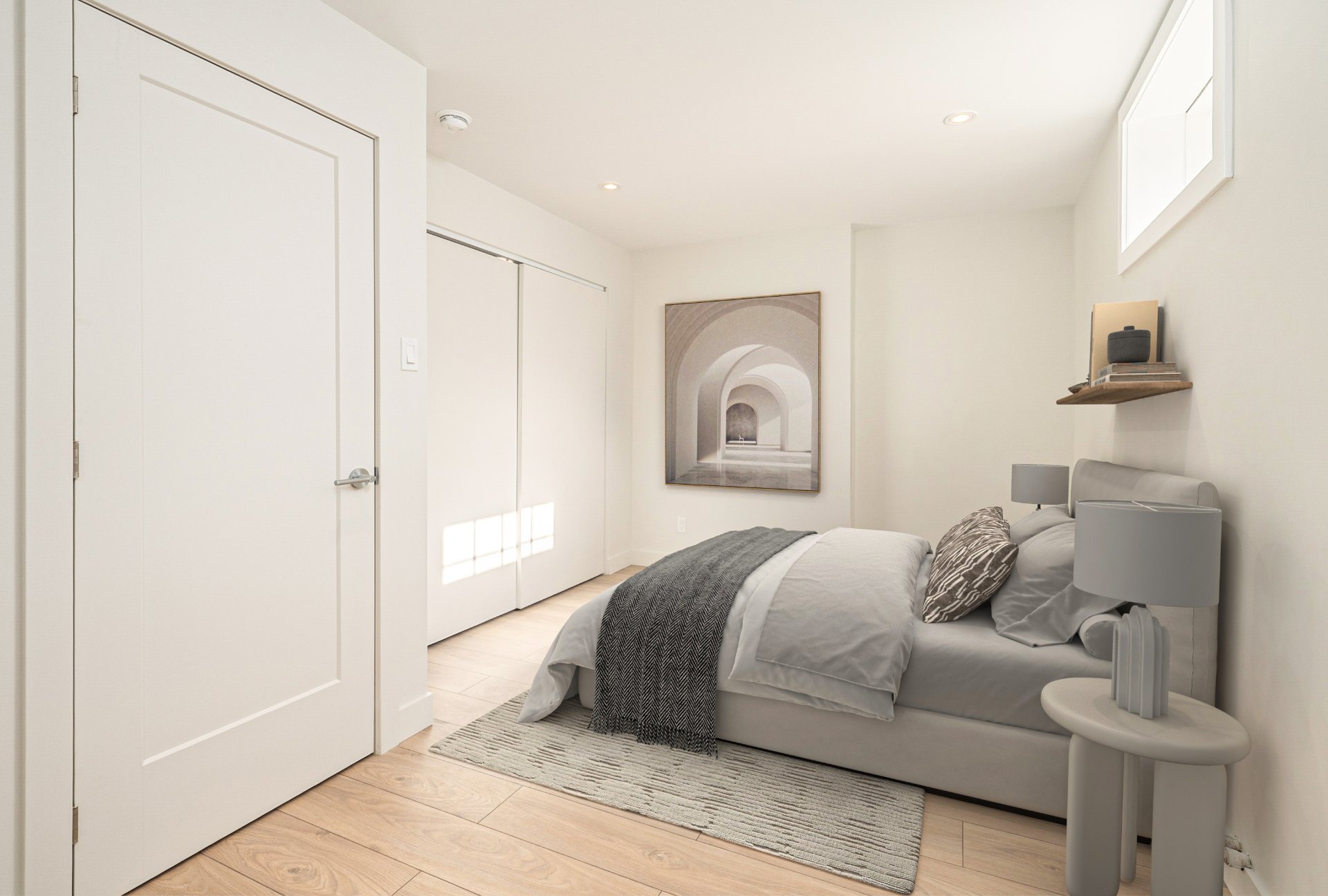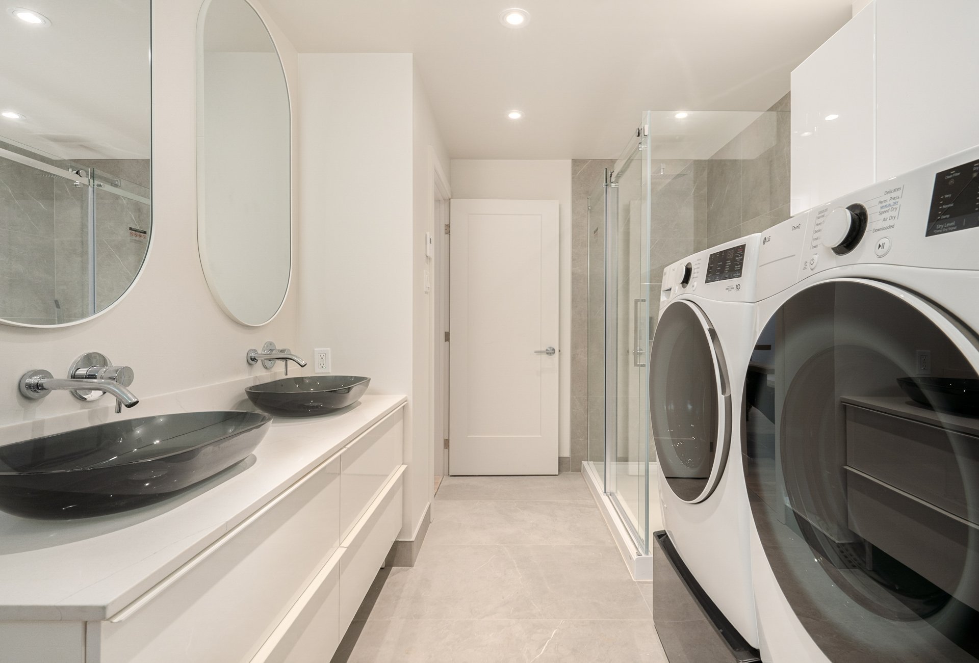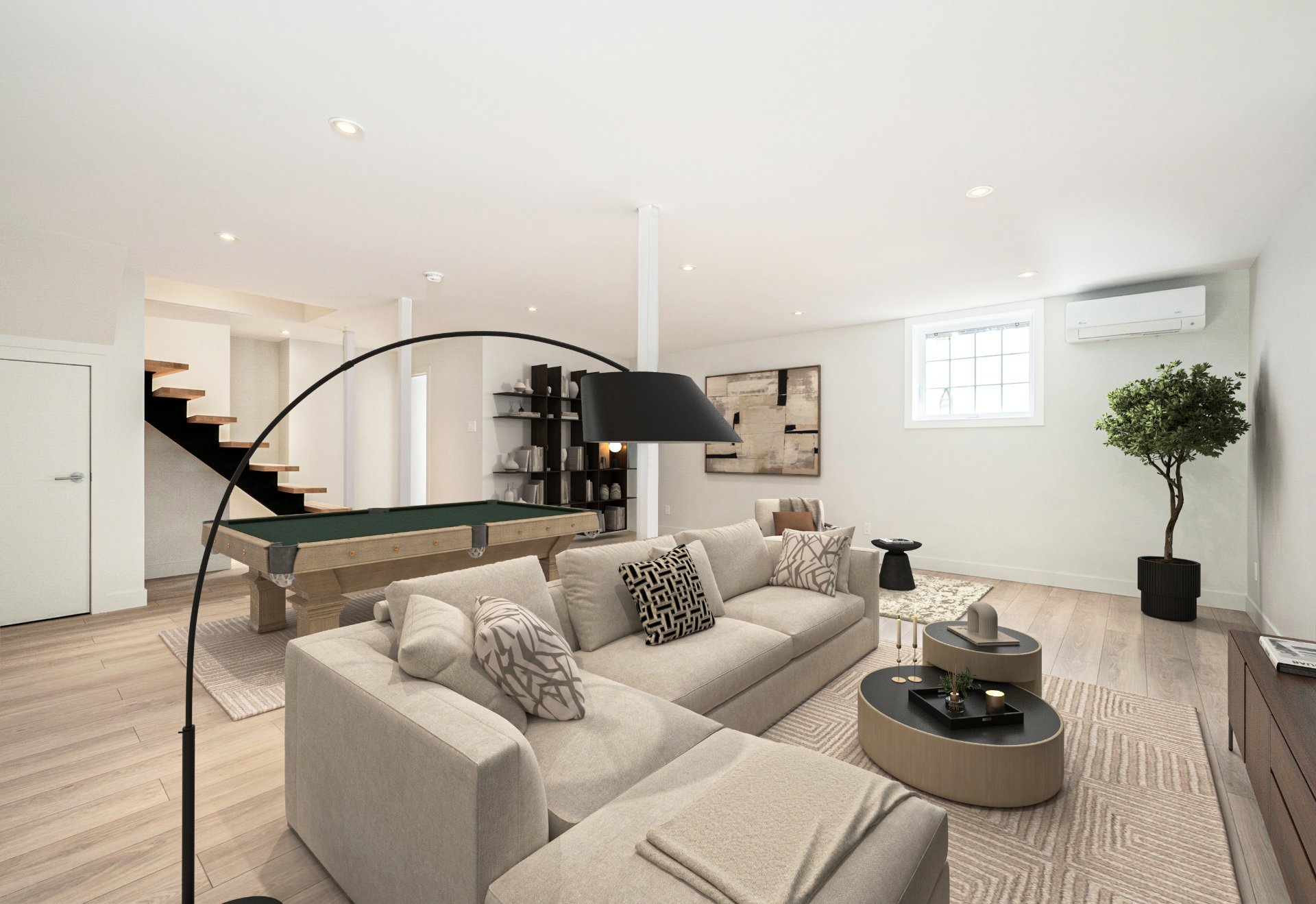 BASEMENT - 7'9" ceilings - Sleek open staircase with integrated storage.- Oversized family room, guest bedroom, and full bathroom with heated floors and laundry area.