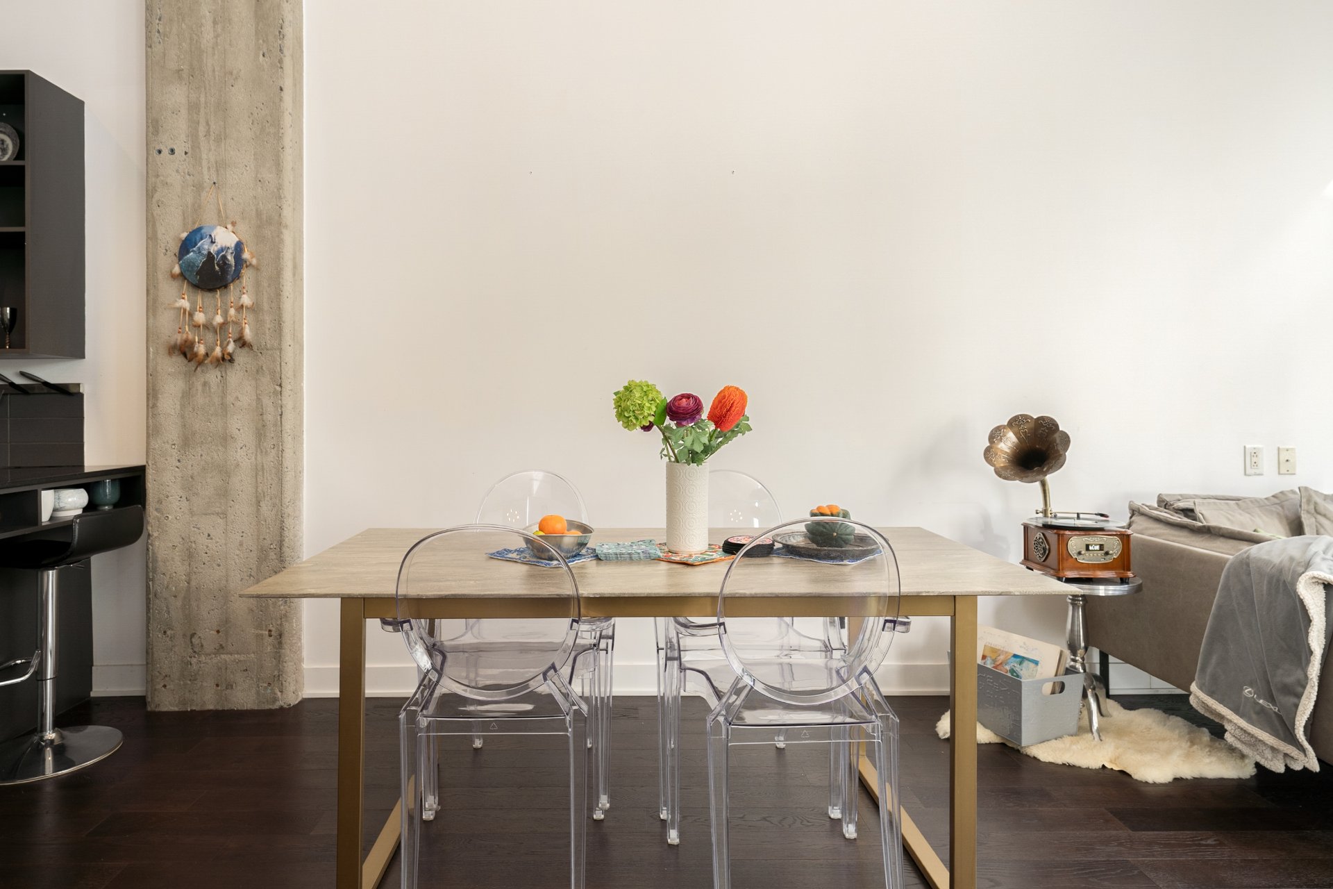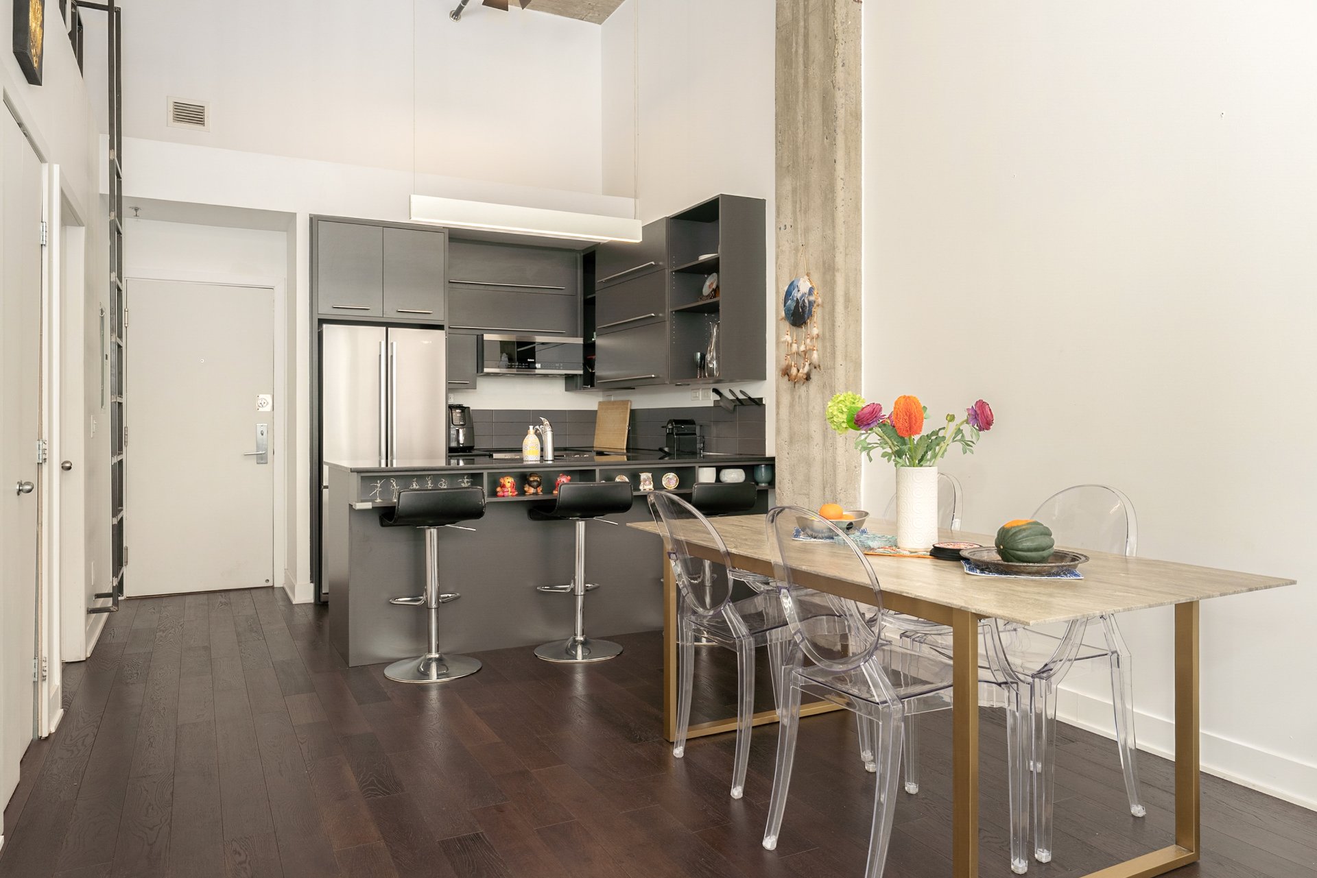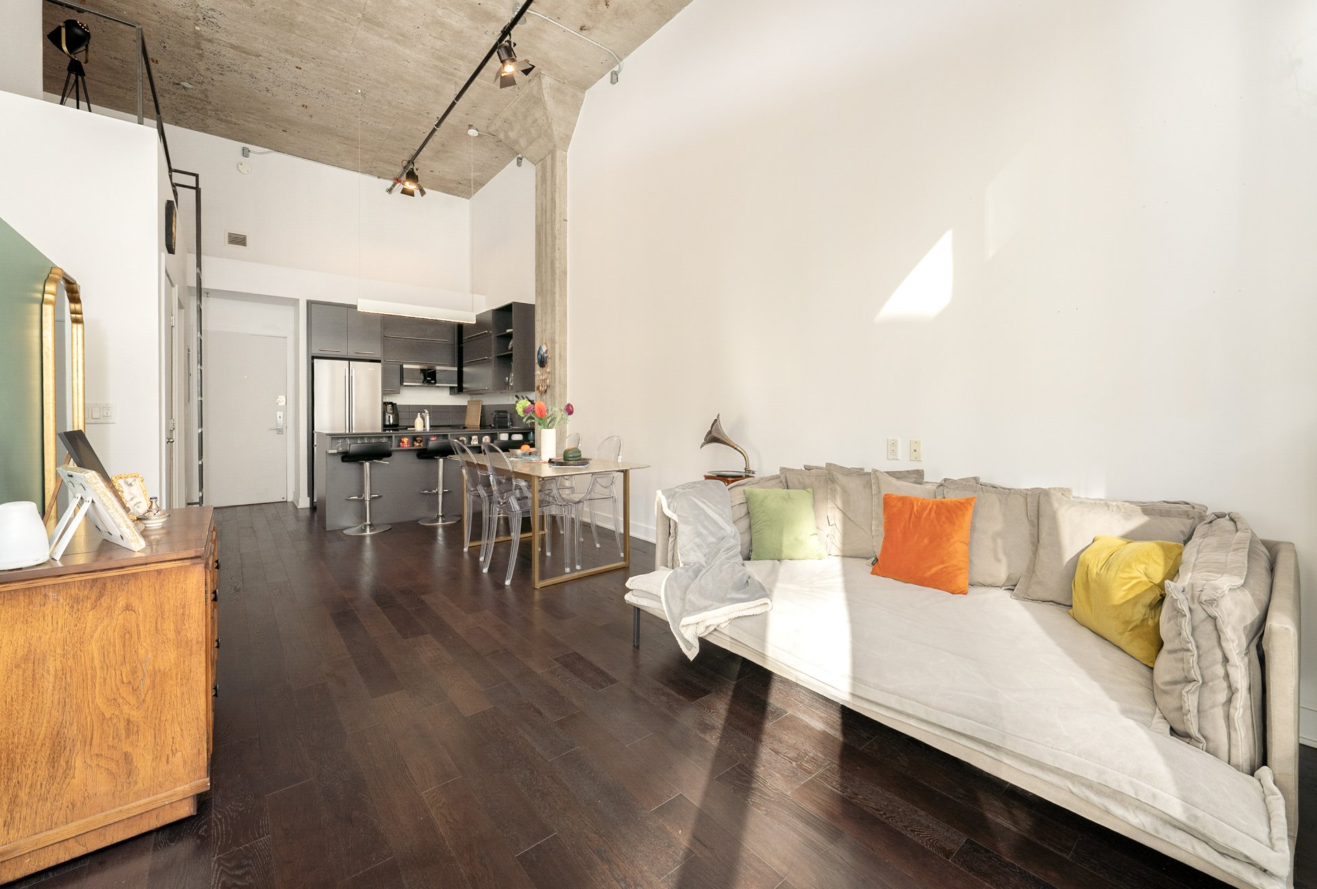 -Prime St-Henri location -- Walk to Lionel-Groulx and St-Henri metro stations, Atwater Market, Lachine Canal, and some of the city's best cafés and restaurants.-Industrial character -- 14'4" ceilings, Juliet balcony, and expansive windows bring light and style to every inch.-Turnkey and upgraded unit -- New floors and paint (2022), modern lighting, A/C (2018), and appliances included.