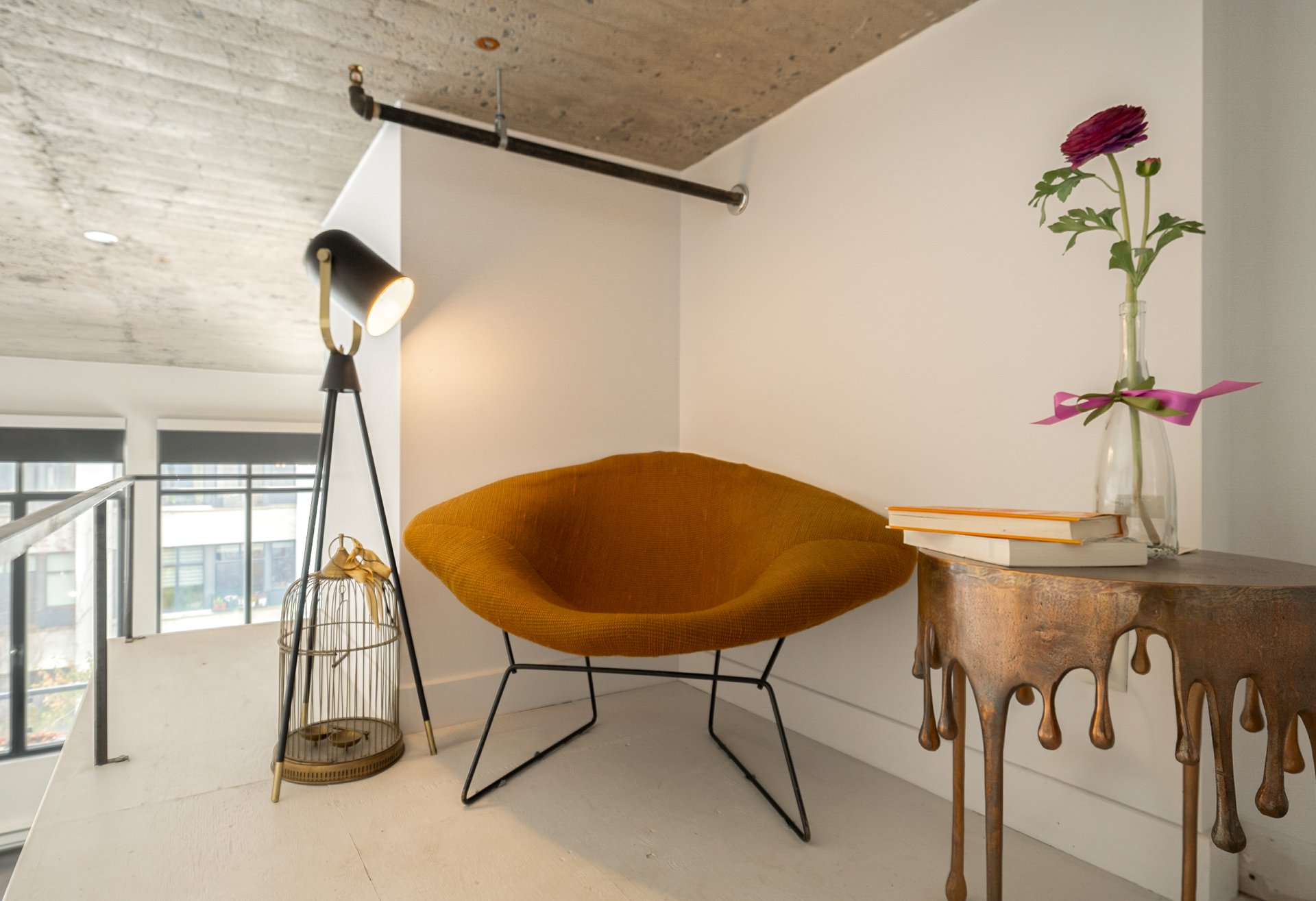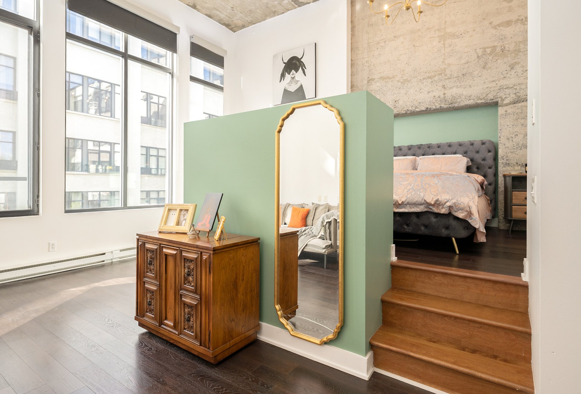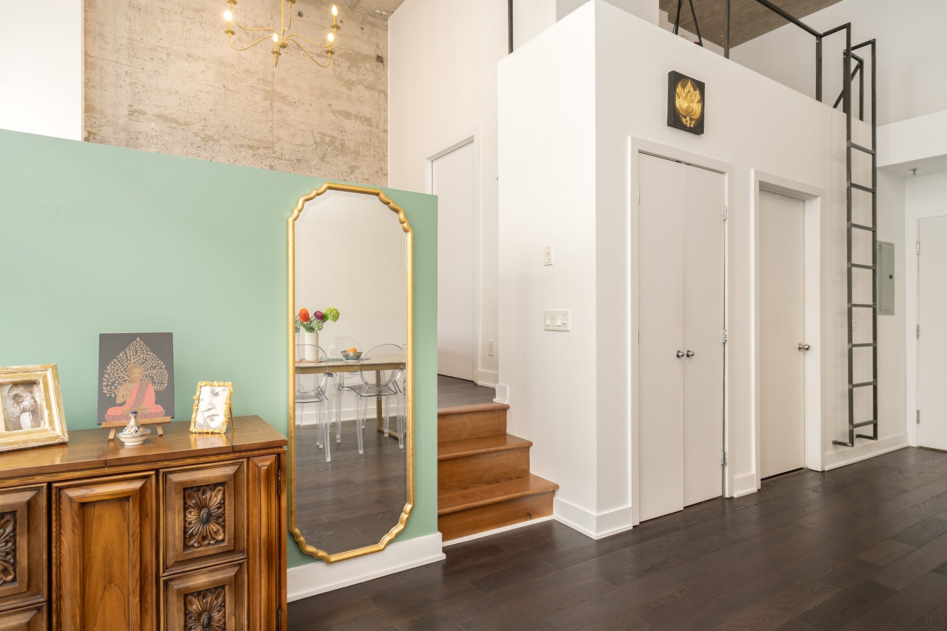 MAIN LEVEL-Bright open-plan layout with dramatic ceilings and courtyard views-Contemporary kitchen with quality finishes and included appliances-Living and dining area with Juliet balcony-Walk-in closet with custom shelving and pocket door-Full bathroom with modern fixtures-Through-the-wall air conditioner (2018)MEZZANINE-Practical office or guest area (not included in official sq. ft.)-Custom ladder and railing for easy access
