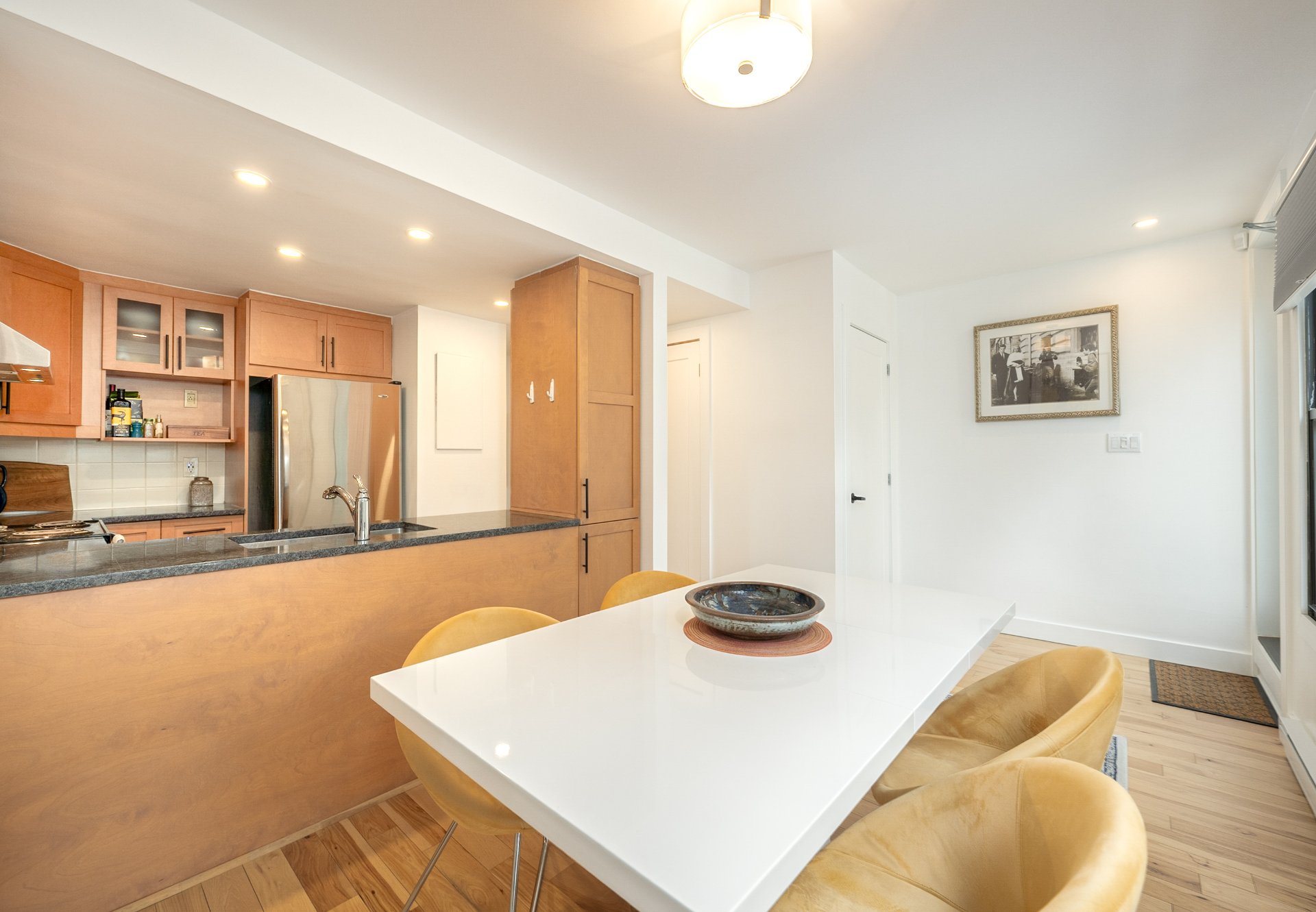 SECOND FLOOR:- Bright living room with large windows and abundant natural light.- Kitchen with wood cabinets, granite countertops, stainless steel appliances, and practical U-shaped configuration.- Dining room with wood floors and direct access to the rear deck.- Versatile office or storage space.- Carefully renovated powder room.- Front balcony overlooking Notre-Dame St..