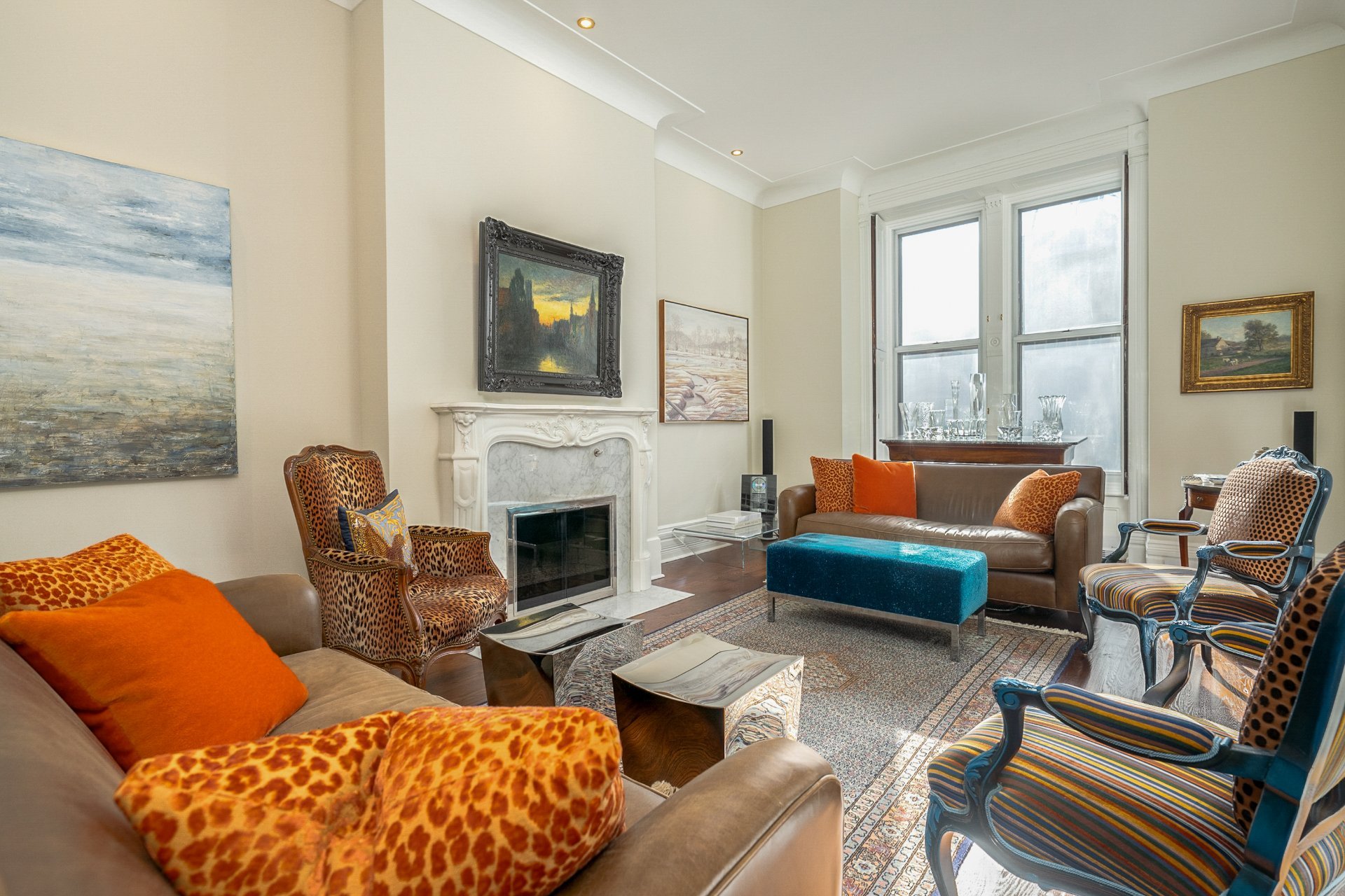 RDC-Hall d'entrée formel avec plafonds de 10 pieds & superbe boiseries -Salon avec foyer en marbre, grandes fenêtres, moulures détaillées & éclairage encastré-Grande salle à manger mise en valeur par un imposte en bois préservée & des colonnes décoratives-Cuisine rénovée avec long îlot en marbre, armoires pleine hauteur, dosseret en arabesque & haut-parleurs intégrés au plafond-Coin repas avec accès à la terrasse-Salle d'eau