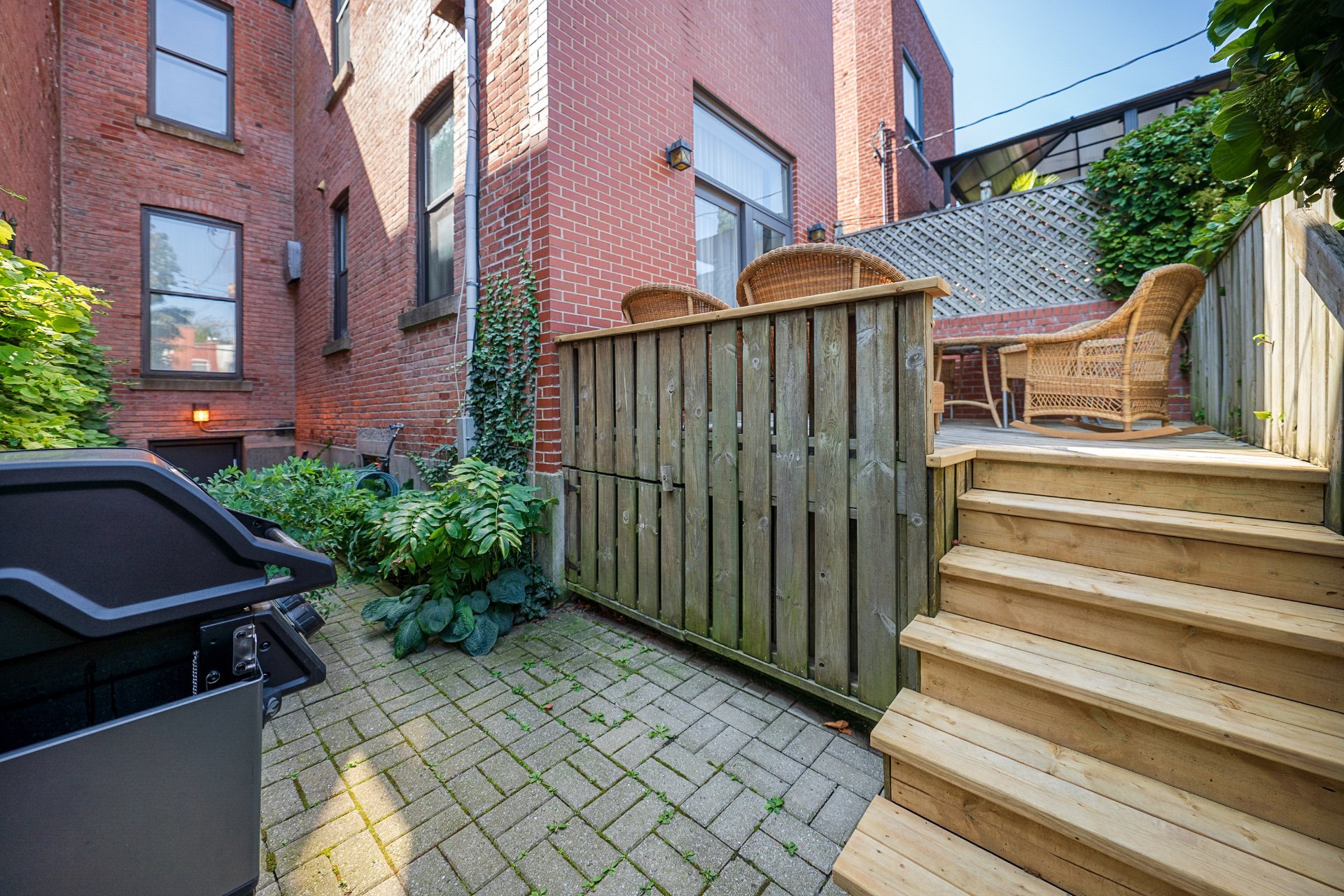 COUR & STATIONNEMENT-Terrasse privée attenante à la cuisine, idéale pour repas extérieurs & détente-Patio inférieur avec espace BBQ & touches de verdure-Cour entièrement clôturée, à entretien minime, avec terrasse en bois & pavés de pierre-Système d'irrigation-Allée pavée pour deux voitures à l'arrière