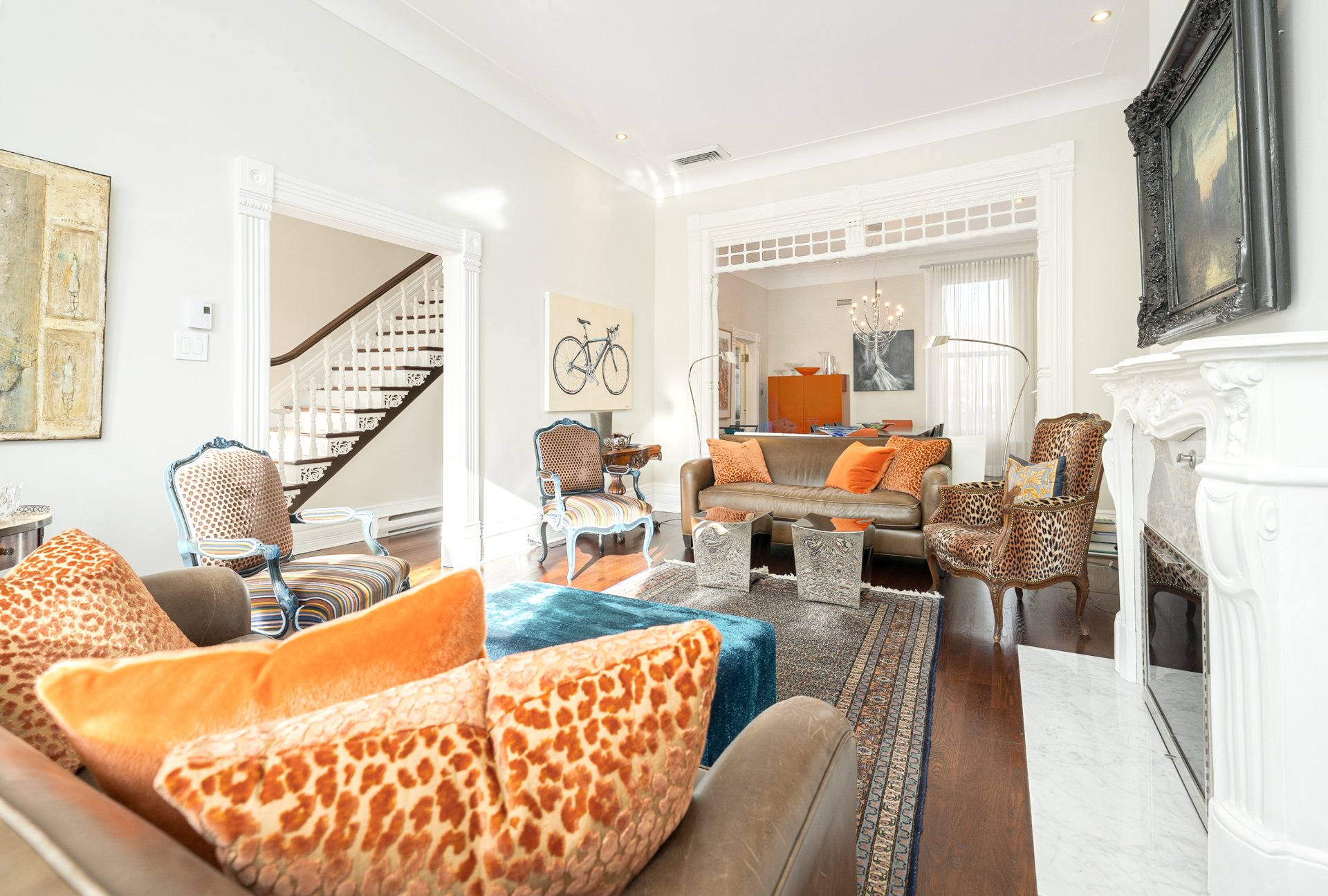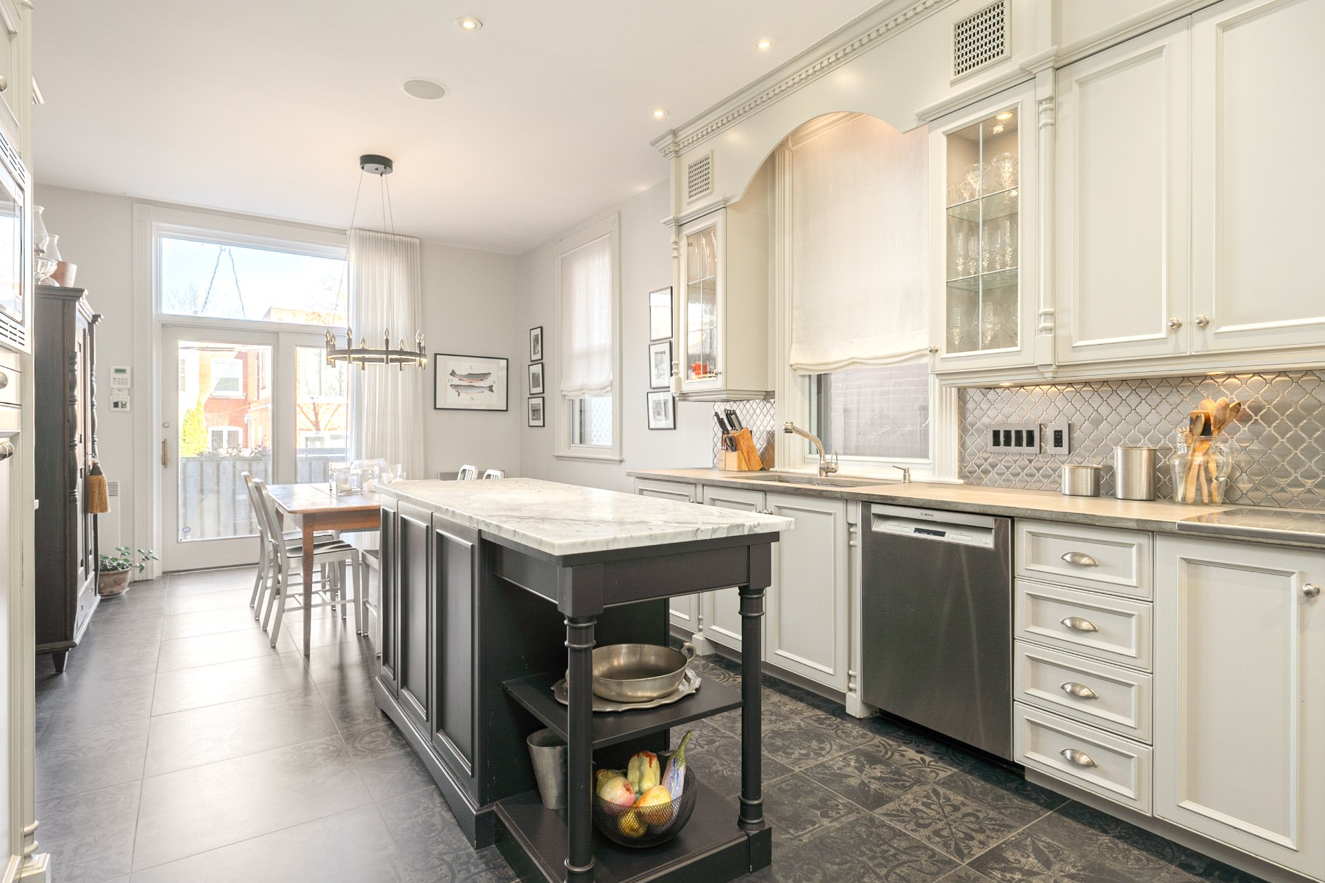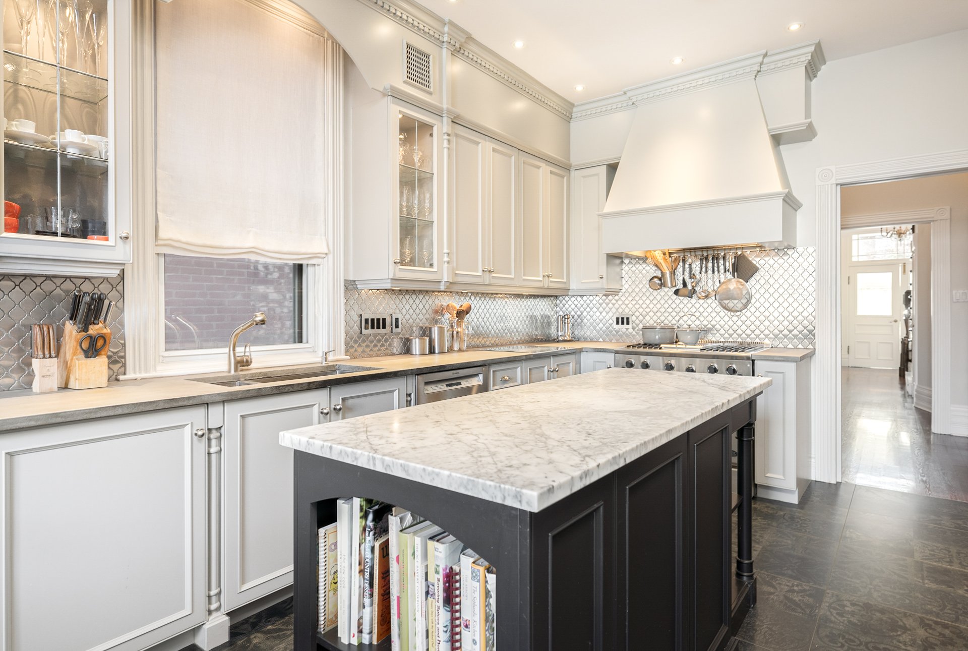 NOS 3 COUPS DE COEUR-Cuisine de chef avec armoires pleine hauteur, long îlot en marbre, dosseret en arabesque, coin repas et accès à la terrasse-Détails architecturaux remarquables du manteau de foyer en marbre sculpté à la rampe d'escalier ornementale, en passant par l'imposte en bois décoratif et les ogées détailées, à découvrir pleinement en visite-Stationnement privé double, rare dans ce secteur de Westmount