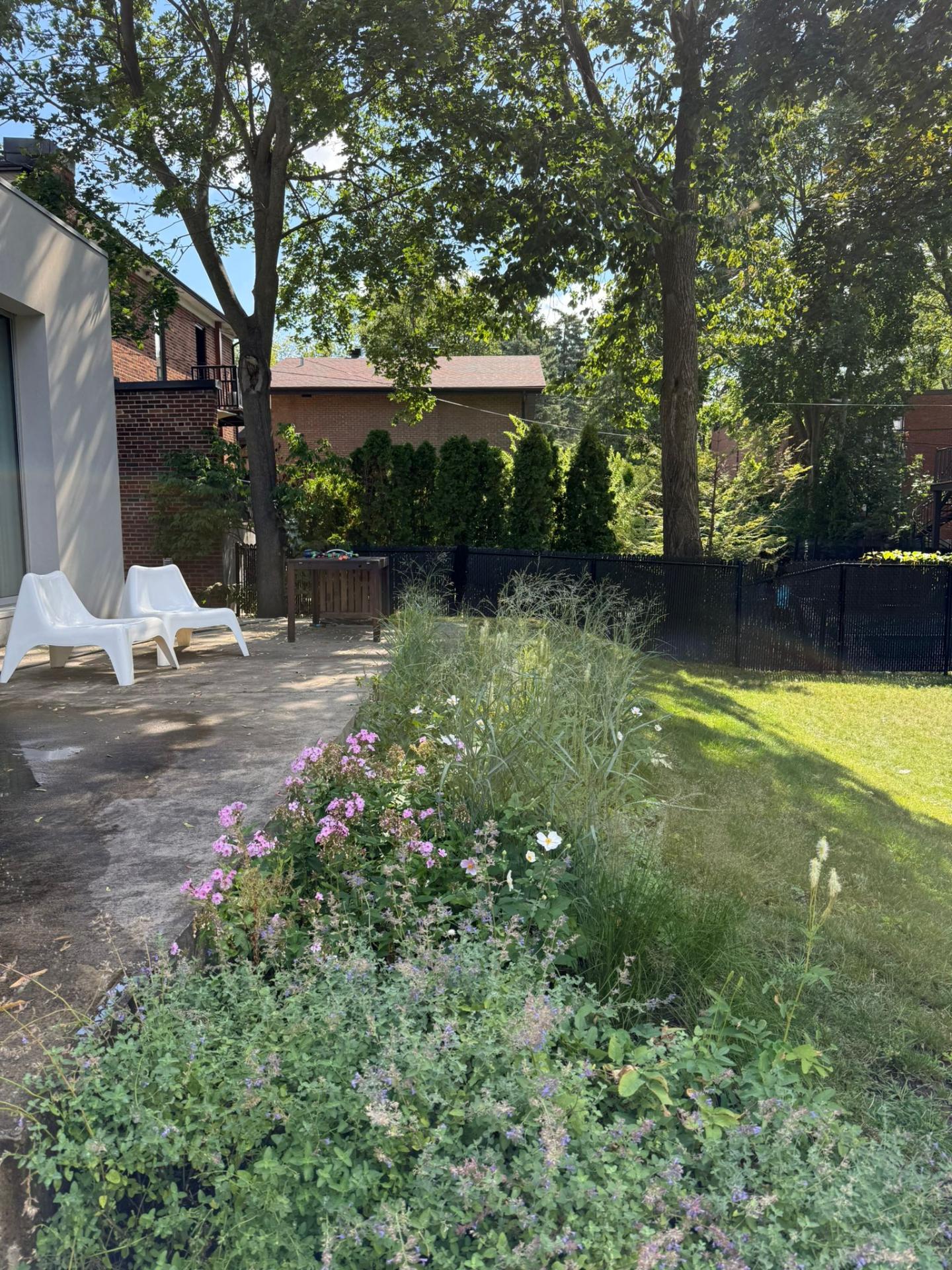 COUR & STATIONNEMENT-Terrain profond et intime avec terrasse et espace gazonné-Cour clôturée avec arbres matures-Garage simple + stationnement dans l'allée