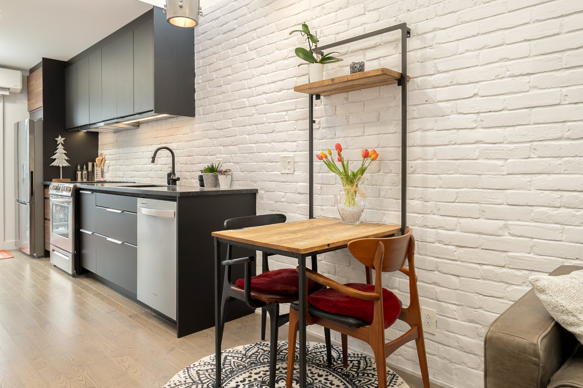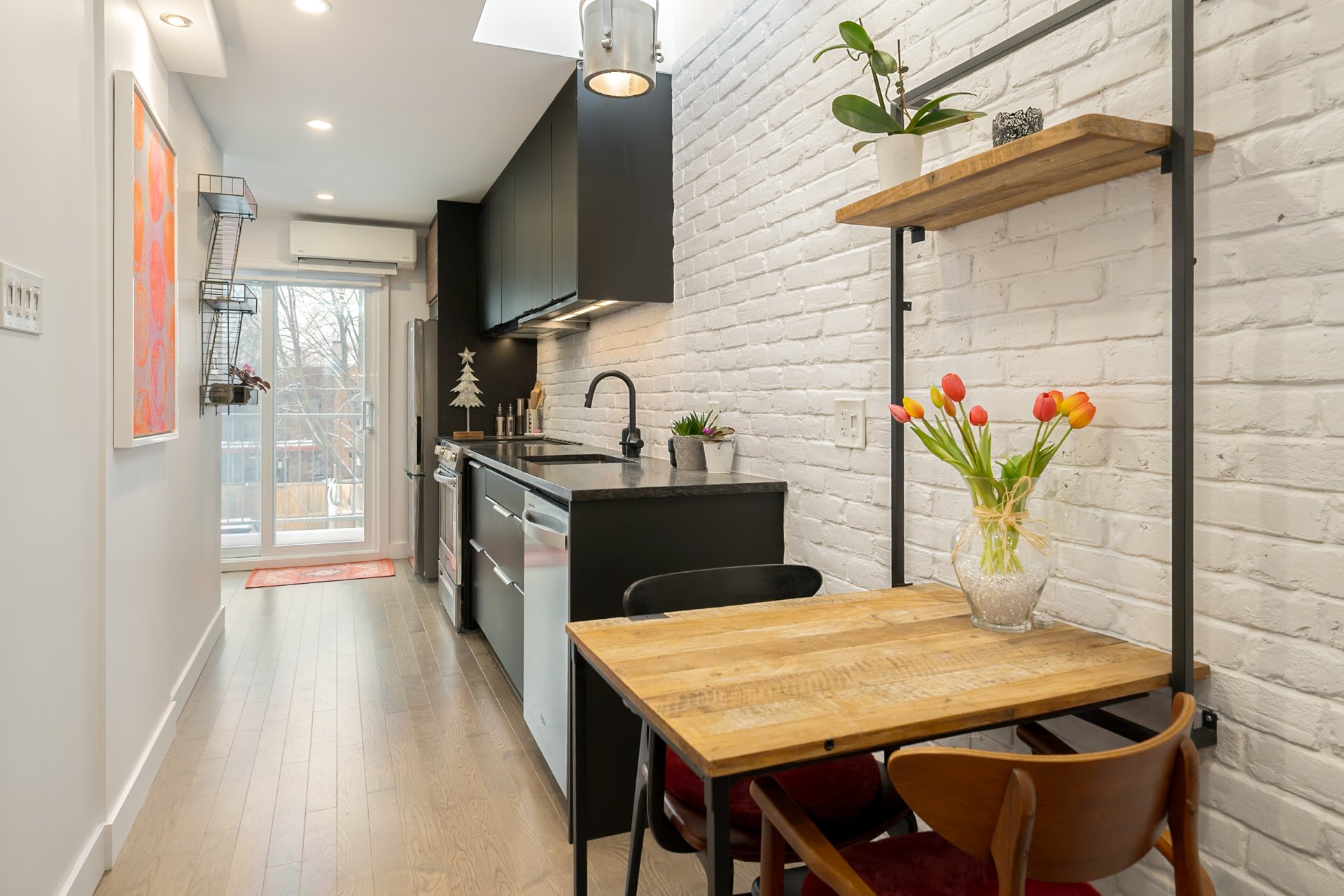 Turnkey pied-à-terre in the heart of Montreal, fully renovated and soundproofed with a loft-hotel feel. Bright and fully furnished, all you need are your personal belongings. Open living space with exposed brick wall, sleek linear kitchen, electric fireplace and two balconies, including a large rear balcony overlooking your parking space. Renovated bathroom with heated floors. Located on the quiet section of Rue des Écores, steps from Parc Molson, Cinema Beaubien, cafés, restaurants and the metro, in a calm and secure environment. Heating, electricity and internet included.