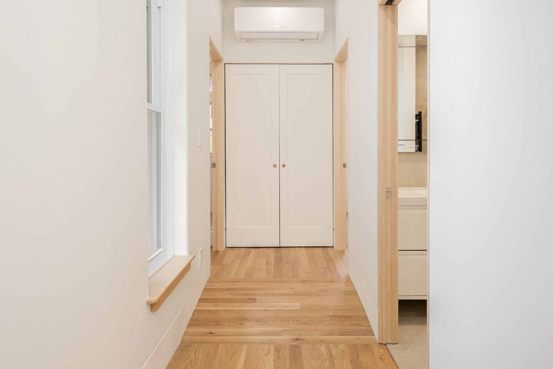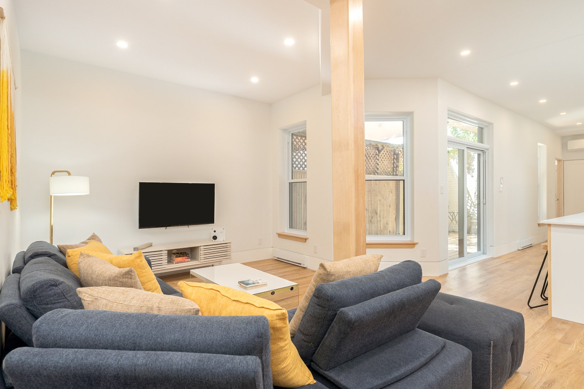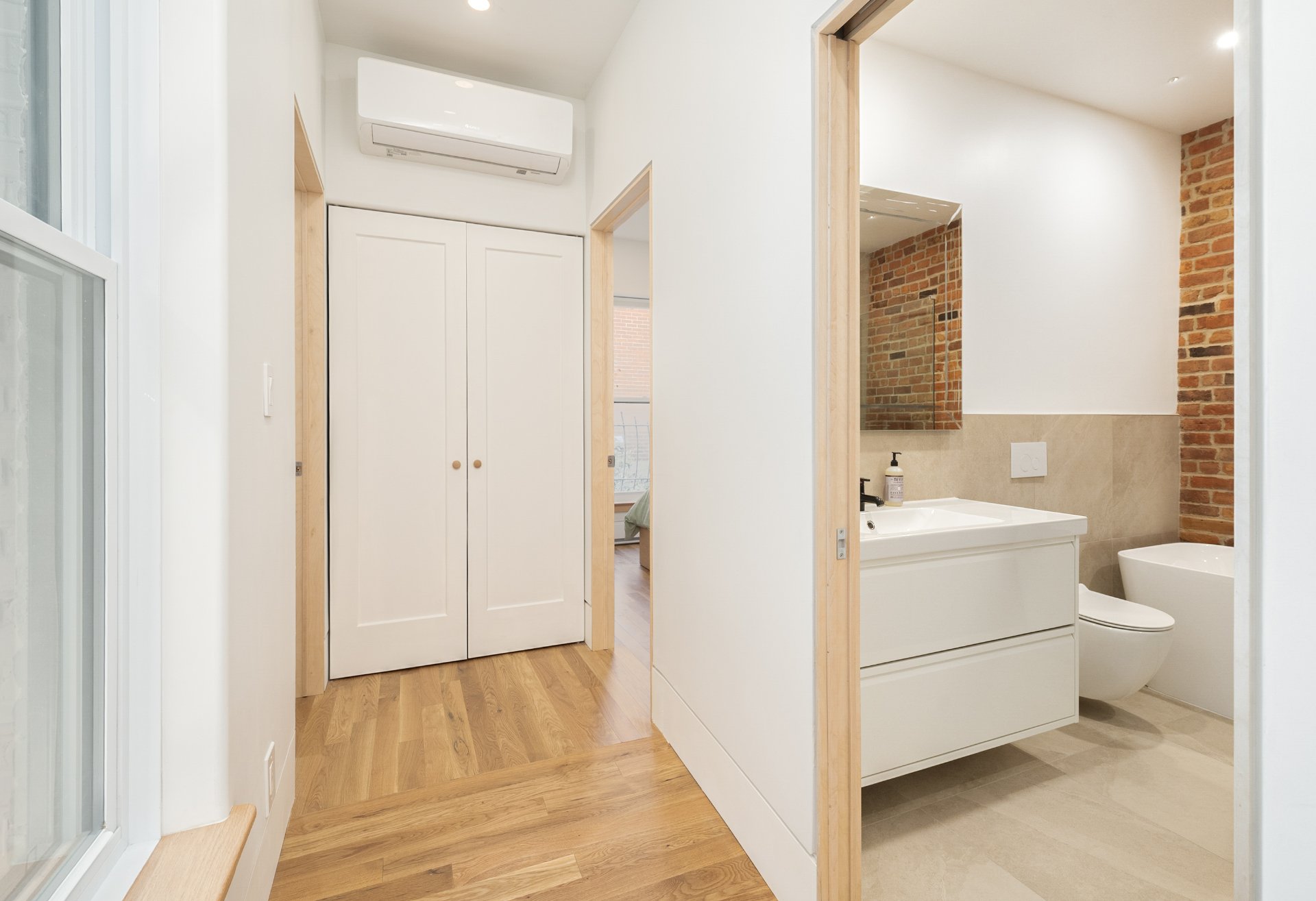Recent upgrades also include hybrid aluminum/PVC windows, energy-efficient steel doors, new compact baseboard heaters, a 24 000 BTU heat pump, Mysa smart controls throughout, and advanced soundproofing with resilient channels, SonoPan panels, and double drywall.