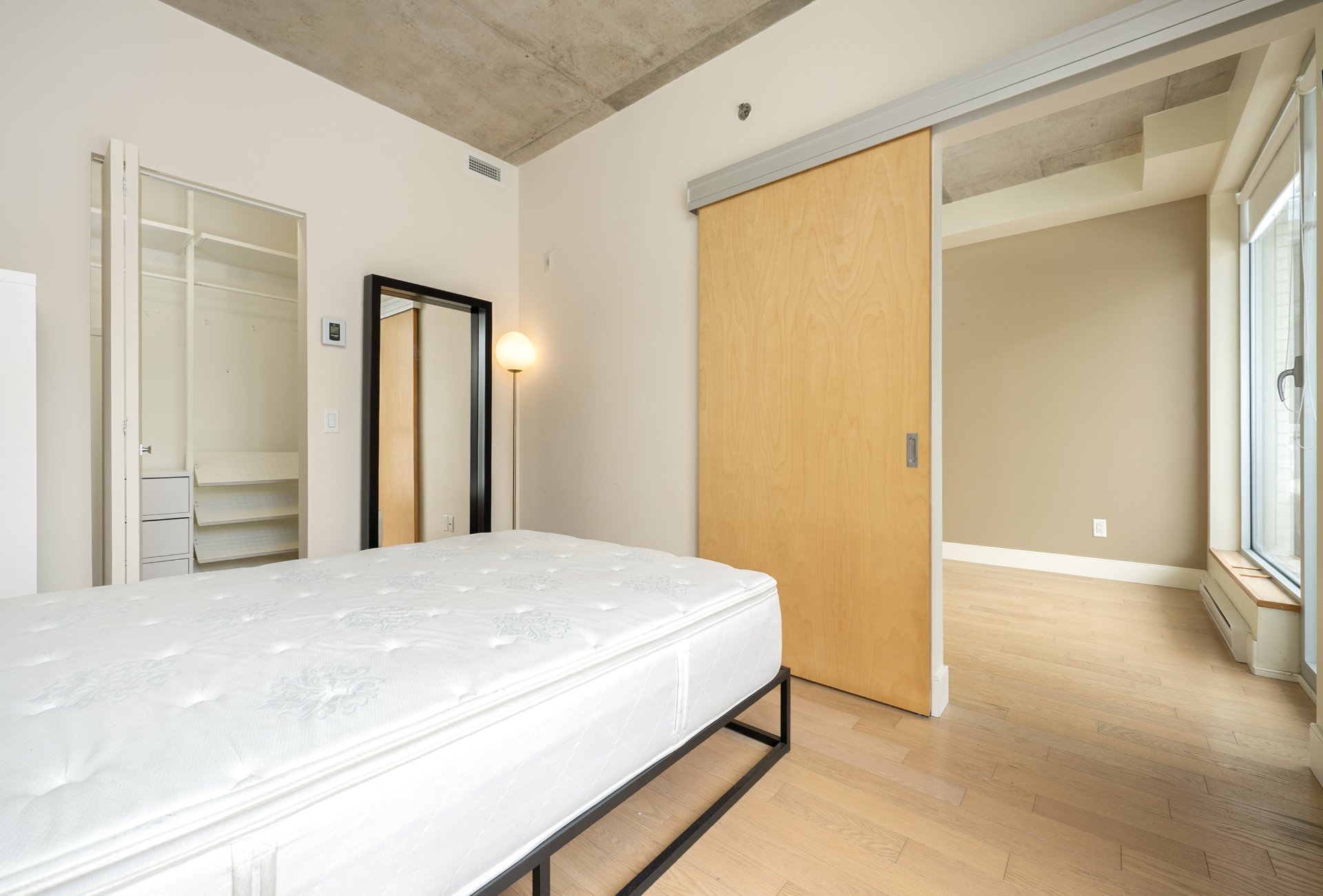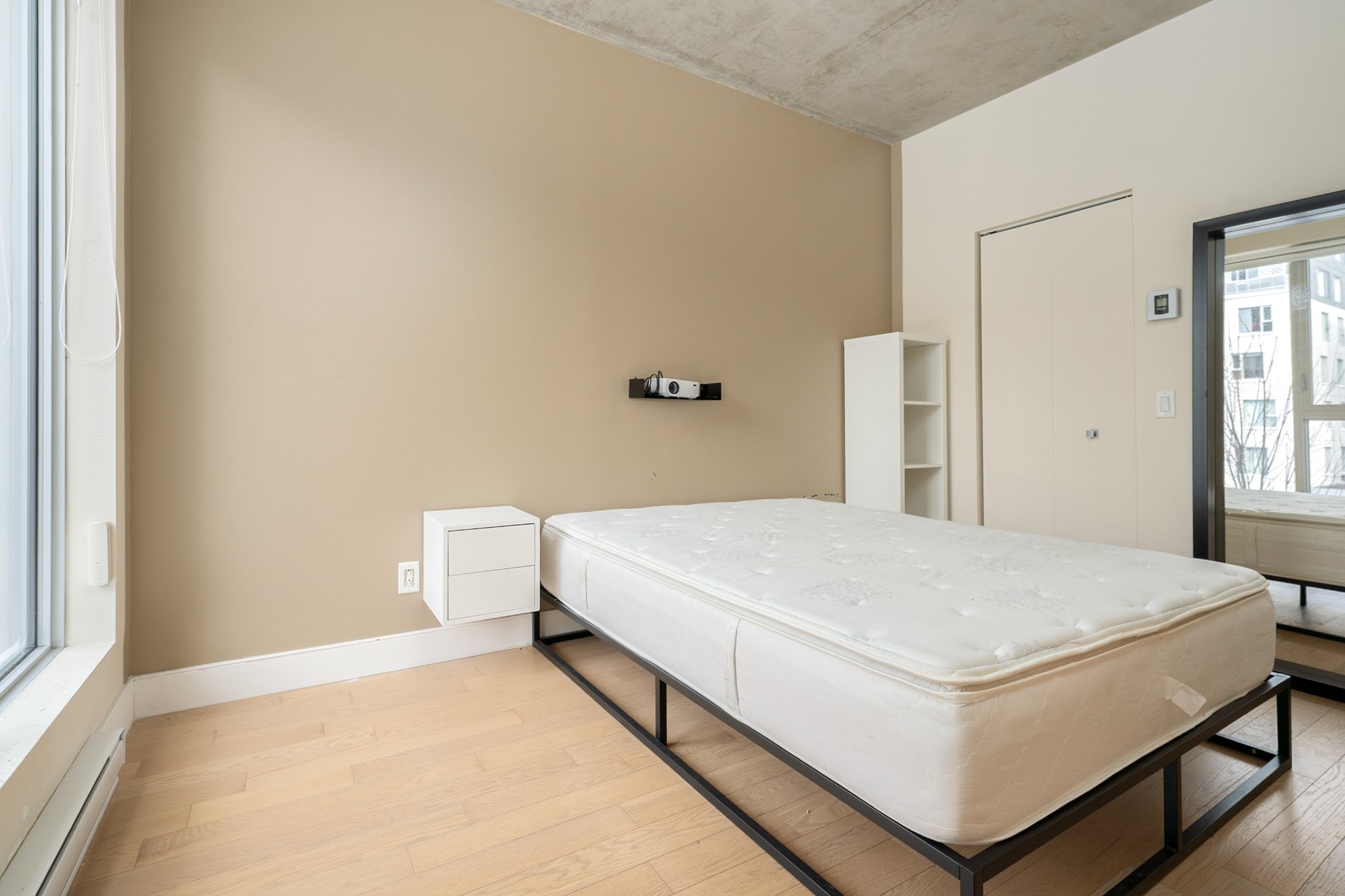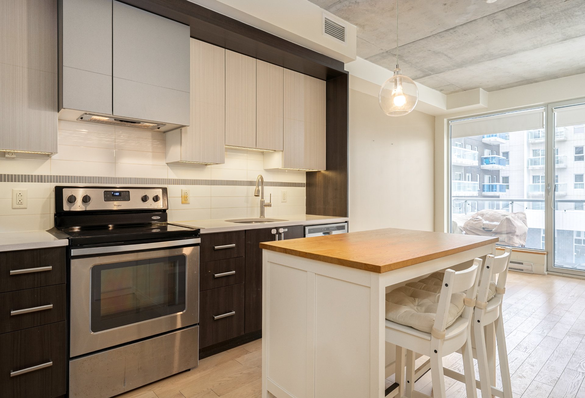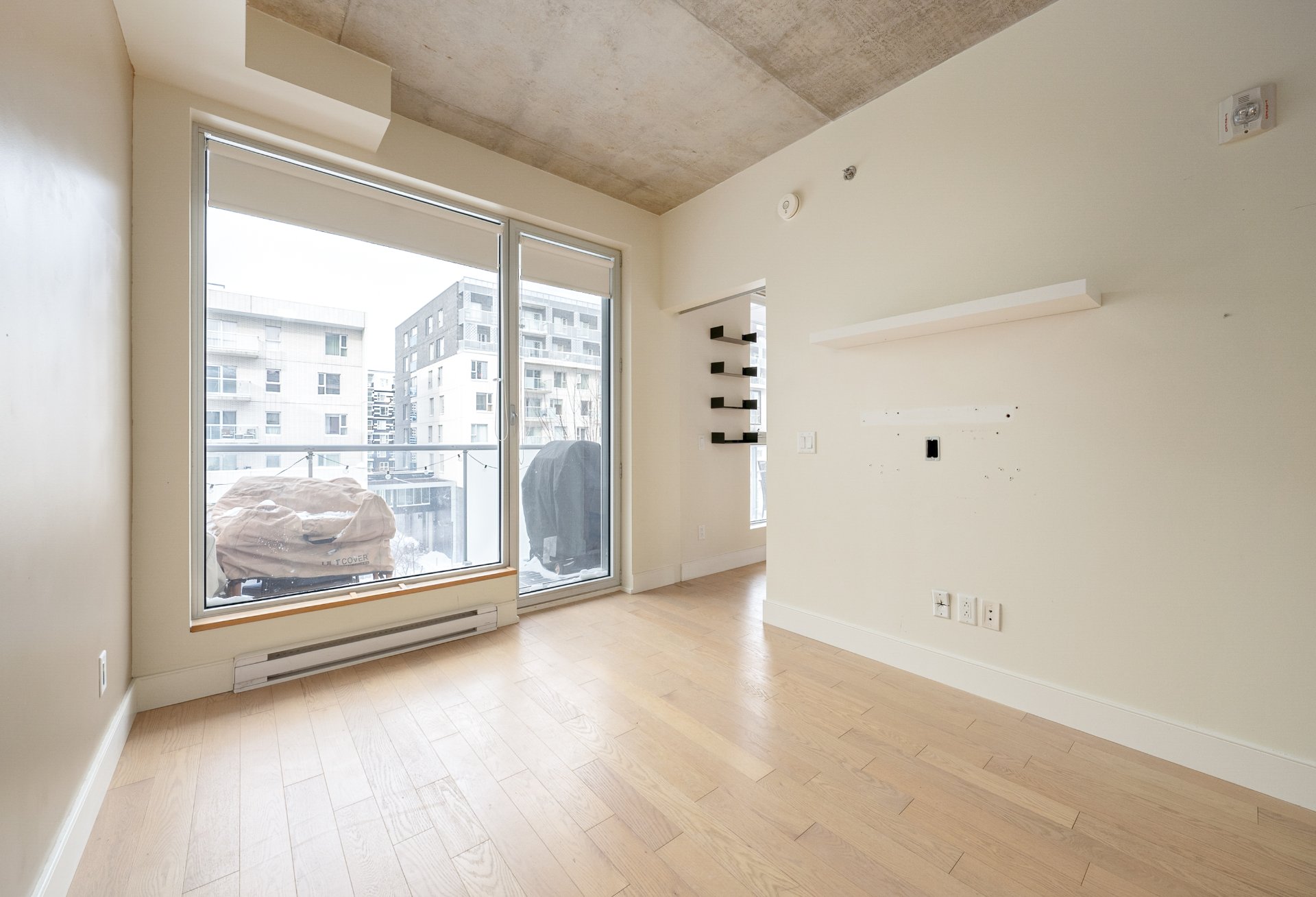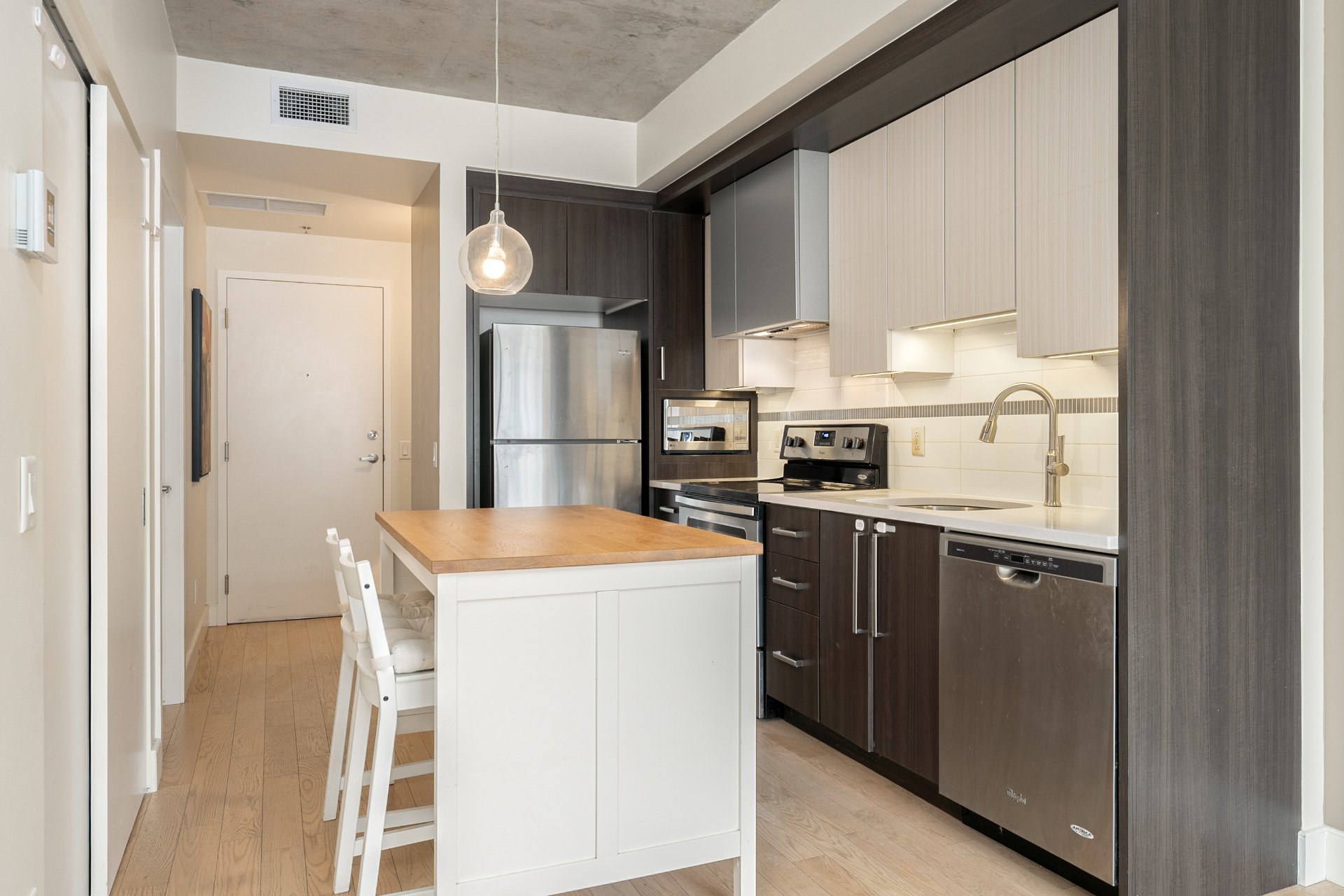 CONDO HIGHLIGHTS-Bright, open-concept living area-Industrial-style concrete ceiling-Functional kitchen -Private balcony off the living room-Closed bedroom with walk-in closet-Bathroom with bathtub and separate glass shower-Stacked washer/dryer discreetly integrated at the entrance-Air exchanger with heating and air conditioning-Dedicated storage space and bike space