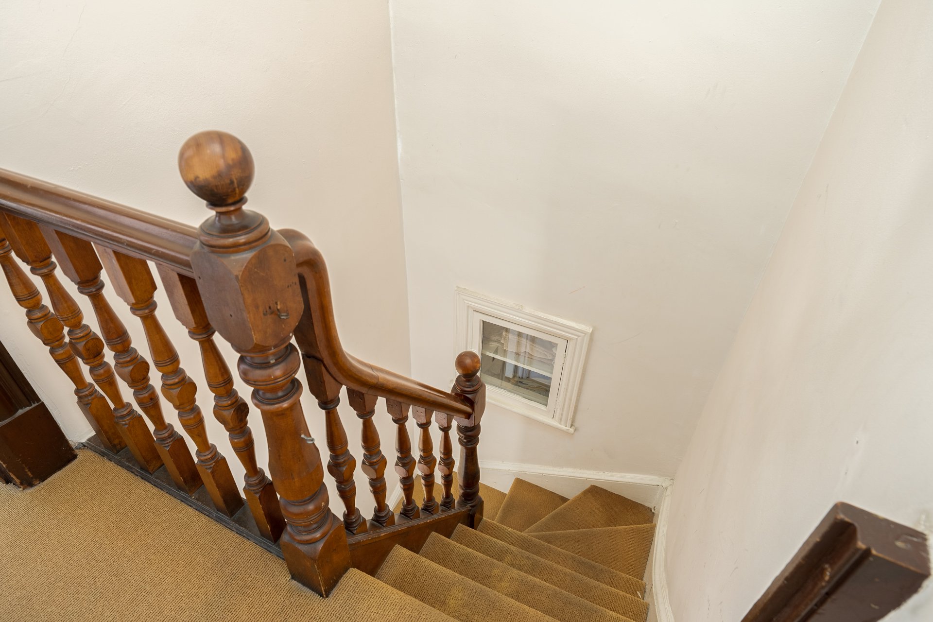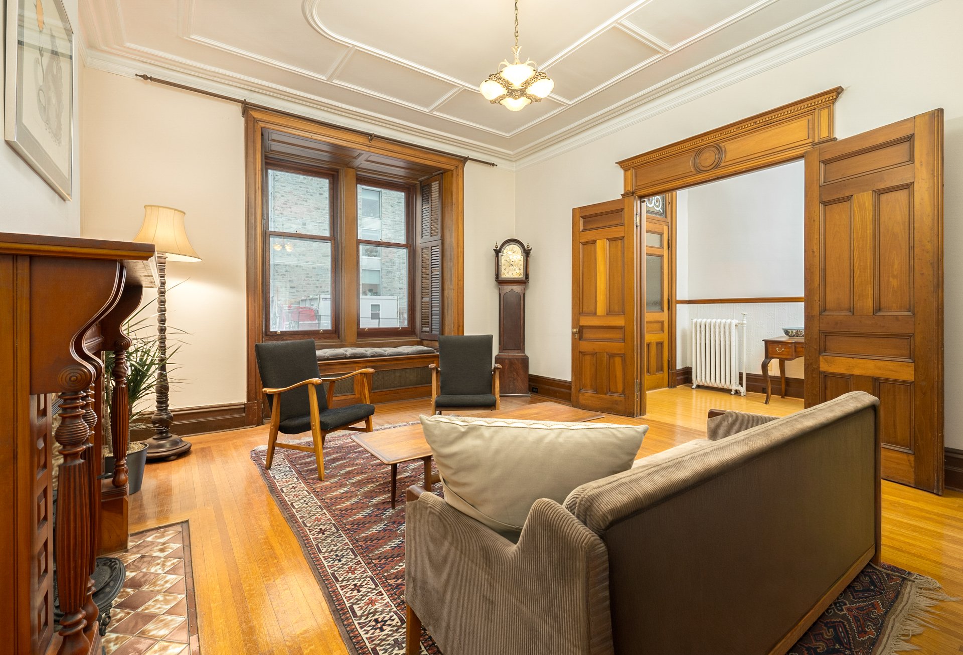 GROUND FLOOR (10'4" ceilings)-Direct street access and a stately stone façade that sets the tone for the home-Expansive living room with large windows, deep ledge, and fireplace-Flexible front room ideal for office or reading nook-Generous dining area with oversized windows-Bright kitchen with dinette and ample workspace-Full bathroom plus additional powder room for convenienceUPPER LEVEL (9'5" ceilings)-Central landing bathed in light from a skylight-Five well-proportioned bedrooms, each with soaring ceilings and distinct charm-One bedroom opens onto a peaceful private balcony -Main bathroom serving the upper bedrooms