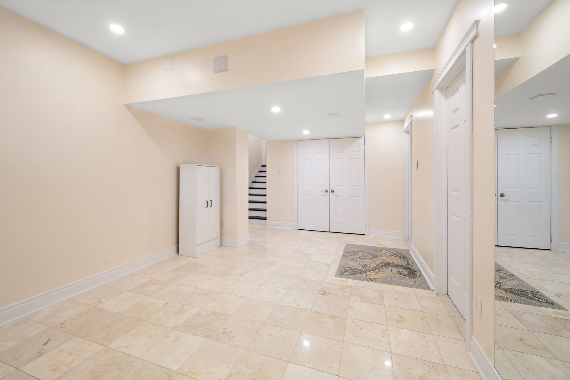 The upper floor offers 3 bedrooms and 2 bathrooms. The primary suite includes a custom walk-in closet, heated bathroom floors, and double vanity. The basement provides two additional bedrooms, two bathrooms, a gym, and a spacious laundry room with heated floors.
