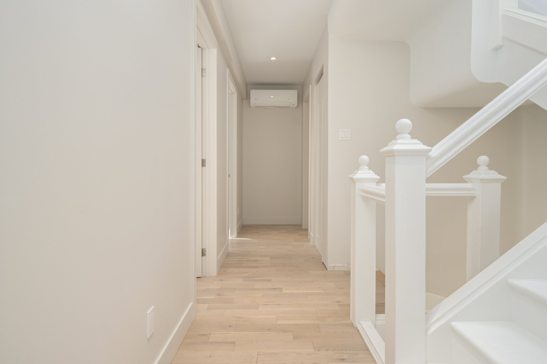SECOND FLOOR - 8'4" ceilings - Three spacious bedrooms, including a serene primary suite with walk-in closet.- Two full bathrooms with heated floors, double vanities, freestanding tubs, and walk-in showers.- Linen closet and wall-mounted heat pump in the hallway, with a skylight overhead.