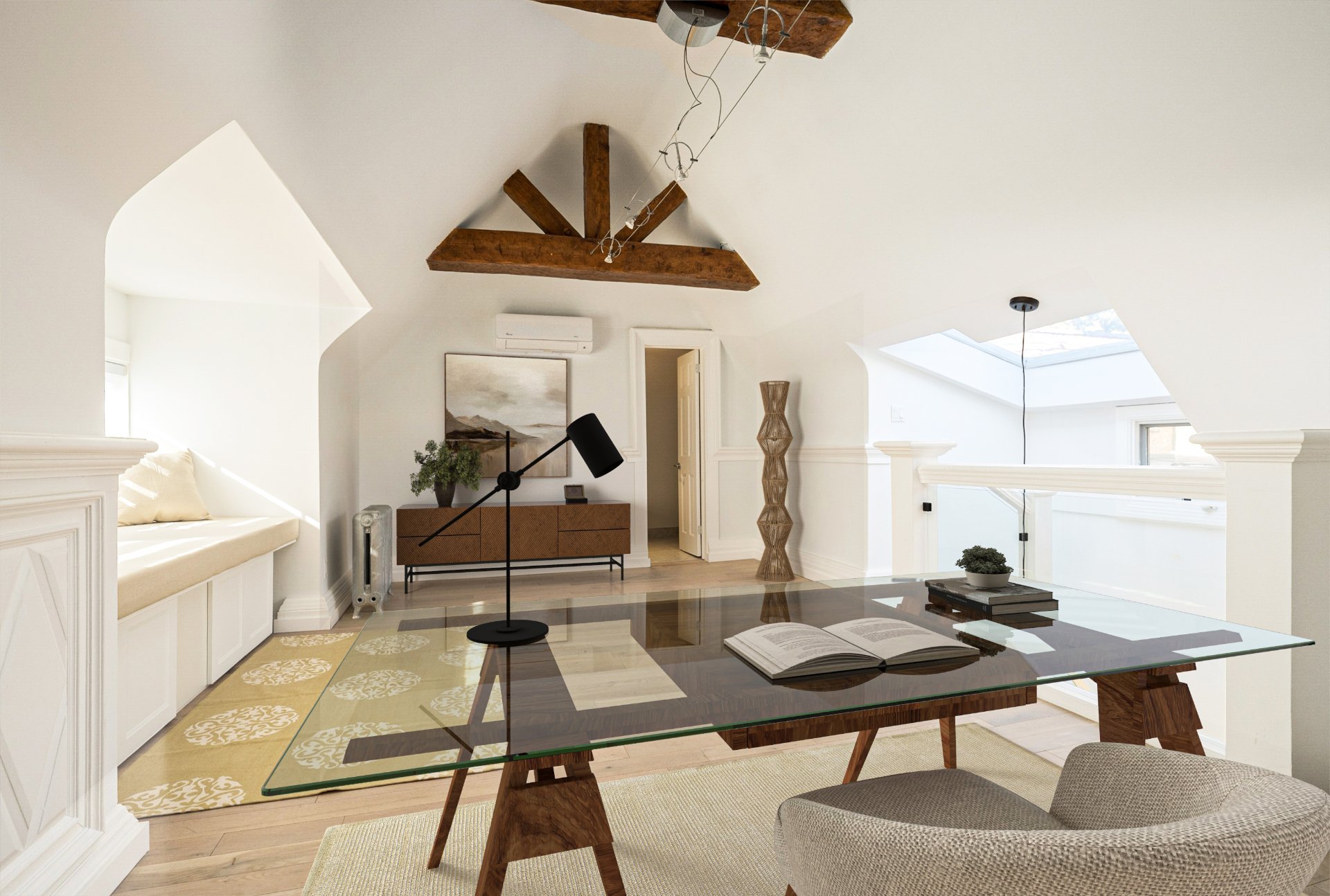 THIRD FLOOR - 10'11" ceilings- Bright open loft space ideal for a family room, playroom, or large office.- Extensive storage solutions and built-in banquette by the windows.- Full bathroom with heated floors and rainfall shower.