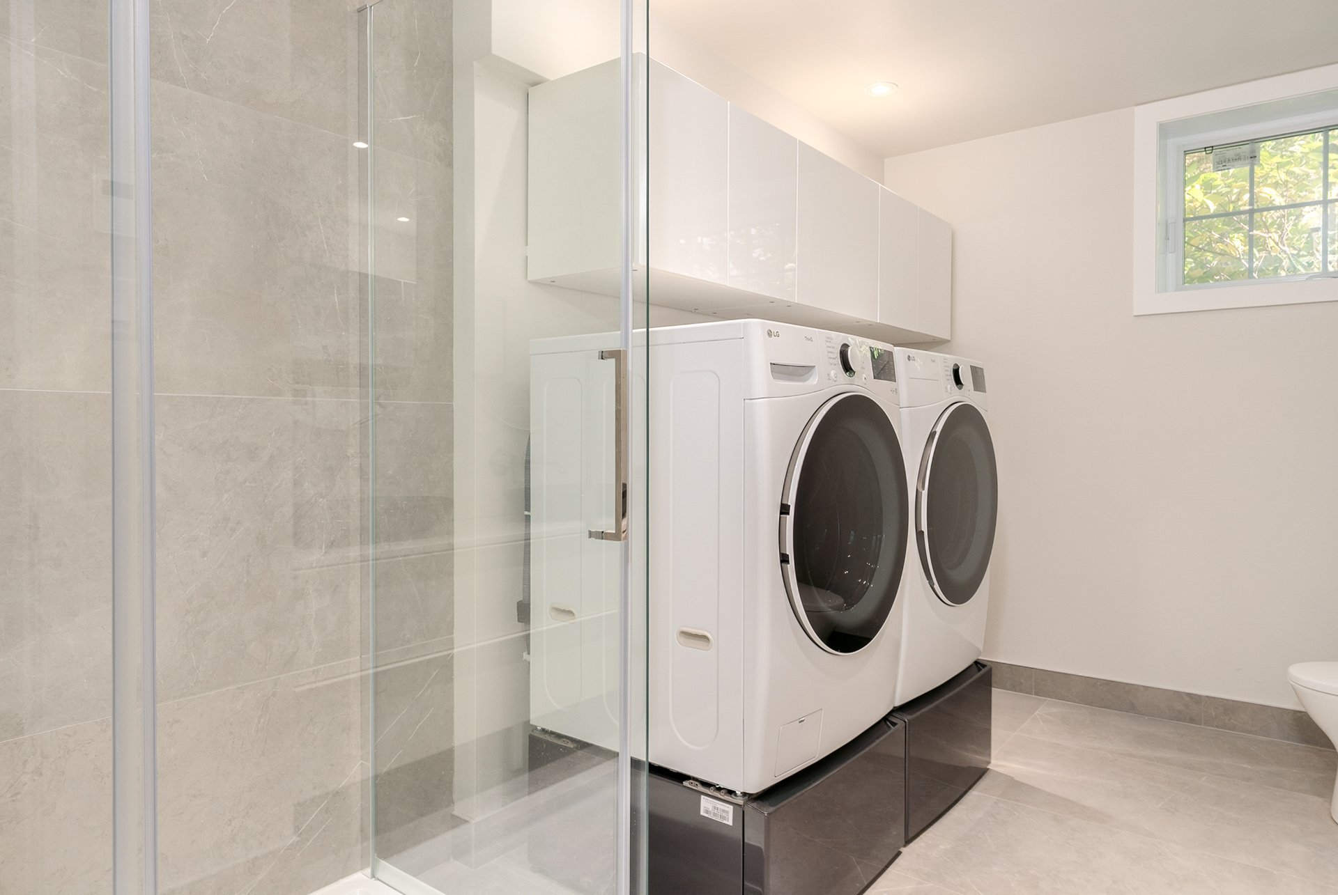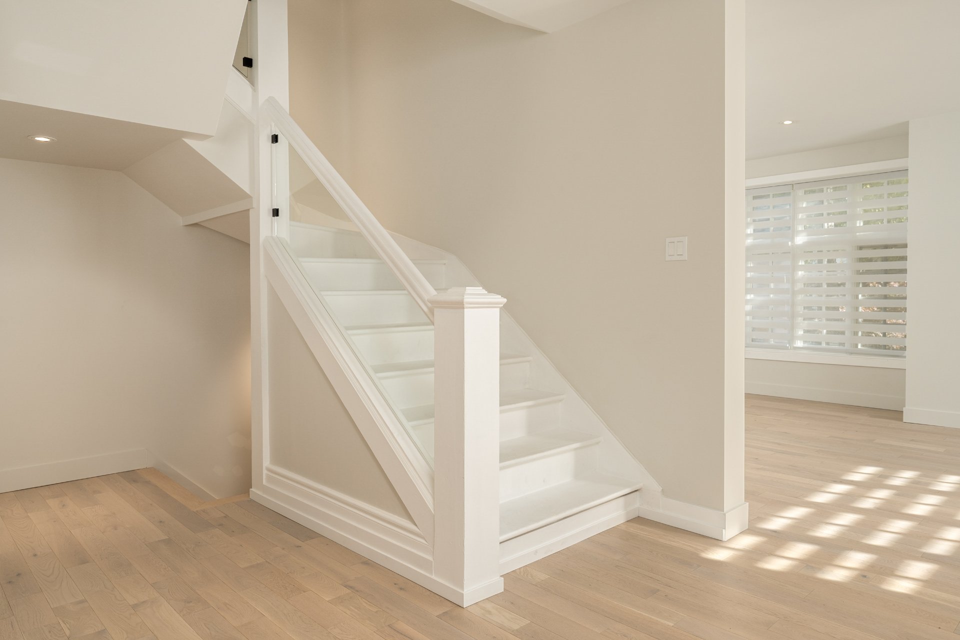 BASEMENT - 7'9" ceilings - Sleek open staircase with integrated storage.- Oversized family room, guest bedroom, and full bathroom with heated floors and laundry area.