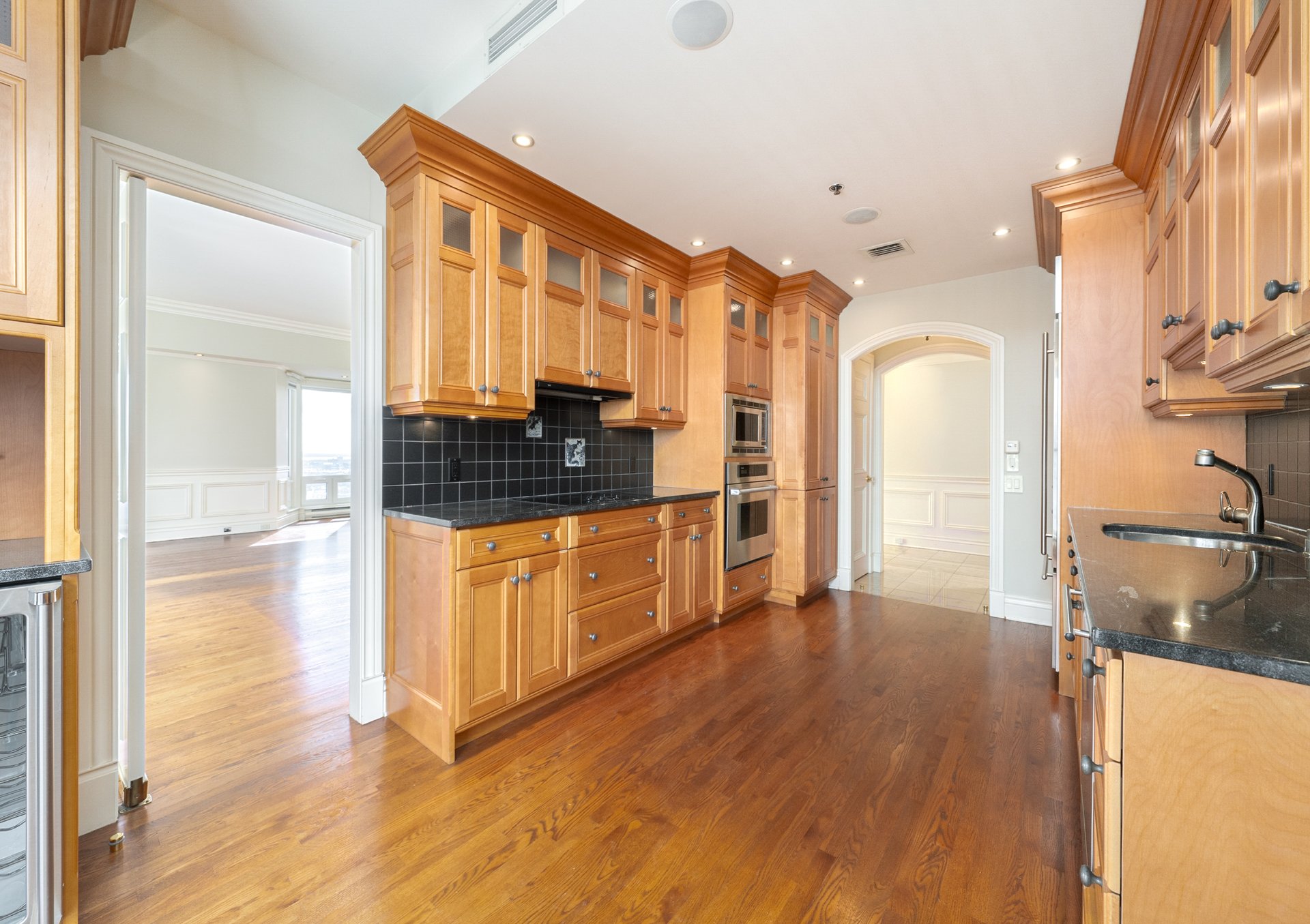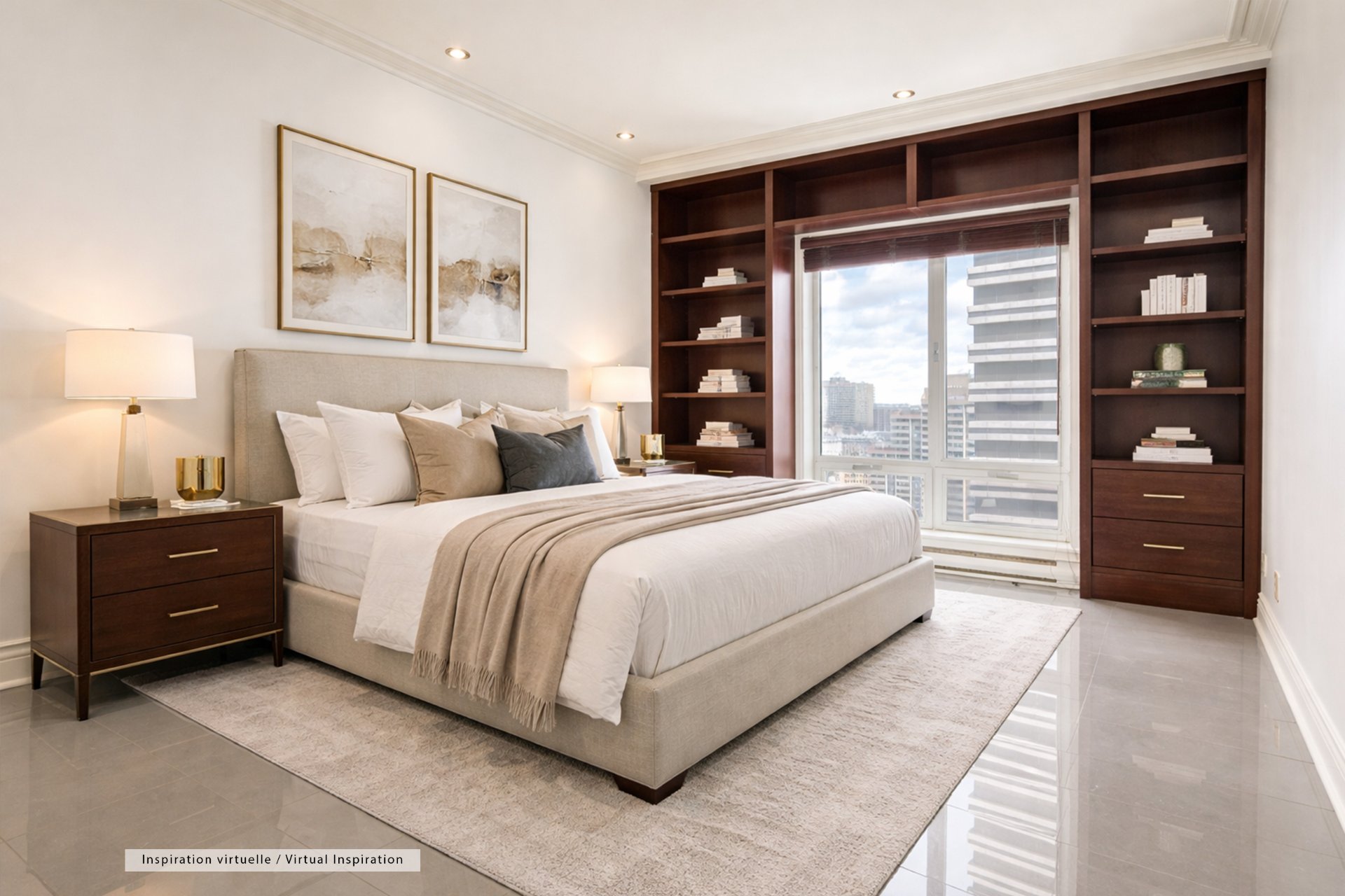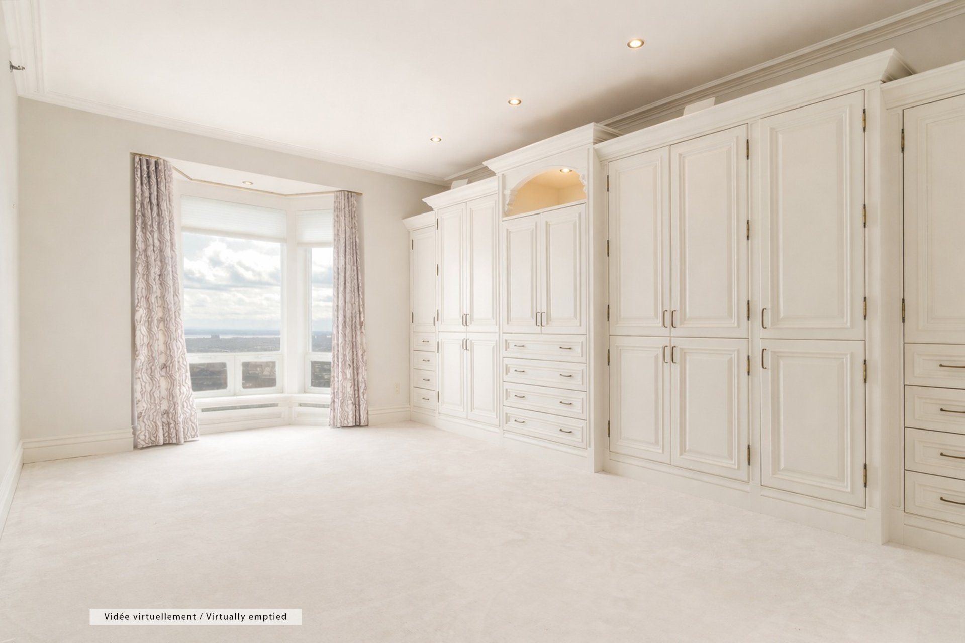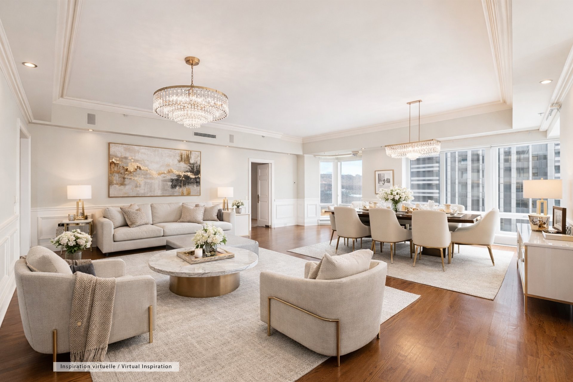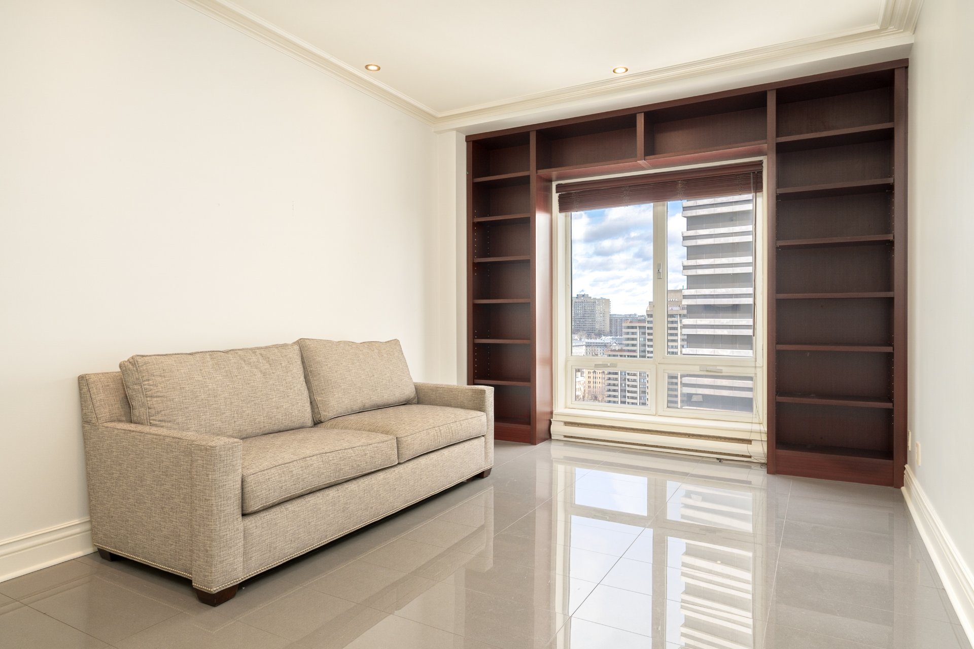 CONDO HIGHLIGHTS-Spacious entrance hall with double closet and adjacent storage-Expansive living room with wraparound windows and detailed moldings-Formal dining area integrated into the open layout-Corner exposure maximizing light and views-Large eat-in kitchen with wood cabinetry, granite counters and ample storage-Space for dinette by the window-Generous primary suite (over 22') with extensive built-ins-Walk-in closet-Marble ensuite with double vanity, glass shower and soaking tub-Open den/office with private balcony access-Second bedroom ideal as guest room or office with built-ins-Second full bathroom with glass shower and quality finishes-Separate laundry area tucked off the entry-Storage locker included #77-Condo fees: 1,369.71$/month