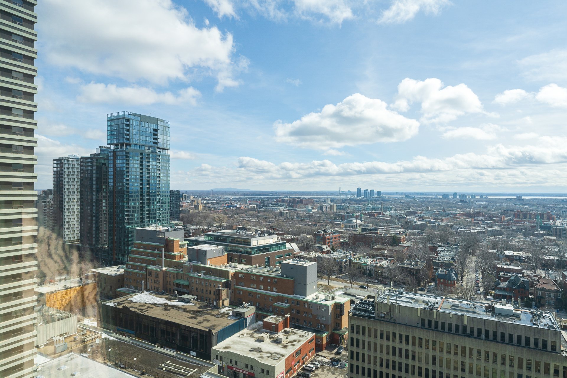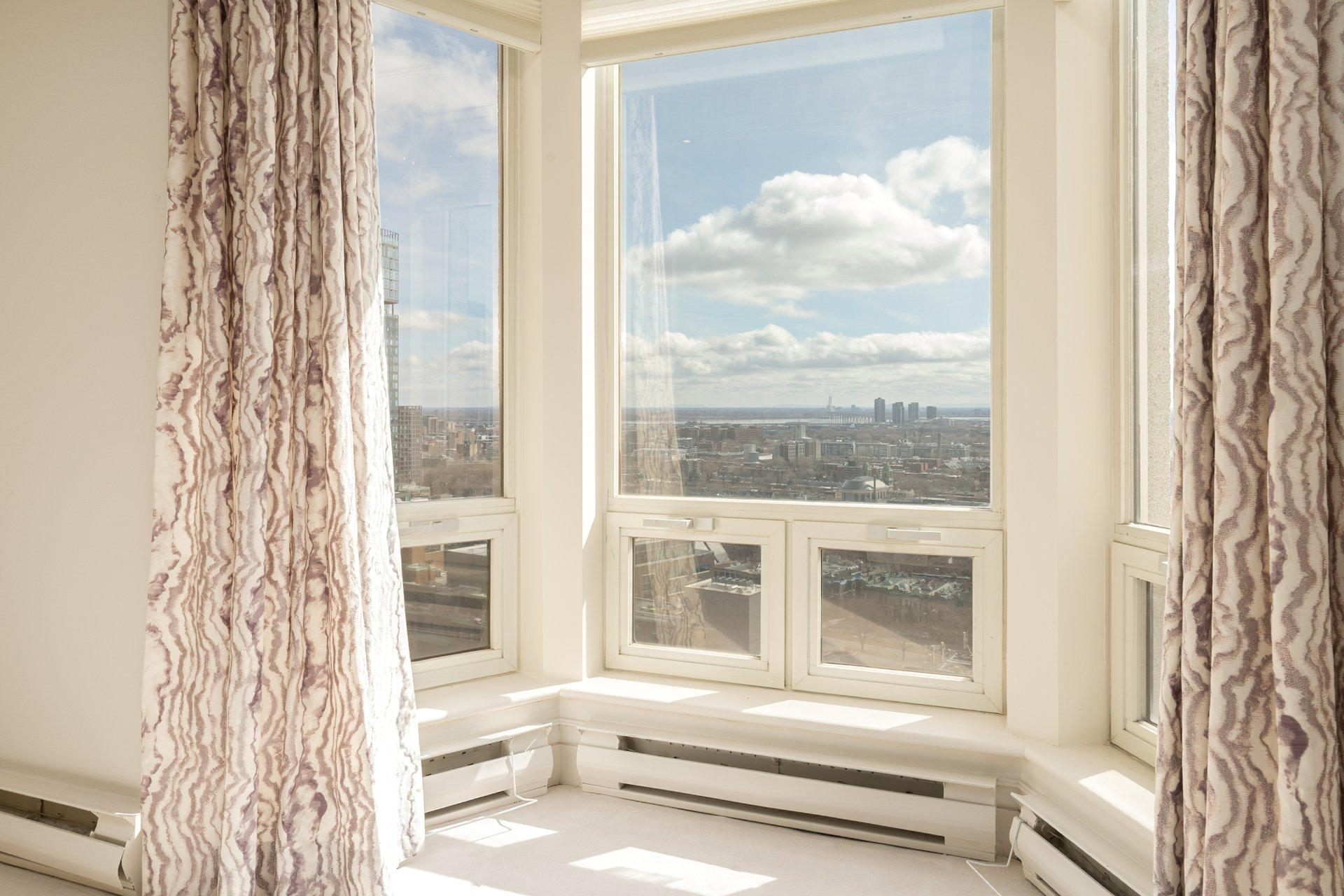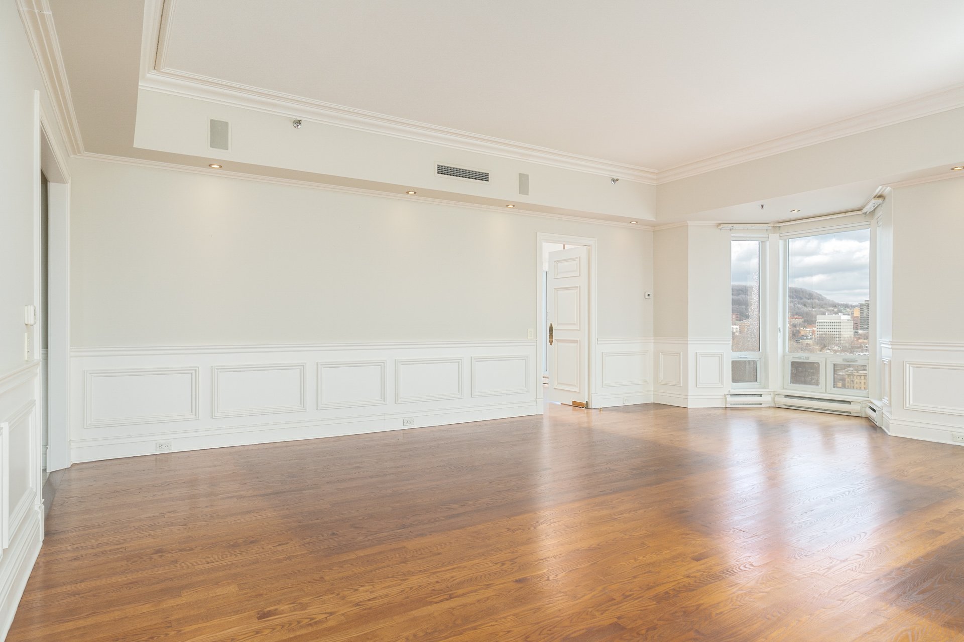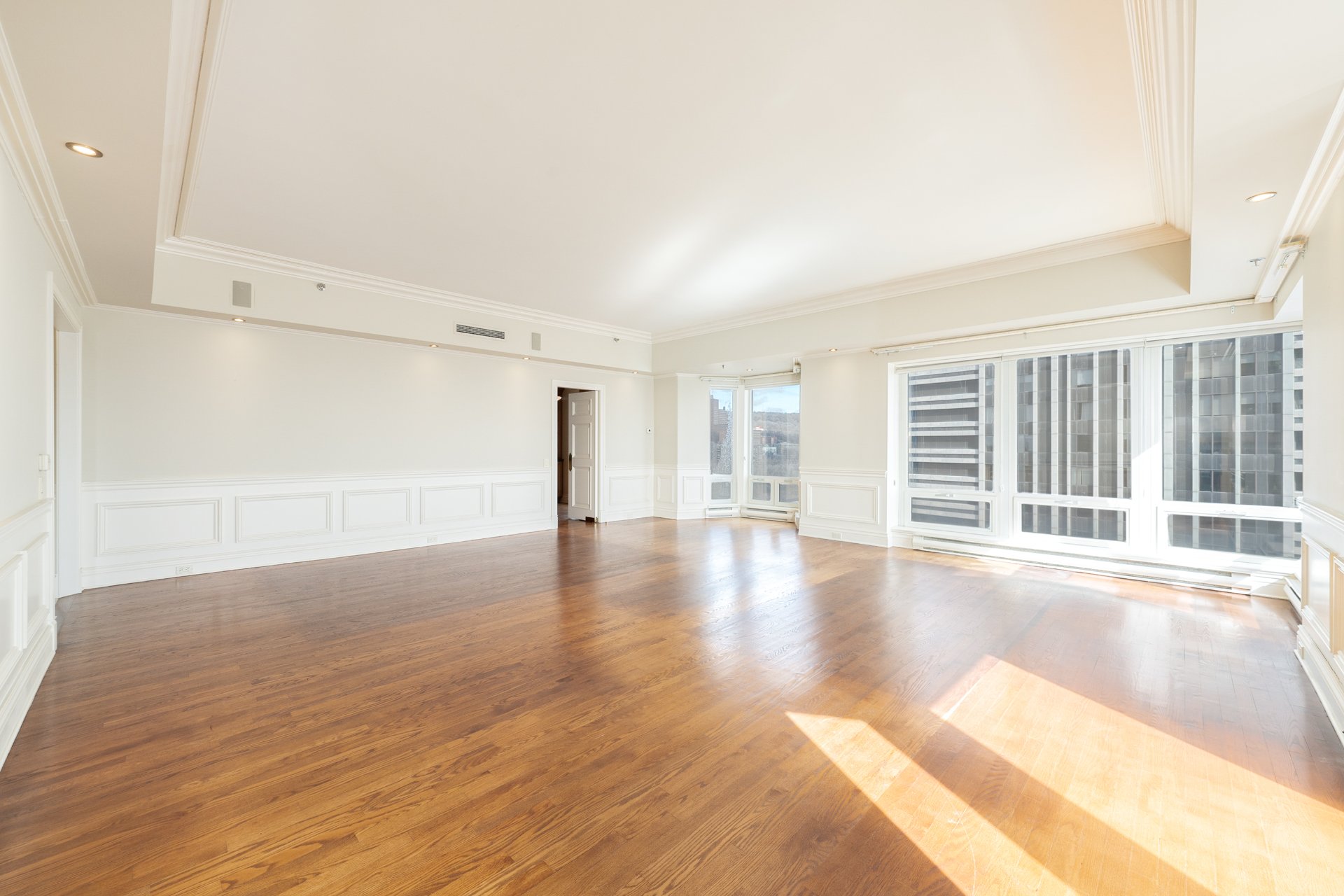 Perched on the 21st floor of the prestigious 1 Wood, this expansive 2,070 sq.ft. residence is characterized by its oversized windows which offer sweeping mountain, city and river views. The generous layout features a grand living and dining area, eat-in kitchen with custom cabinetry, and a refined primary suite with walk-in and marble ensuite. An additional bedroom and a den/office with private south-facing balcony, complete the plan. Full-service building in the heart of Westmount, steps to Greene Avenue, Atwater Metro and downtown.