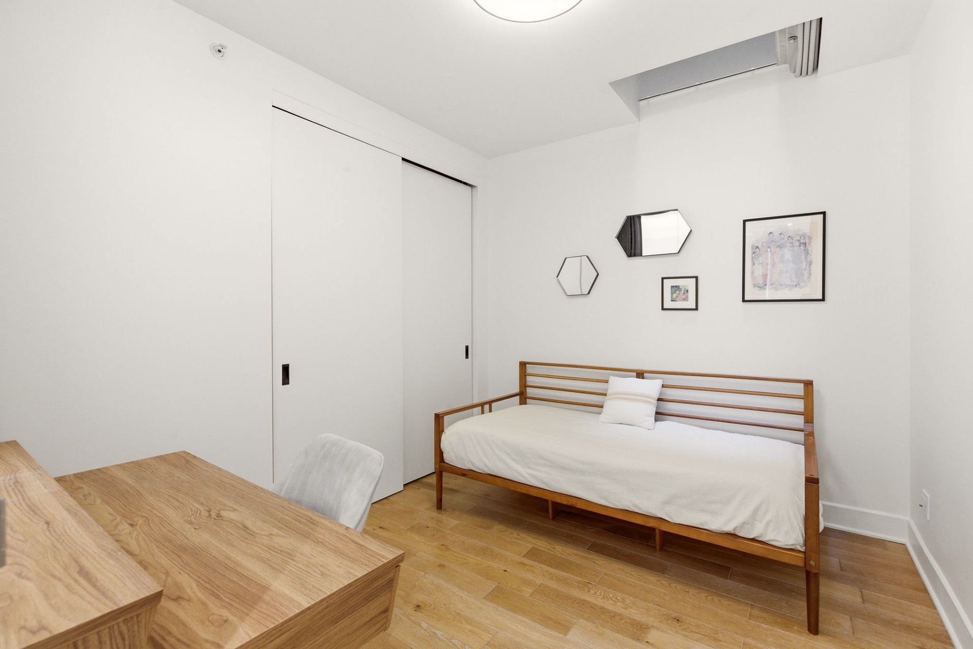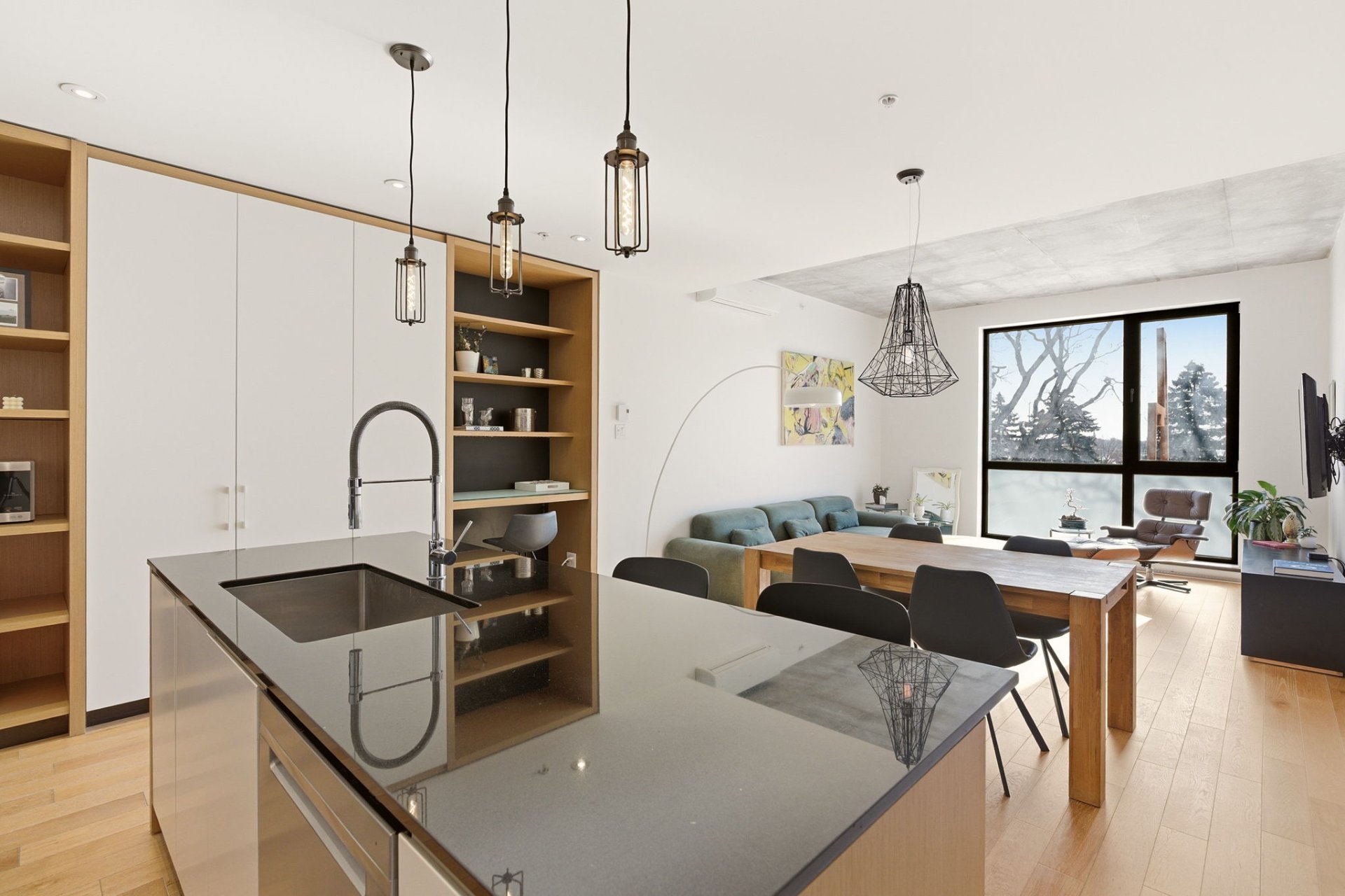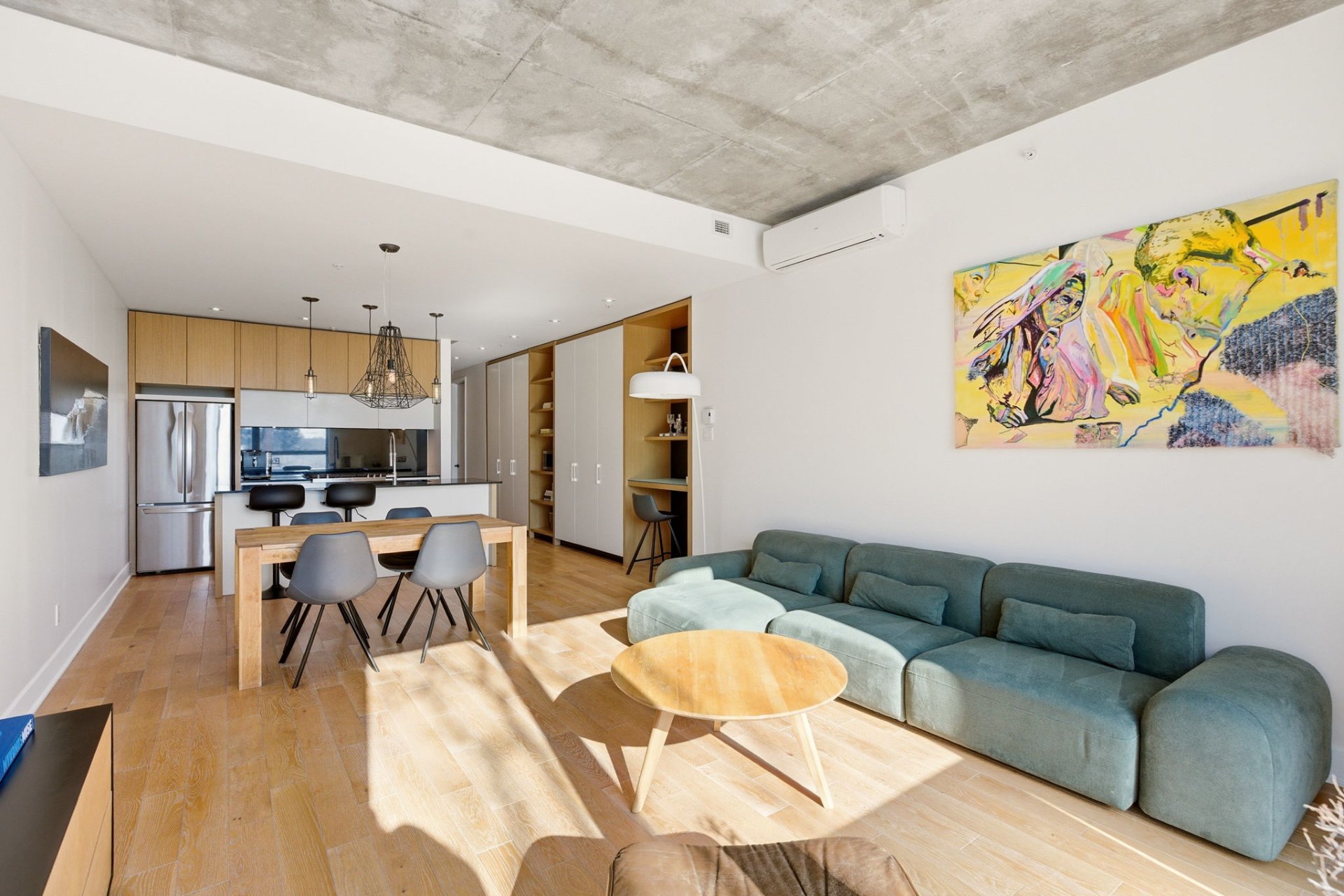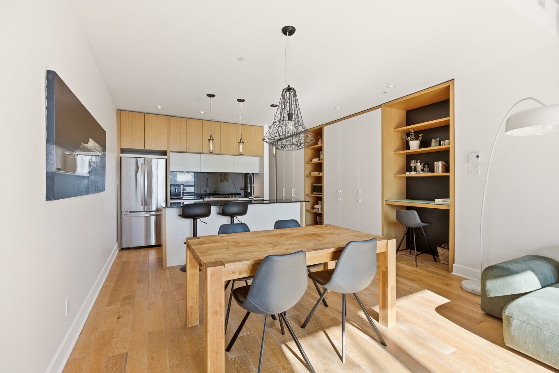 Bright 1,224 sq.ft. residence with high ceilings, private entrance and a spectacular rooftop terrace with sweeping river and skyline views. Offering 2 bedrooms plus an office and 2 bathrooms, the space blends warmth and modern design with wood floors, expansive windows and a sleek kitchen with island. Exceptionally quiet with outstanding soundproofing and a rare sense of privacy. Set in the heart of the Old Port, steps to the waterfront, cafés and parks, with easy highway access. Includes garage parking with car charger.