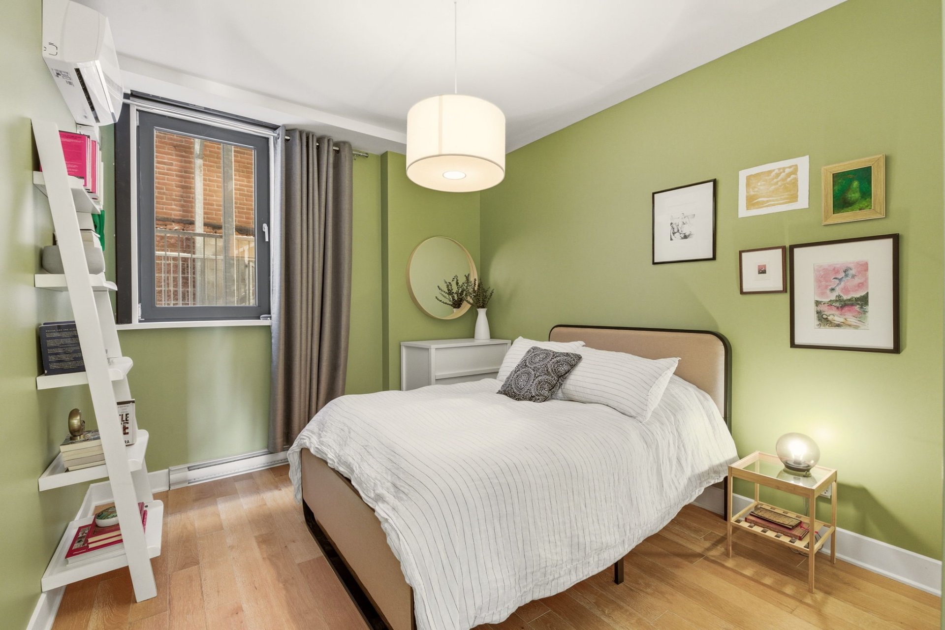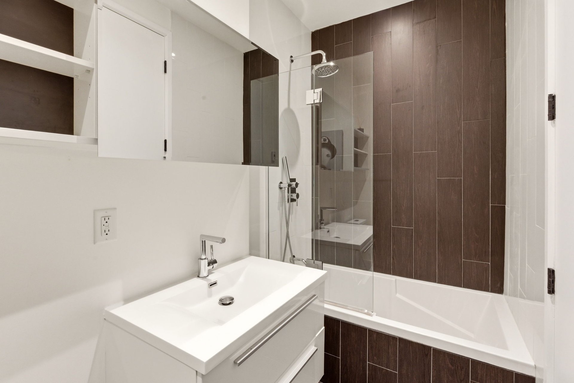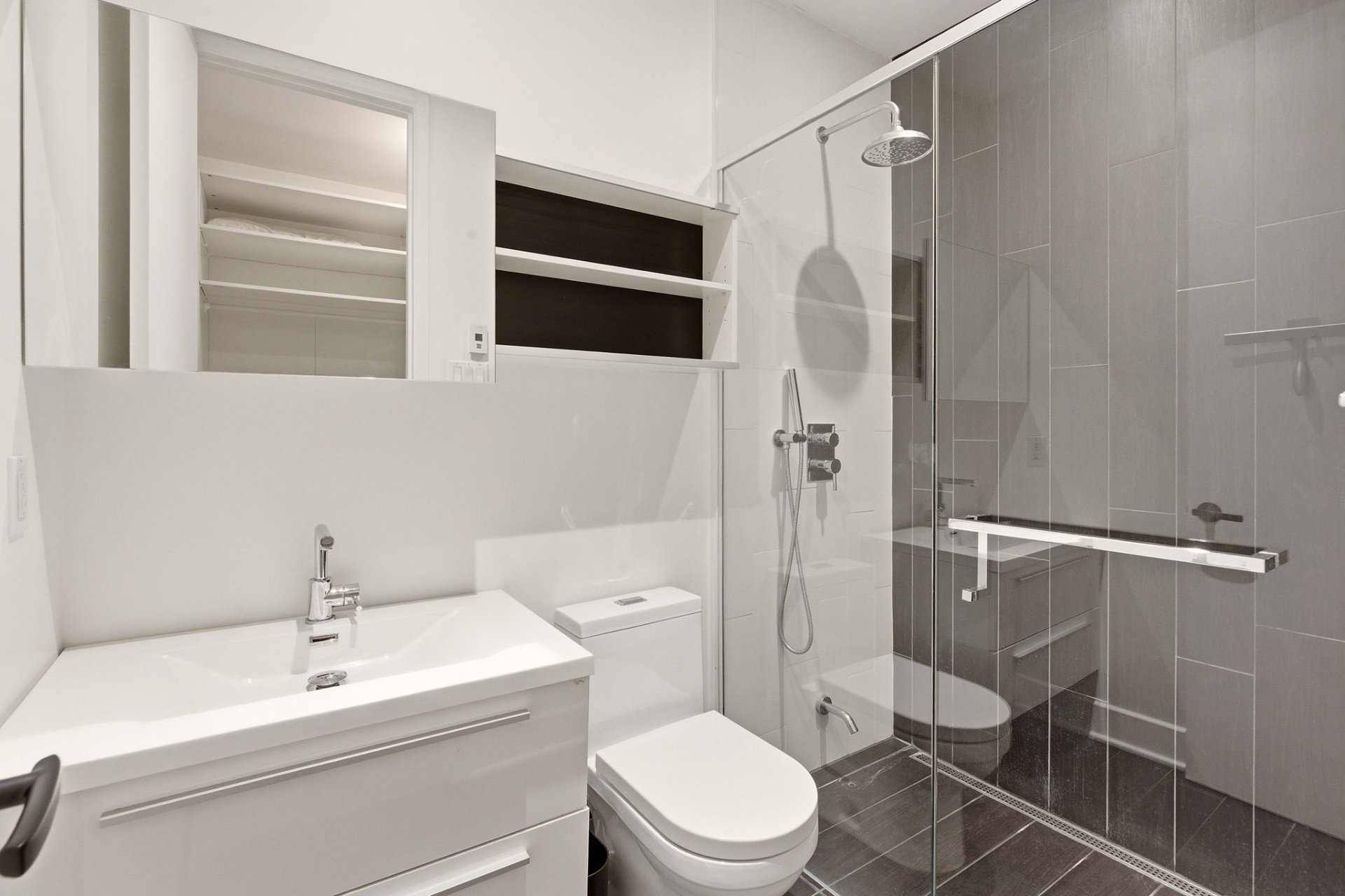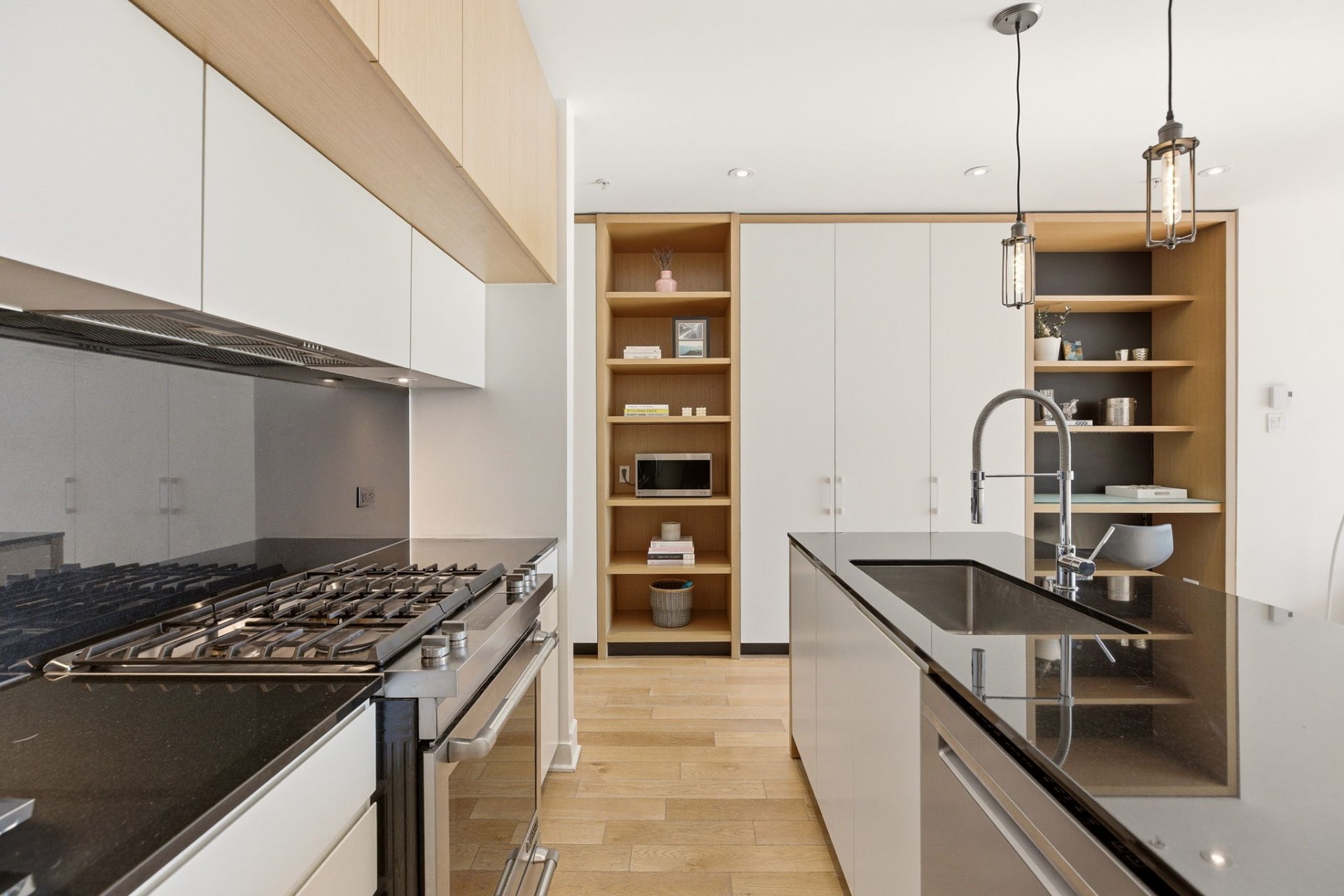 Bright 1,224 sq.ft. residence with high ceilings, private entrance and a spectacular rooftop terrace with sweeping river and skyline views. Offering 2 bedrooms plus an office and 2 bathrooms, the space blends warmth and modern design with wood floors, expansive windows and a sleek kitchen with island. Exceptionally quiet with outstanding soundproofing and a rare sense of privacy. Set in the heart of the Old Port, steps to the waterfront, cafés and parks, with easy highway access. Includes garage parking with car charger.