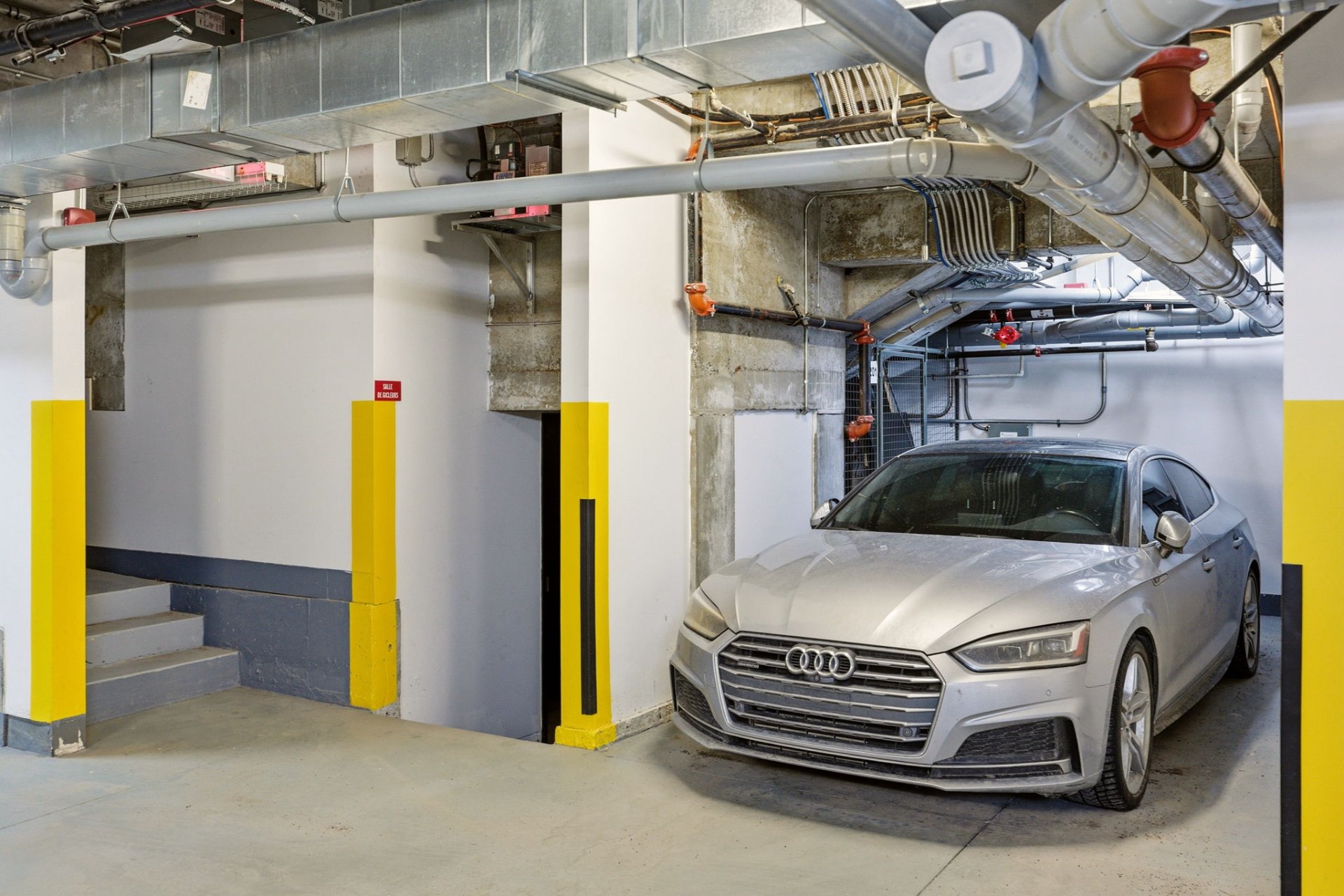CONDO HIGHLIGHTS:-Bright open-concept living and dining area with high ceilings, large windows and excellent flow-Modern building with quality construction and superior soundproofing; owners report never hearing neighbours-Sleek kitchen with central island, gas stove, quality finishes and ample storage-Custom built-ins combining closed storage, open shelving and a discreet integrated workstation-Warm wood floors throughout the main living spaces-Spacious primary bedroom with walk-in closet and ensuite bathroom-Second bedroom plus separate office space, ideal for working from home or accommodating guests-Two full bathrooms with clean, modern finishes-Wall-mounted A/C units in the living room and bedrooms for optimal comfort-In-unit washer and dryer-Private feel throughout with minimal shared walls exposure from main living areas-Locker included #201-1 garage parking space with EV charging capability #201