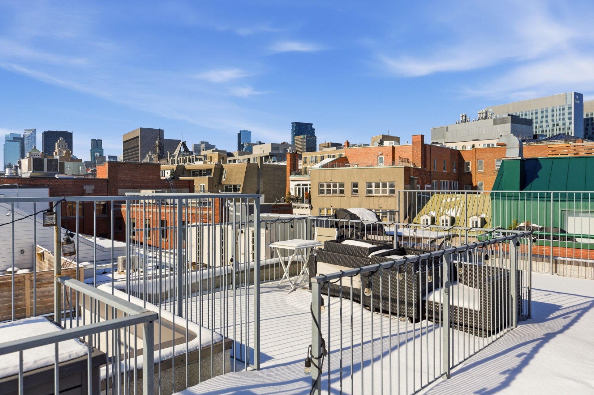 -Rooftop terrace with panoramic views: Private outdoor space ideal for dining, entertaining or relaxing, with sweeping views of the water, marina, Old Port Ferris wheel, Jacques-Cartier Bridge and the Montréal skyline. A rare extension of the living space.