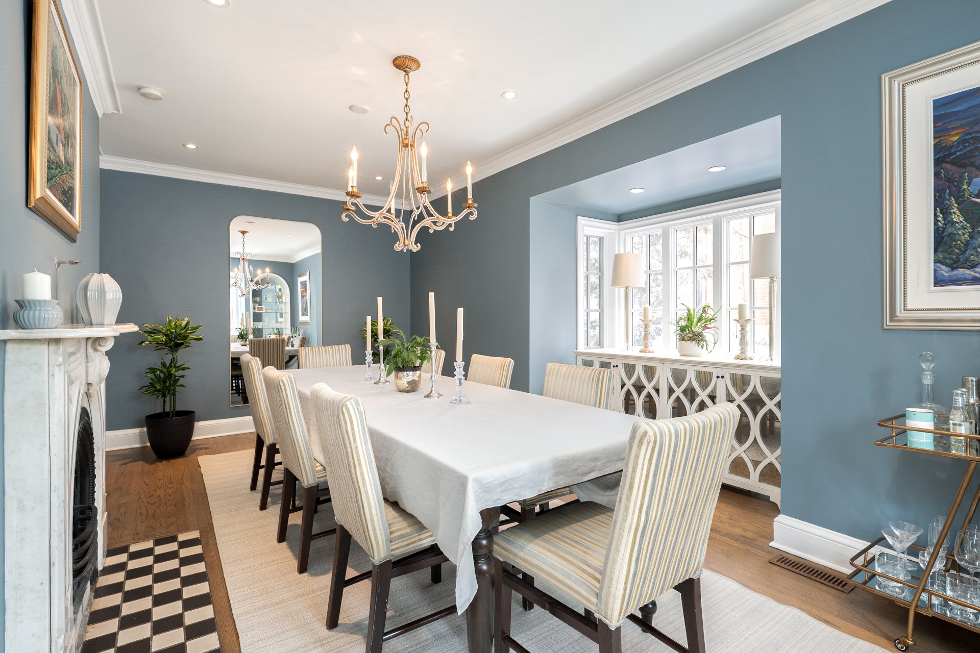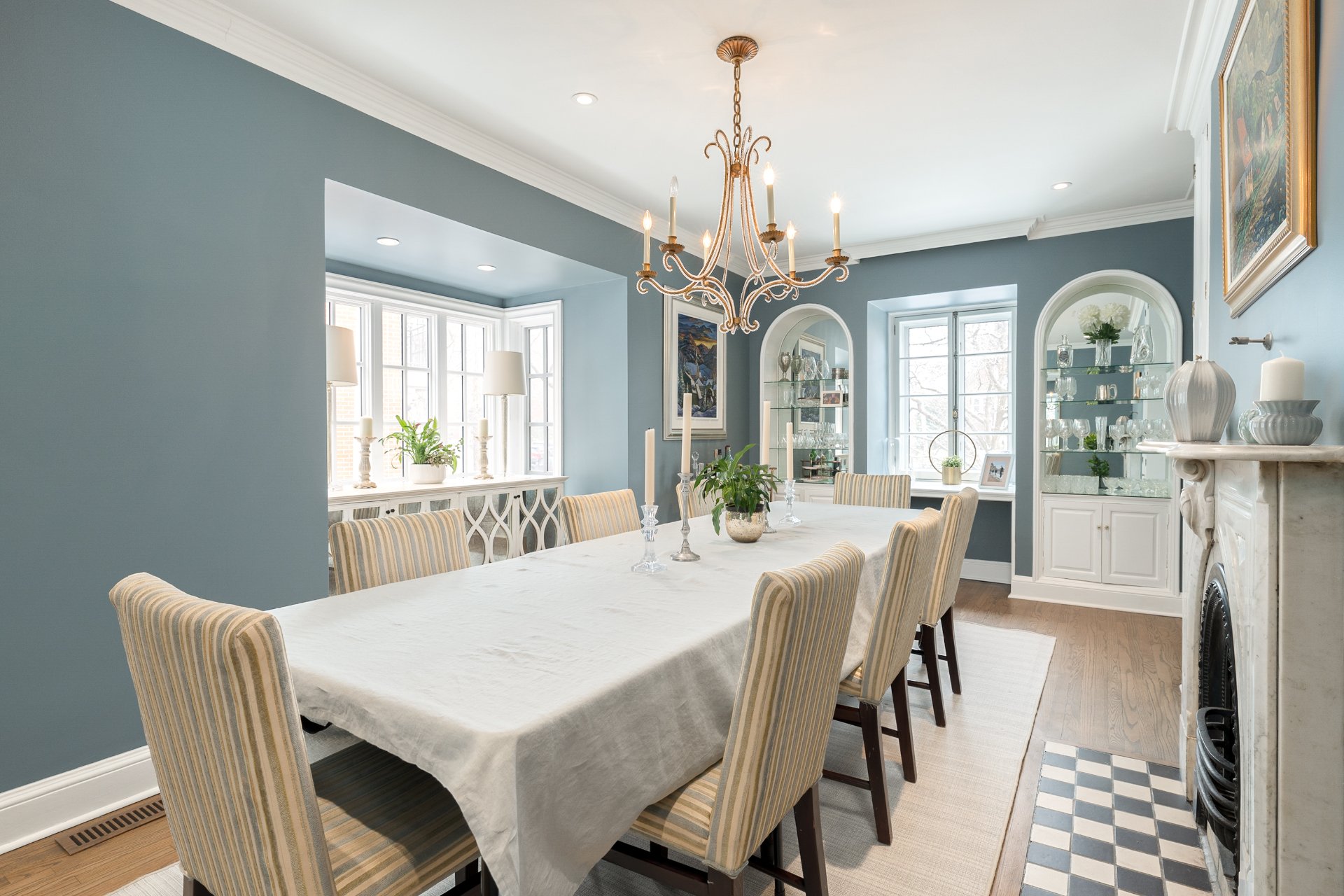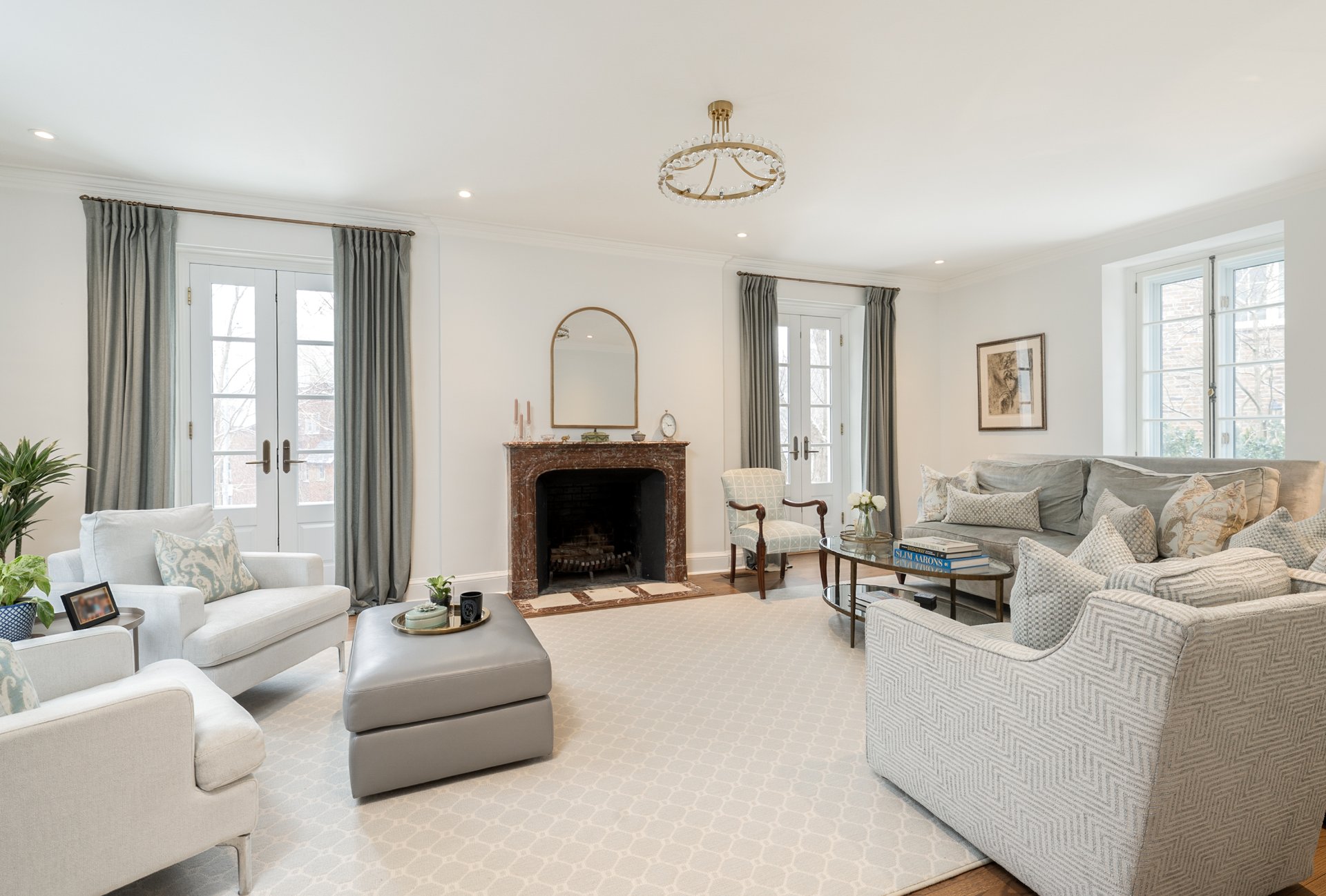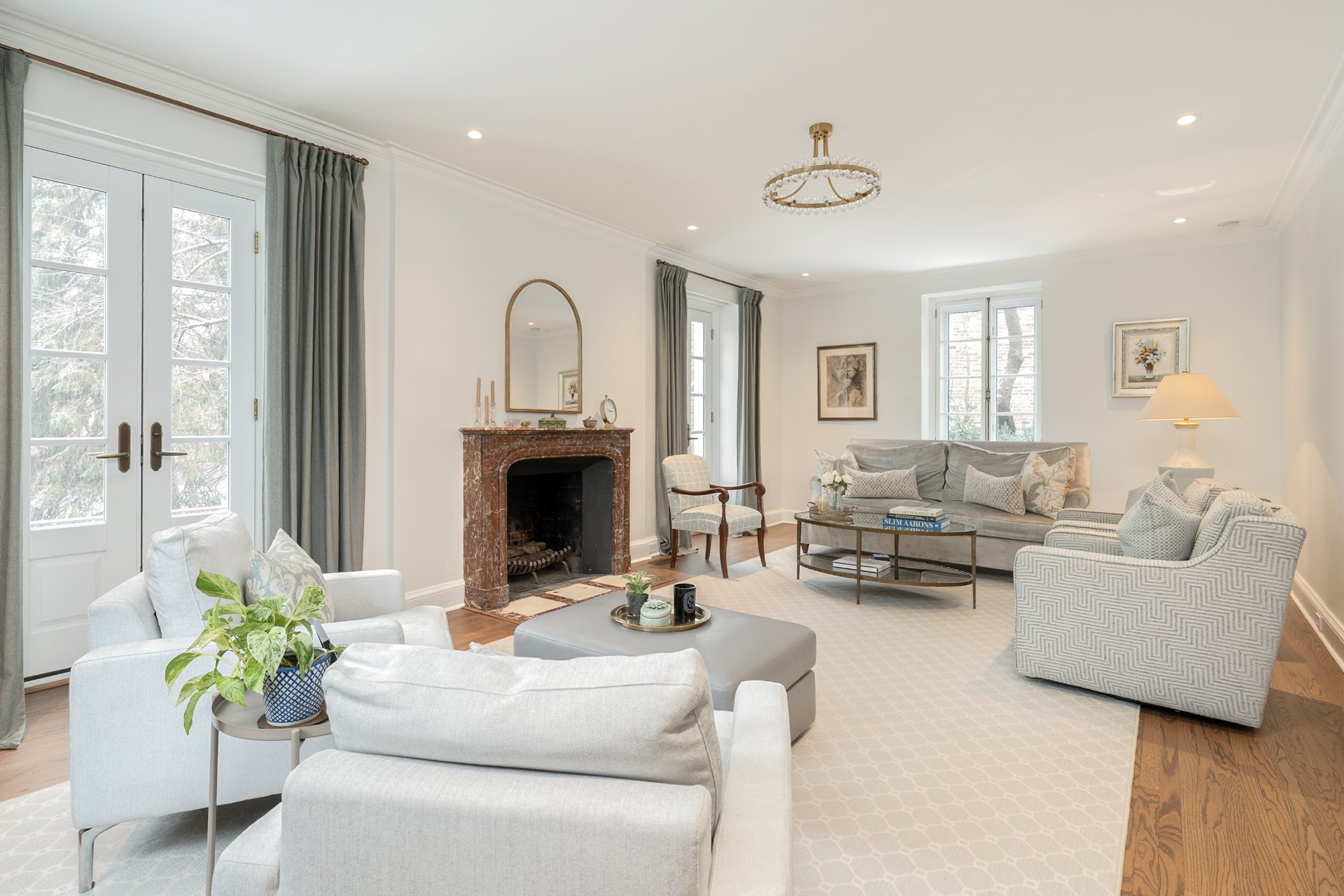 MAIN FLOOR-Classic cross-hall layout with reconfigured flow between kitchen and dining areas -Living room with fireplace and French doors opening to the beautifully manicured stone interior courtyard-Custom kitchen with integrated family lounge area and updated finishes -Formal separate dining room with large windows and second fireplace adjacent to the kitchen, ideal for elegant hosting -Heated flooring in key areas and refined architectural details throughout