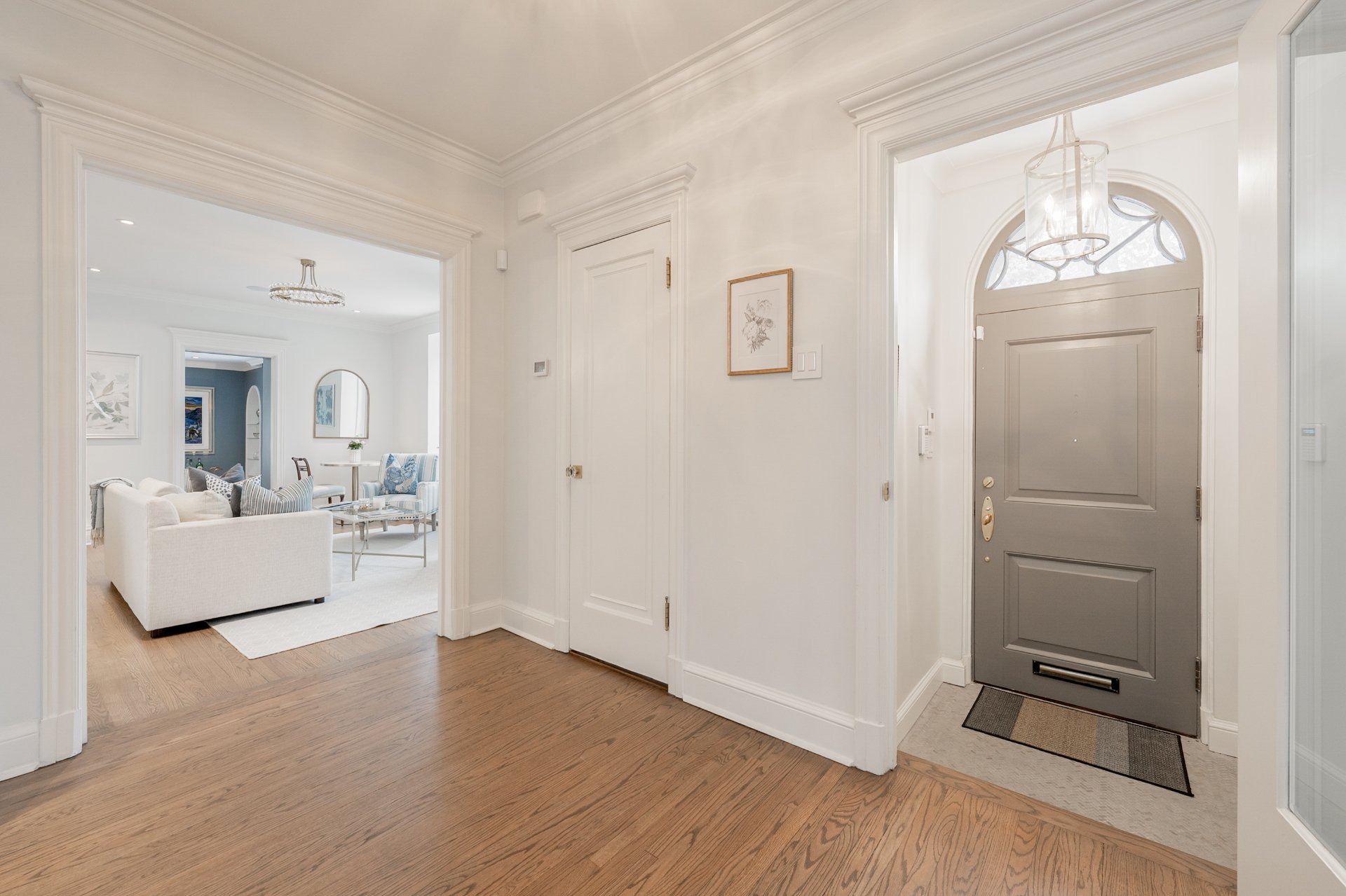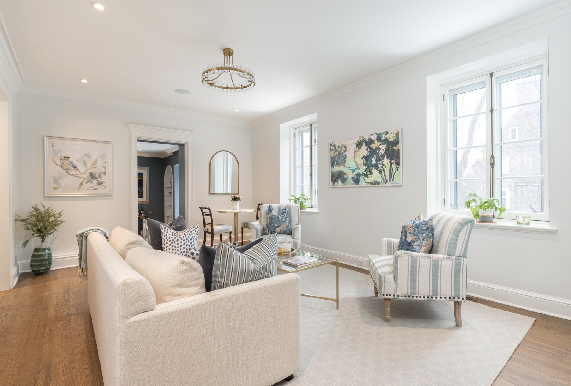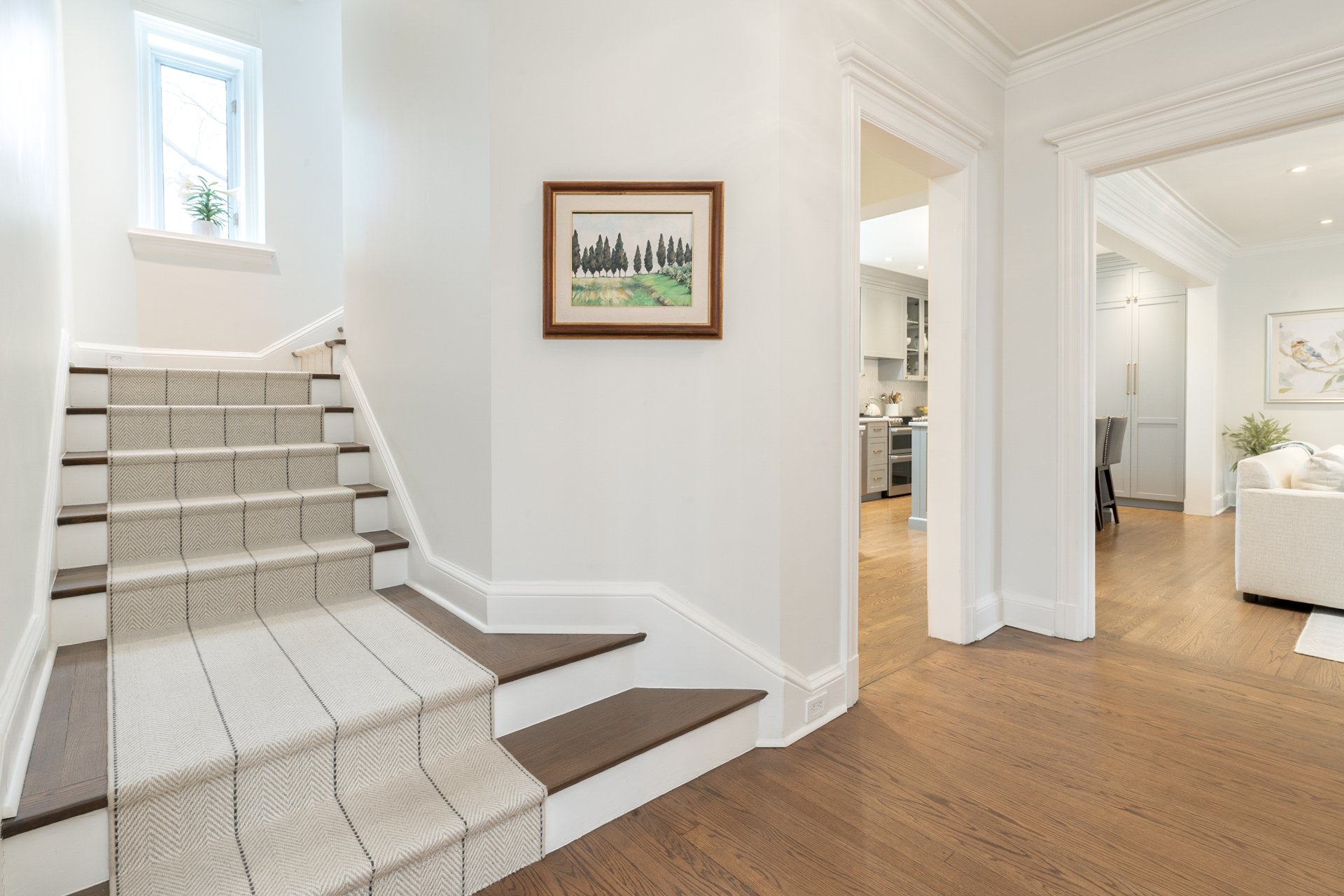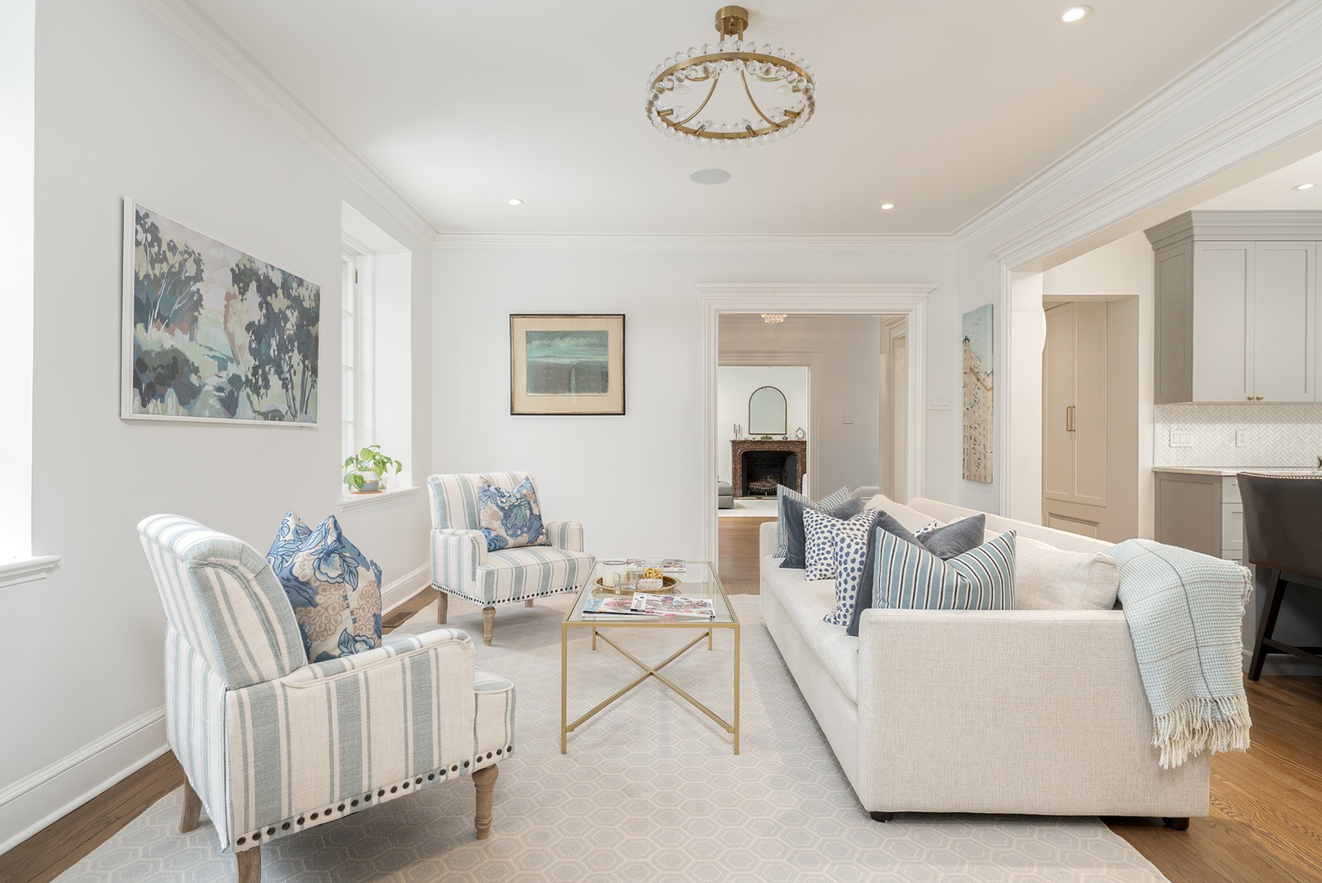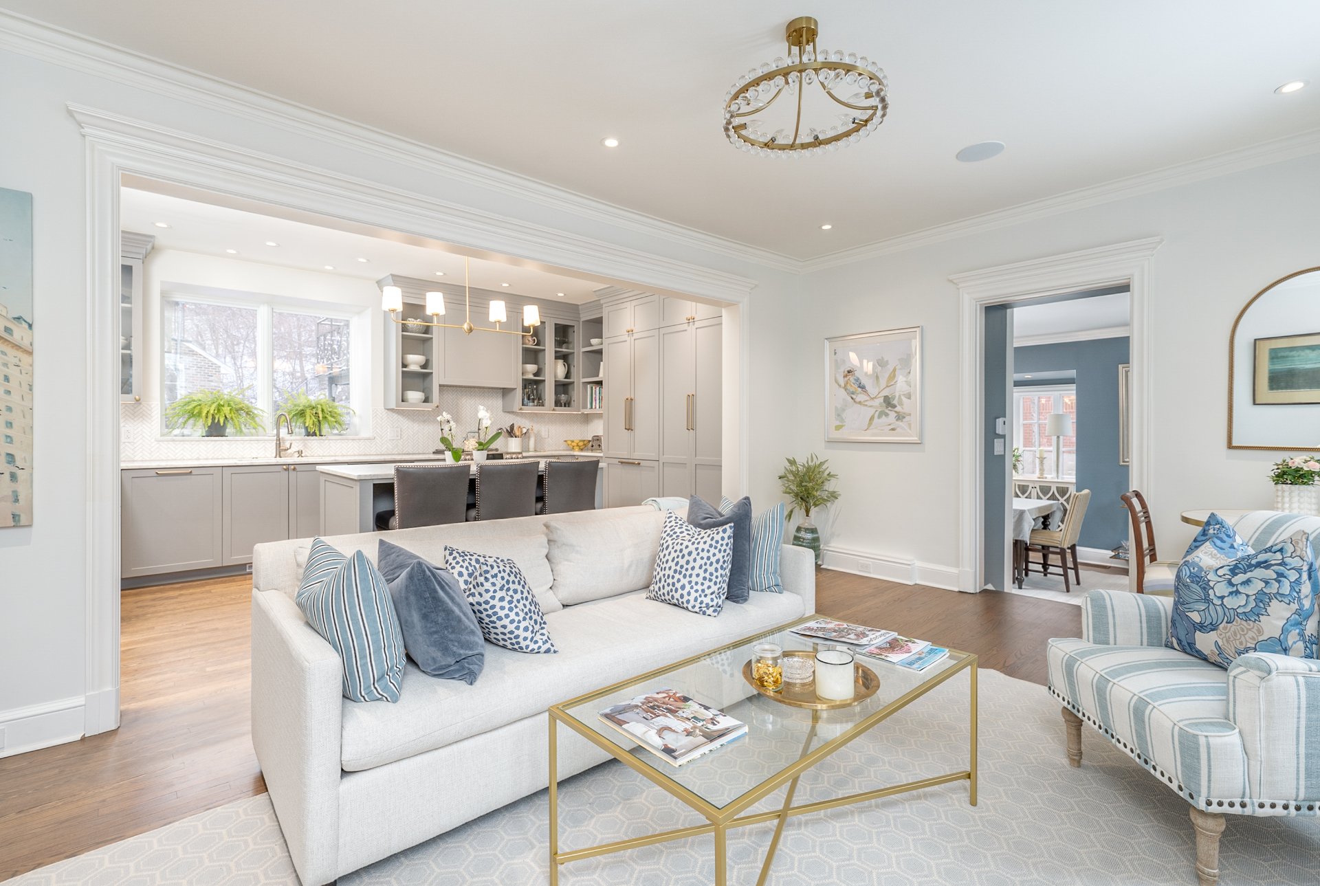 MAIN FLOOR-Classic cross-hall layout with reconfigured flow between kitchen and dining areas -Living room with fireplace and French doors opening to the beautifully manicured stone interior courtyard-Custom kitchen with integrated family lounge area and updated finishes -Formal separate dining room with large windows and second fireplace adjacent to the kitchen, ideal for elegant hosting -Heated flooring in key areas and refined architectural details throughout