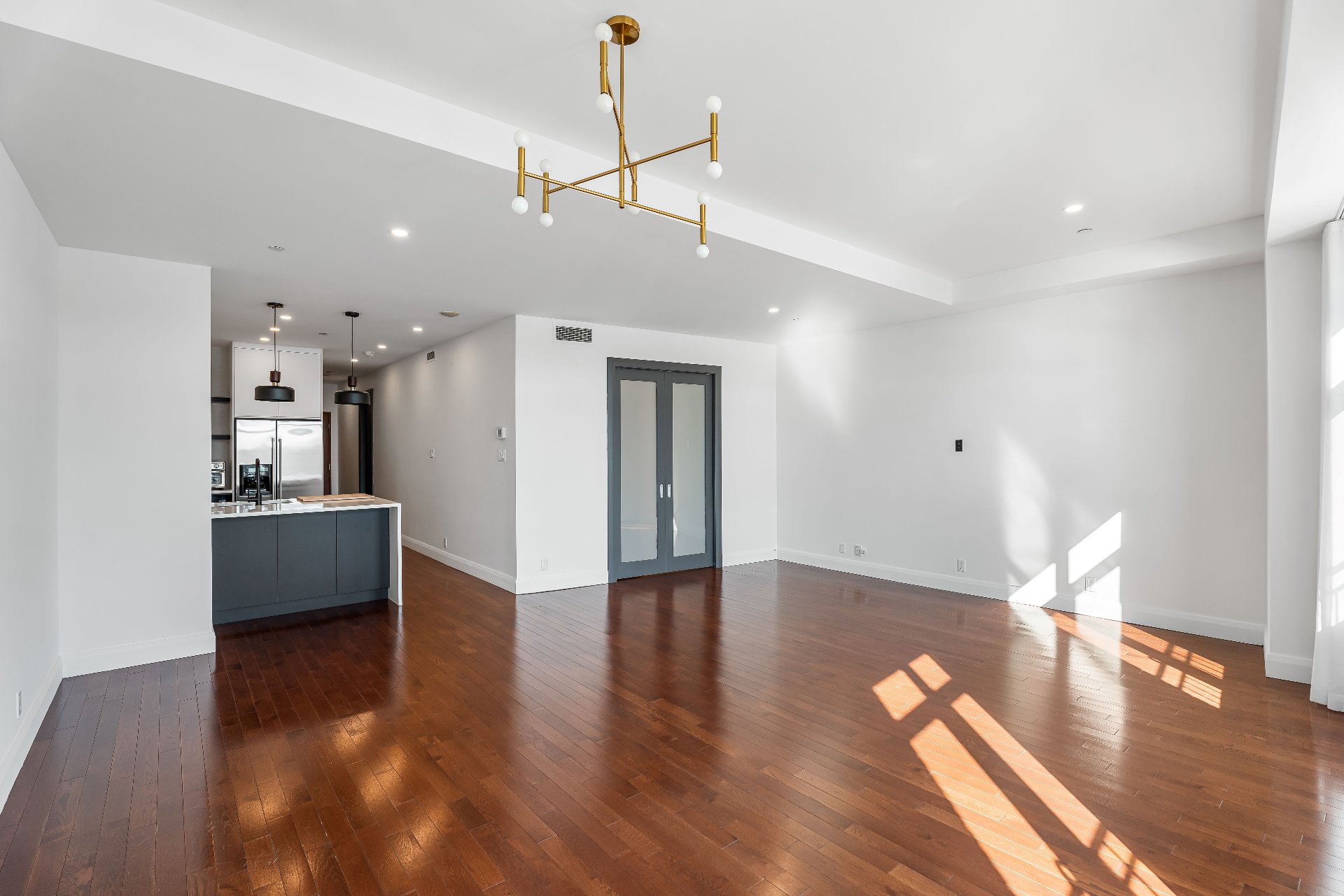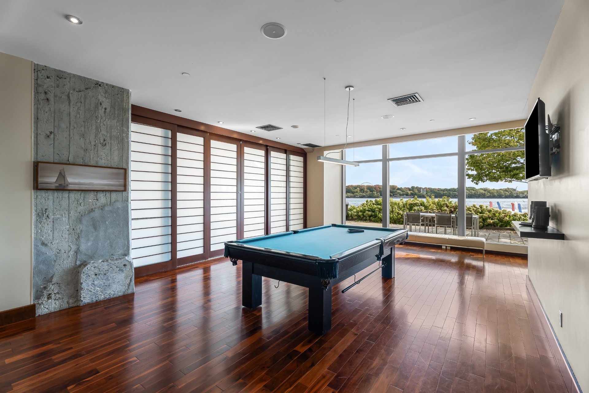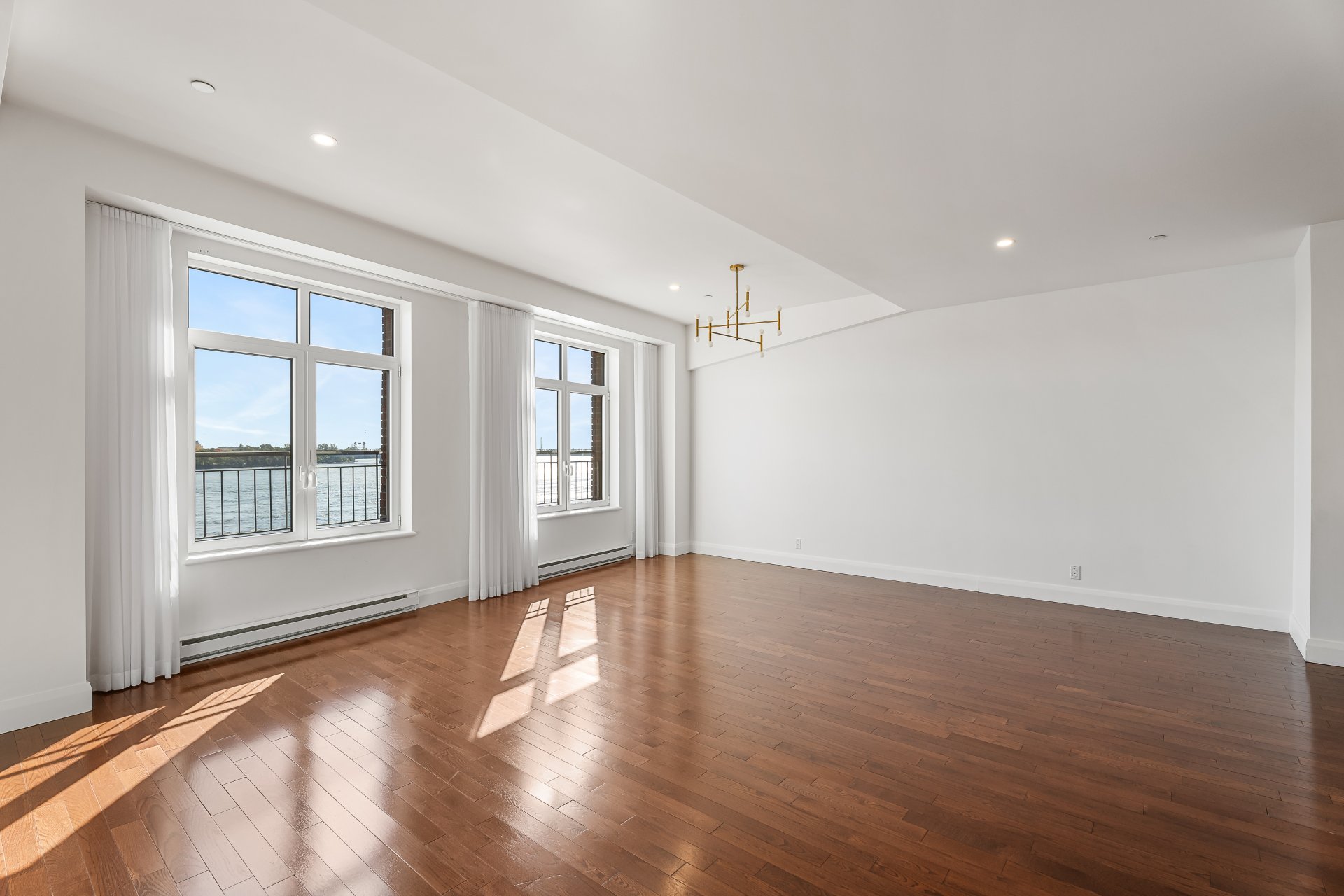 -Open living space with water views: Generous layout combining living, dining and kitchen areas, enhanced by large windows overlooking the river.