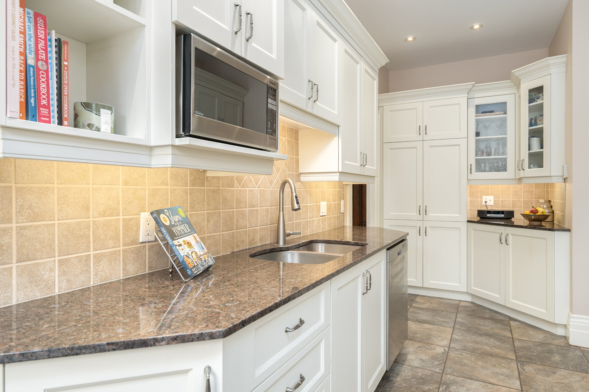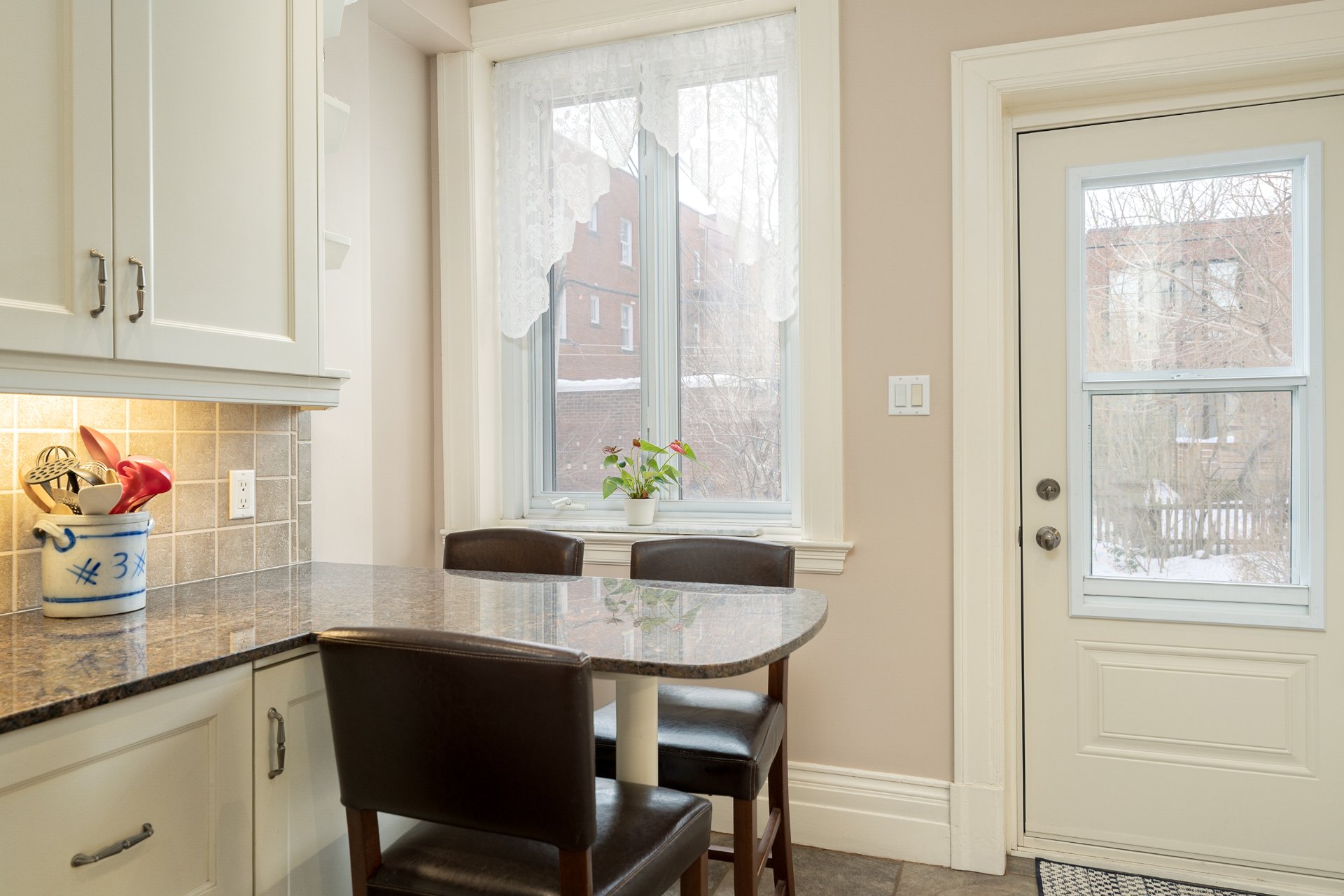 MAIN FLOOR (Ceiling height: 9'4")-Generous living room with marble fireplace and oversized windows-Formal dining room with preserved wood trim and high ceilings-Renovated kitchen with granite countertops, ample cabinetry and breakfast counter-Powder room-Access to large covered rear terrace and backyard