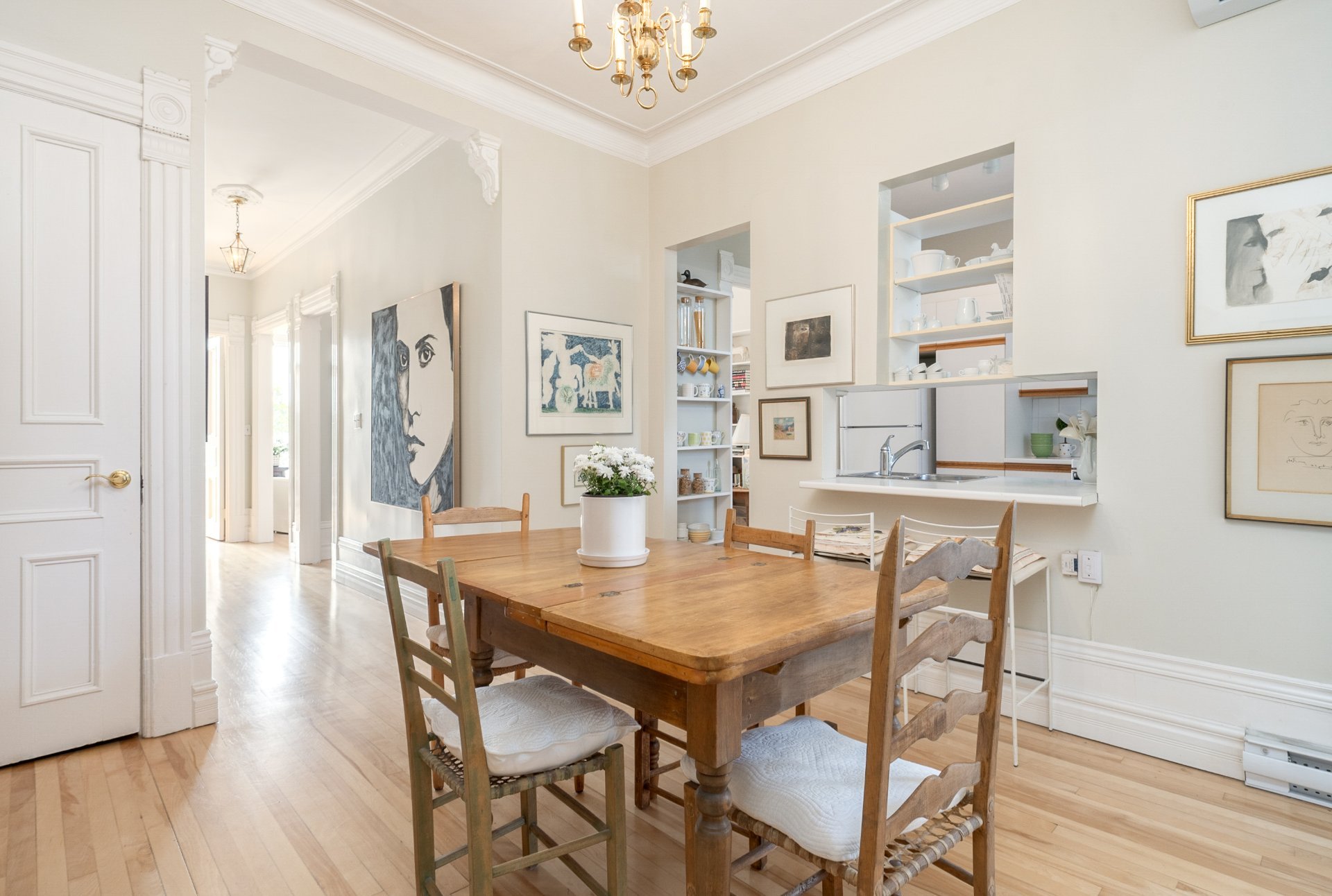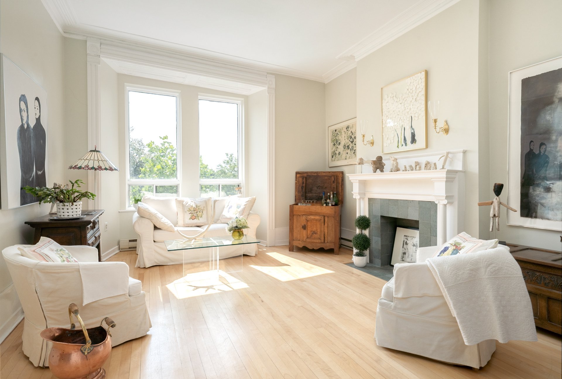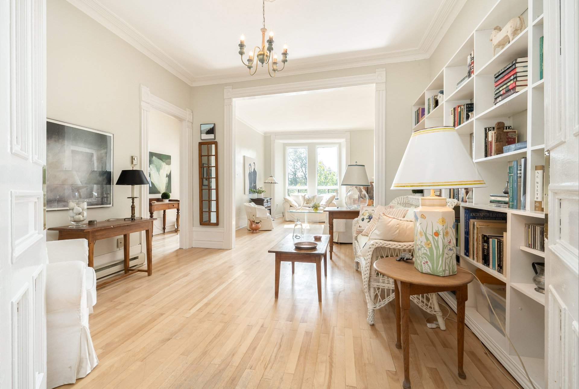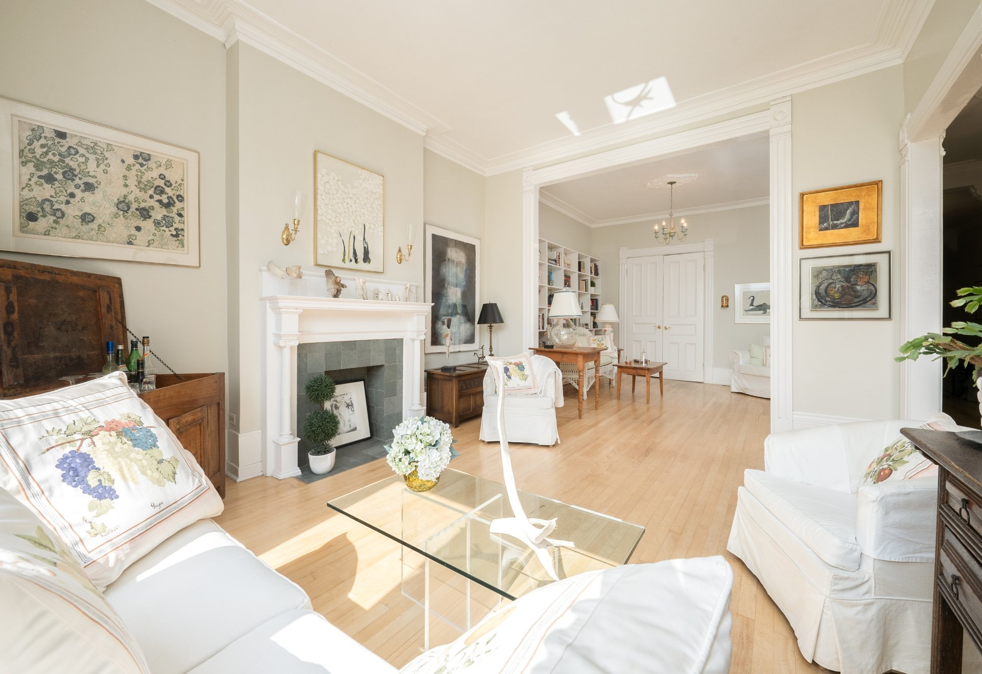 CONDO HIGHLIGHTS-1,651 SF of living space-Expansive main living area with two living rooms, featuring large windows, a fireplace, built-in bookshelves, crown moldings, and blond hardwood floors-Kitchen, adjacent to the living room, can be conveniently enclosed with French doors-Bright kitchen with a large window and charming breakfast nook-Dining room opens onto a side balcony-4 bedrooms, one with a private balcony overlooking the park-2 central bathrooms, one with a bathtub-Wall-mounted air conditioning -Condo fees: 203$/month