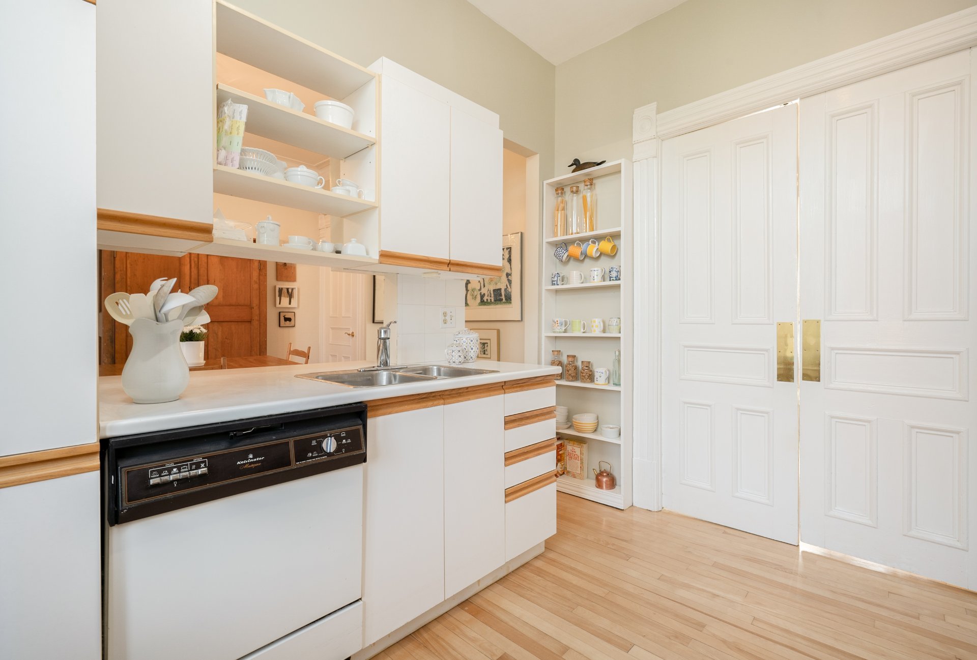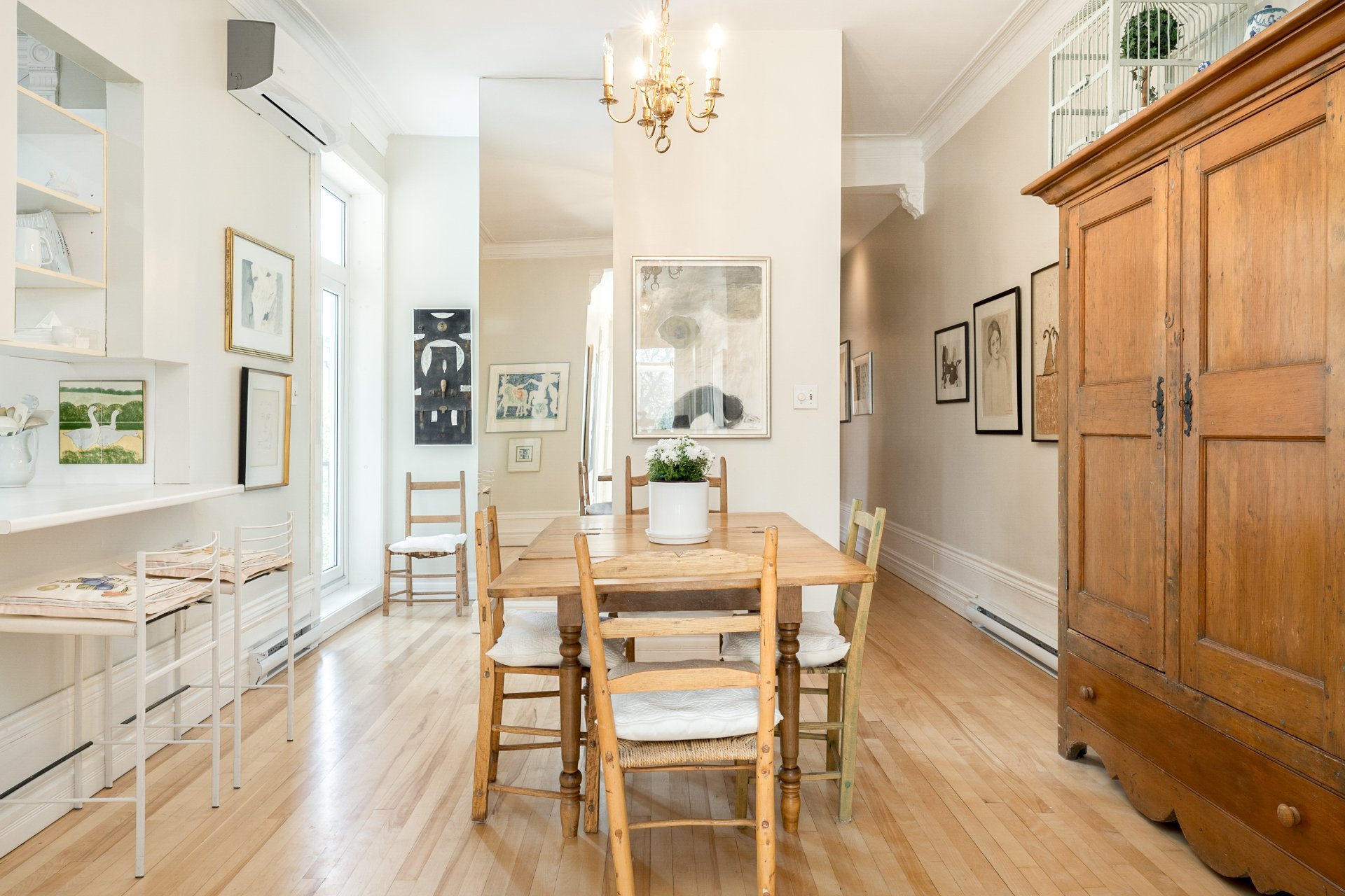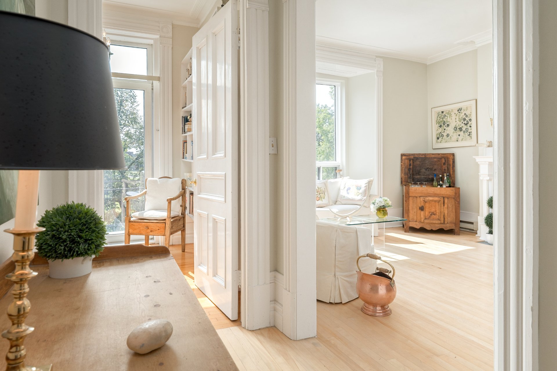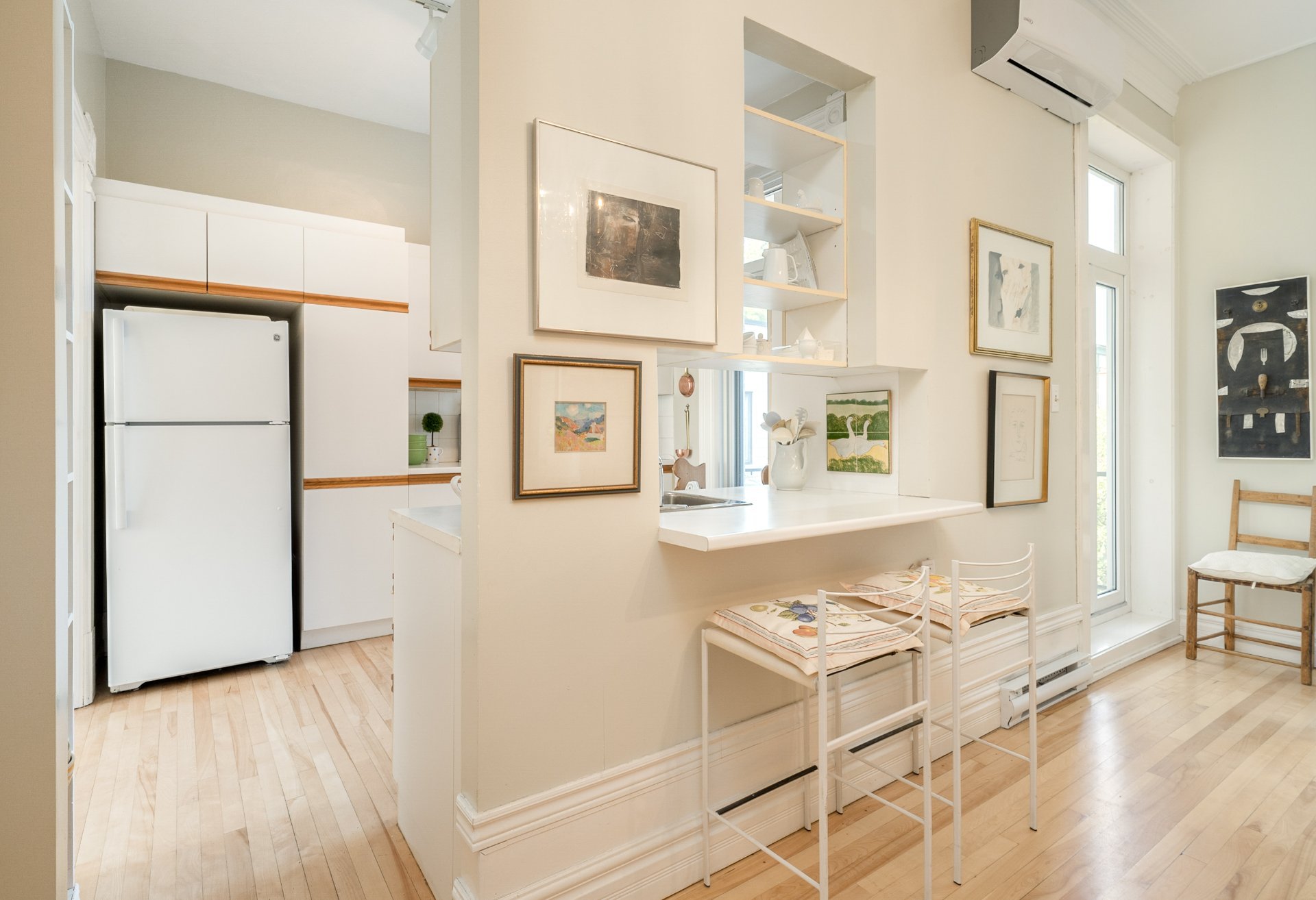 CONDO HIGHLIGHTS-1,651 SF of living space-Expansive main living area with two living rooms, featuring large windows, a fireplace, built-in bookshelves, crown moldings, and blond hardwood floors-Kitchen, adjacent to the living room, can be conveniently enclosed with French doors-Bright kitchen with a large window and charming breakfast nook-Dining room opens onto a side balcony-4 bedrooms, one with a private balcony overlooking the park-2 central bathrooms, one with a bathtub-Wall-mounted air conditioning -Condo fees: 203$/month
